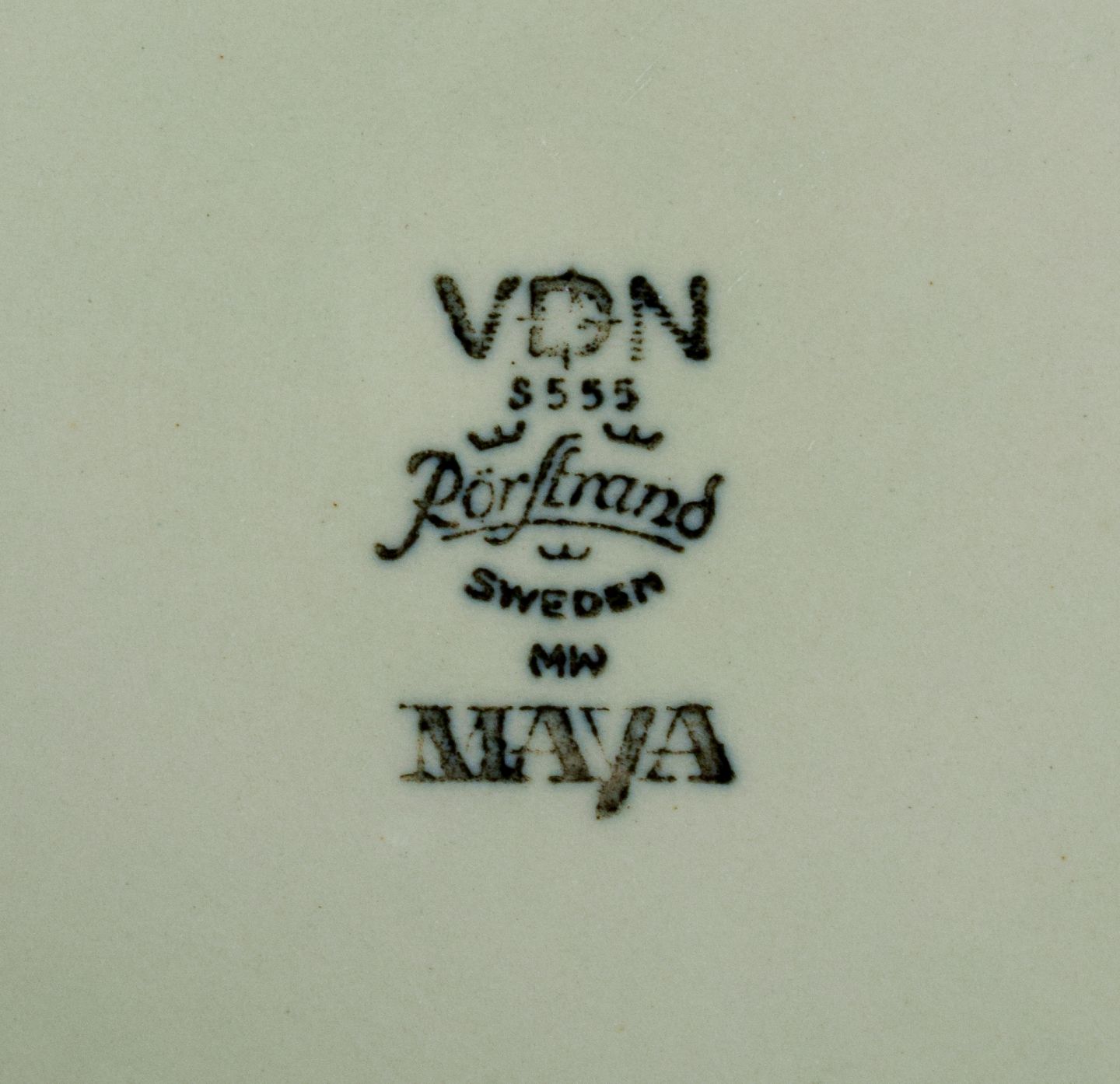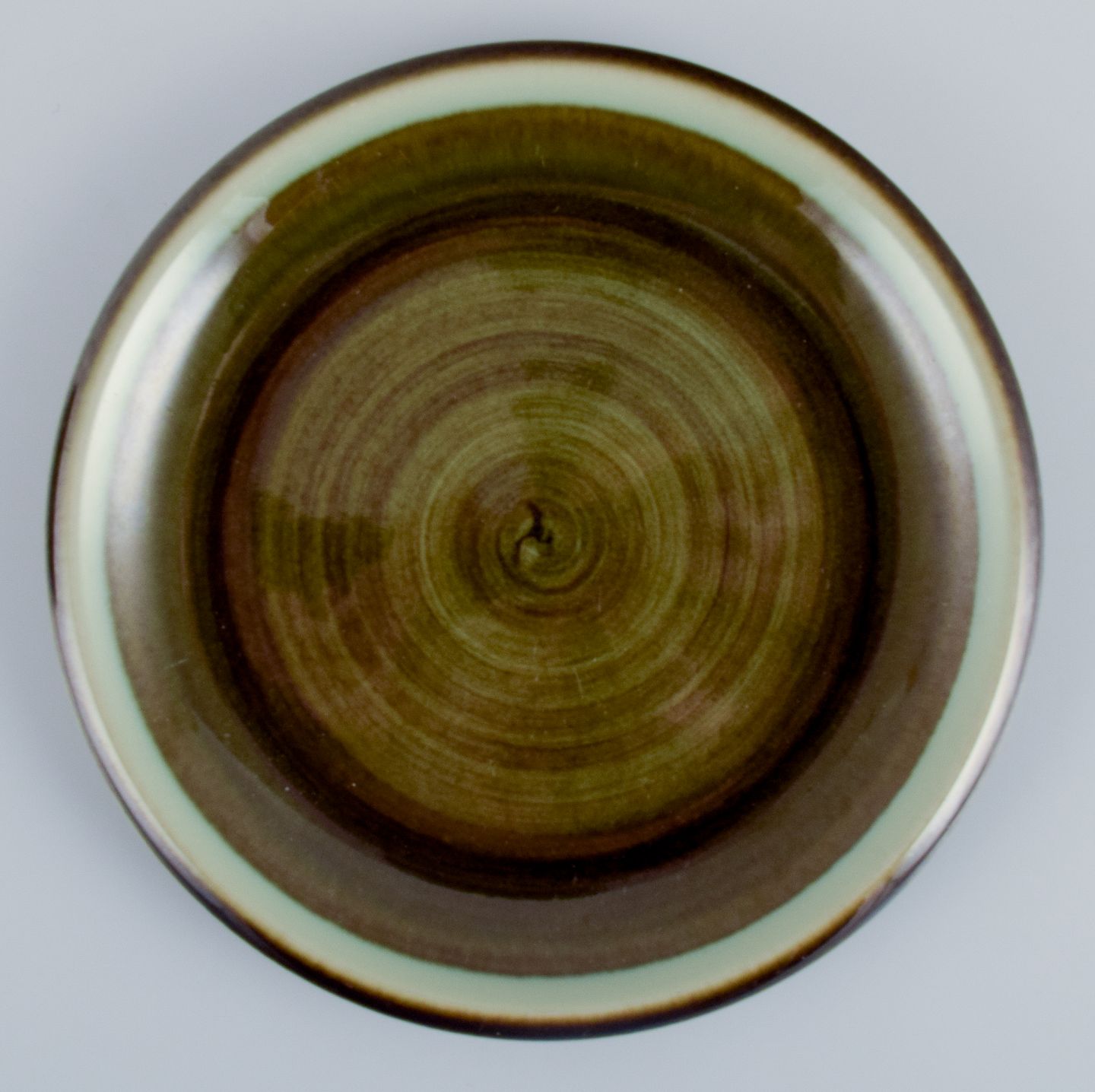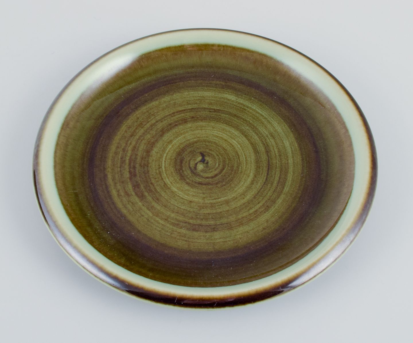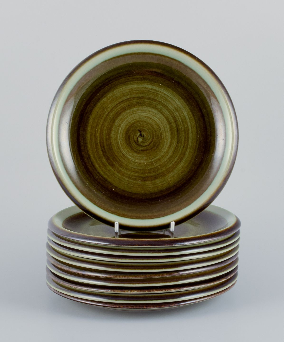 Marianne Westman for Rörstrand, ”Maya”, et sæt på ti tallerkner med glasur i grønne nuancer. Ca. 1970. Stemplet. Perfekt stand. Første sortering. Mål: D 19,0 cm.