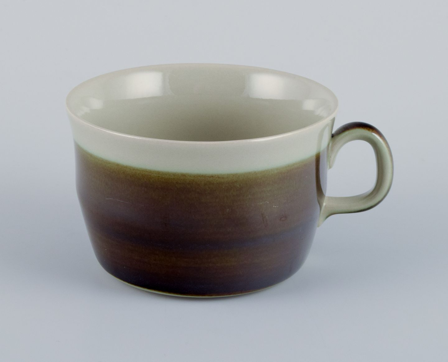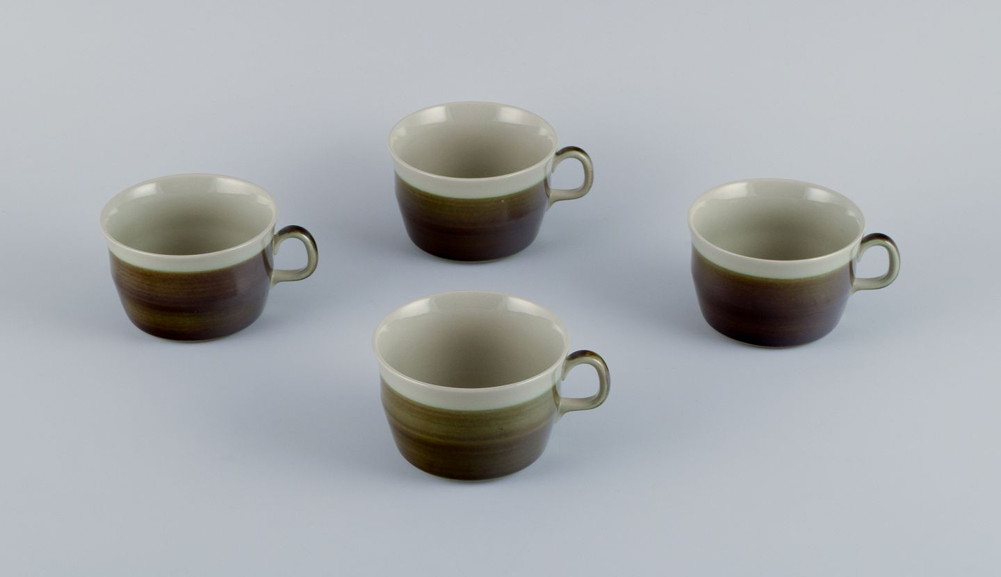 Marianne Westman for Rörstrand, ”Maya”, et sæt på fire kaffekopper i stentøj med grønbrunlig glasur. Ca. 1970. Stemplet. Perfekt stand. Første sortering. Mål: H 6,4 cm. x D 9,6 cm. uden hank.