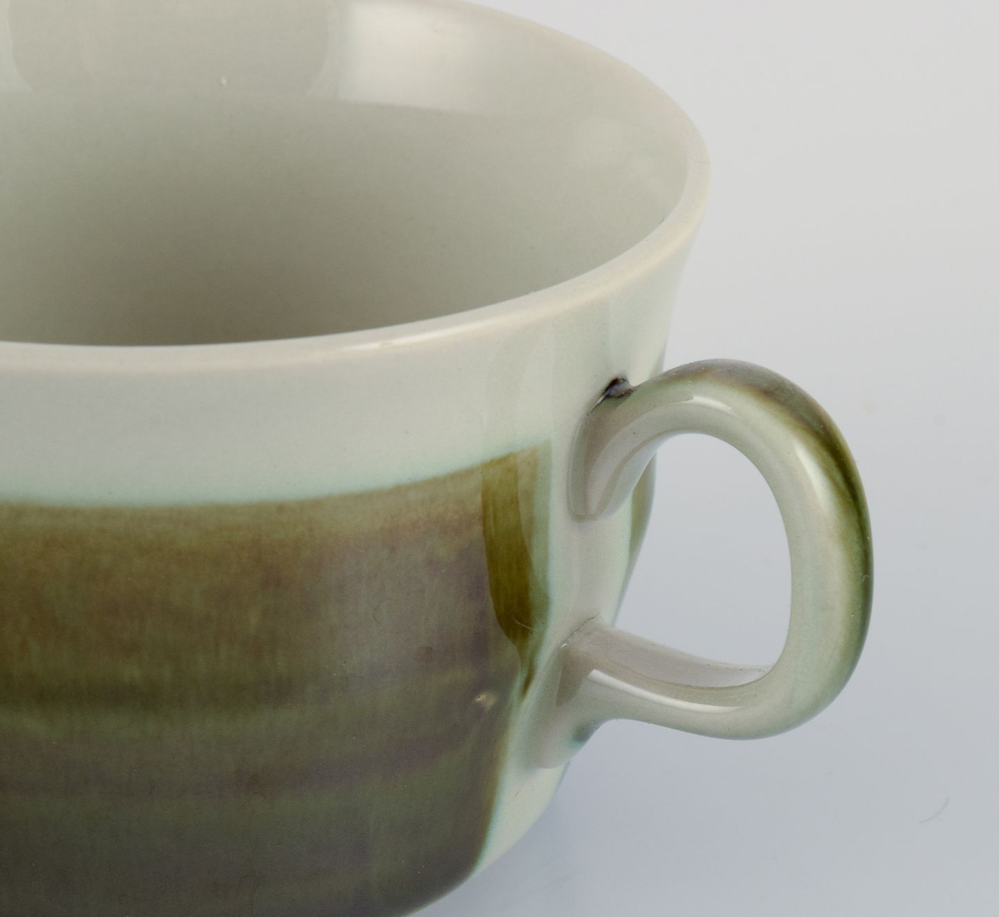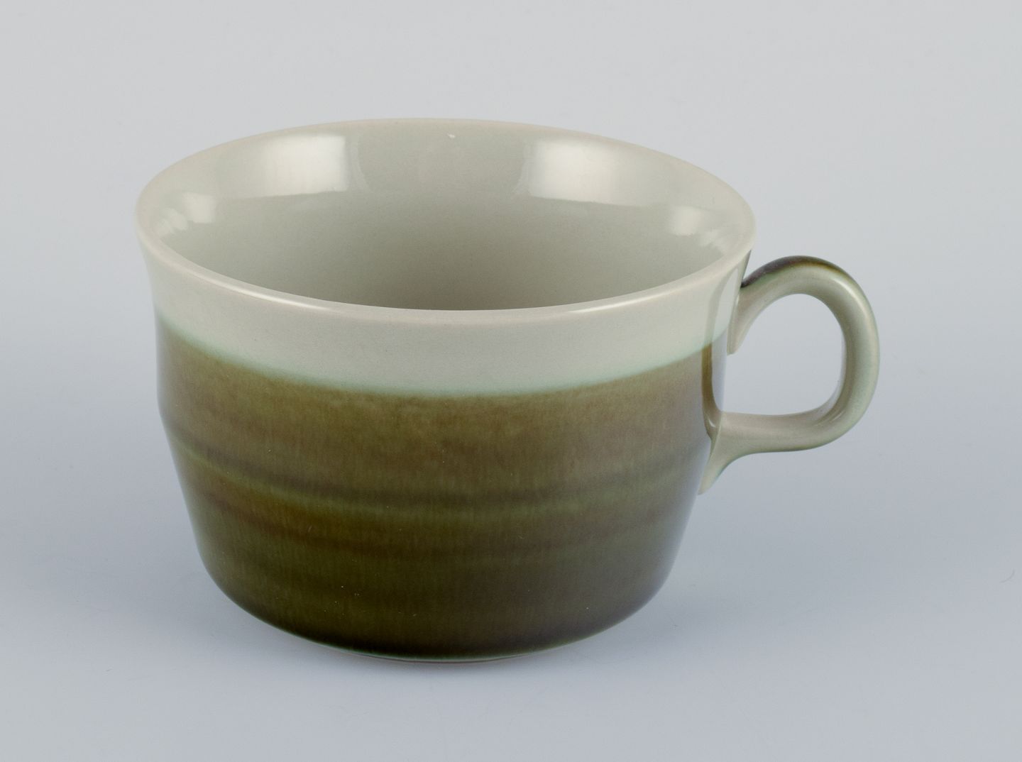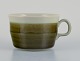 Marianne Westman for Rörstrand, ”Maya”, et sæt på seks kaffekopper i stentøj med grønbrunlig glasur. Ca. 1970. Stemplet. Perfekt stand. Første sortering. Mål: H 6,4 cm. x D 9,6 cm. uden hank.