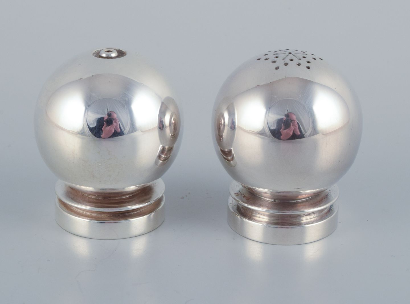 Harald Nielsen for Georg Jensen. Et par Pyramide salt og peberbøsser i sterlingsølv. Model 632. 1945-1951 stempel. I perfekt stand. Mål: H 4,3 cm. x D 3,5 cm.