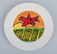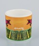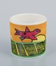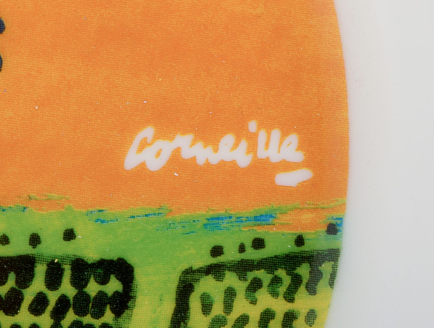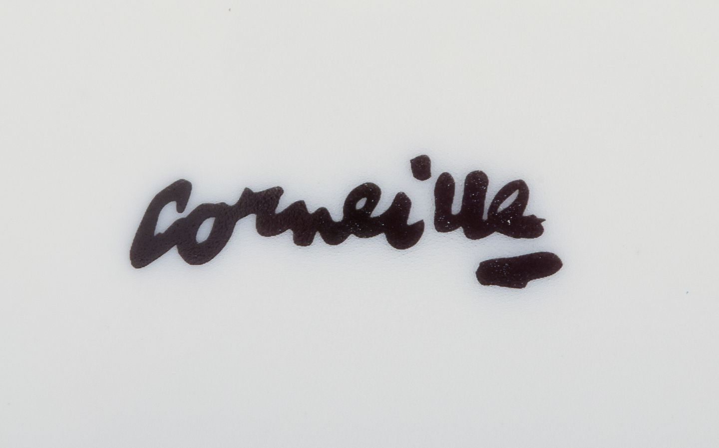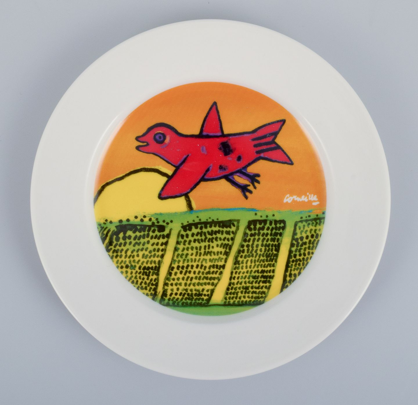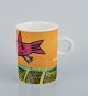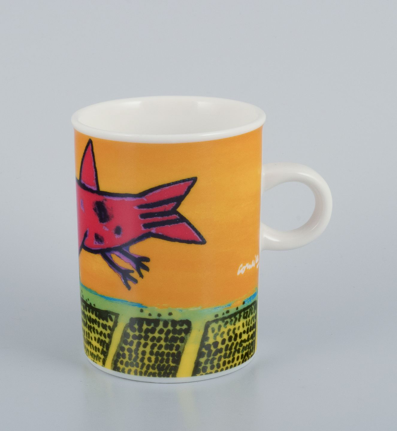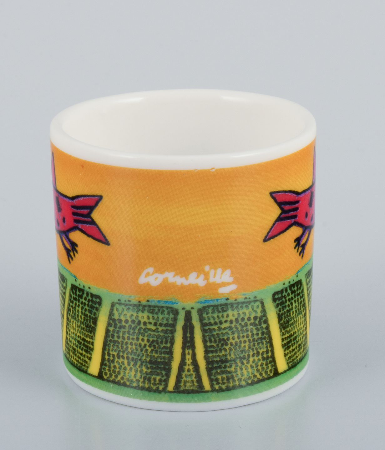 Corneille (Guillaume Cornelis van Beverloo), Dutch CoBrA artist (1922-2010). Coffee cup, plate, and egg cup in porcelain decorated with birds over a field in sunrise.
