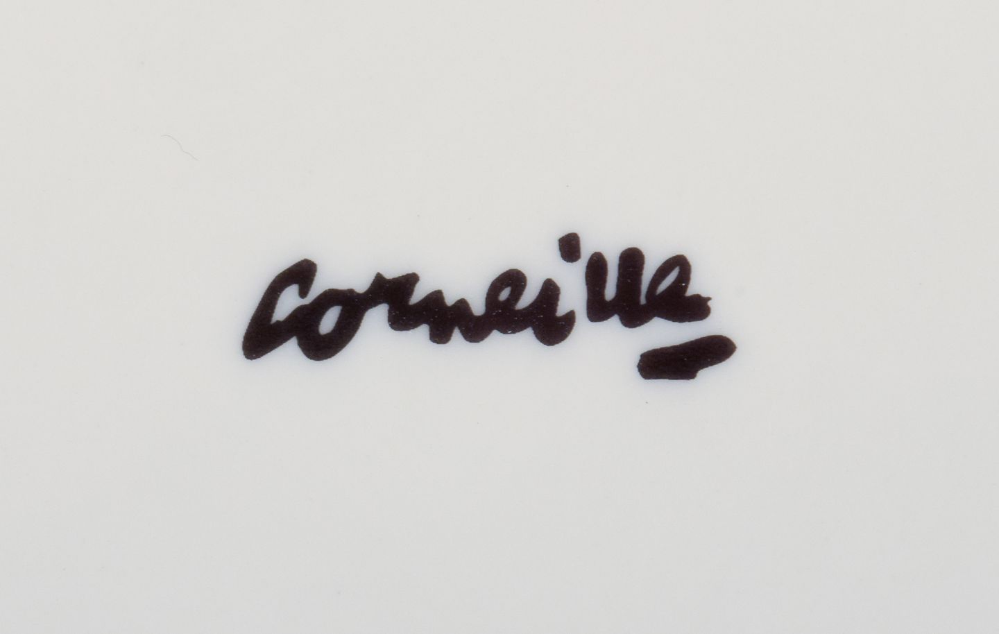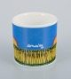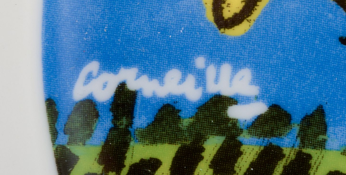 Corneille (Guillaume Cornelis van Beverloo), Hollandsk CoBrA kunstner (1922-2010). Kaffekop, tallerken og æggebæger i porcelæn dekoreret med fugle over mark med solopgang.