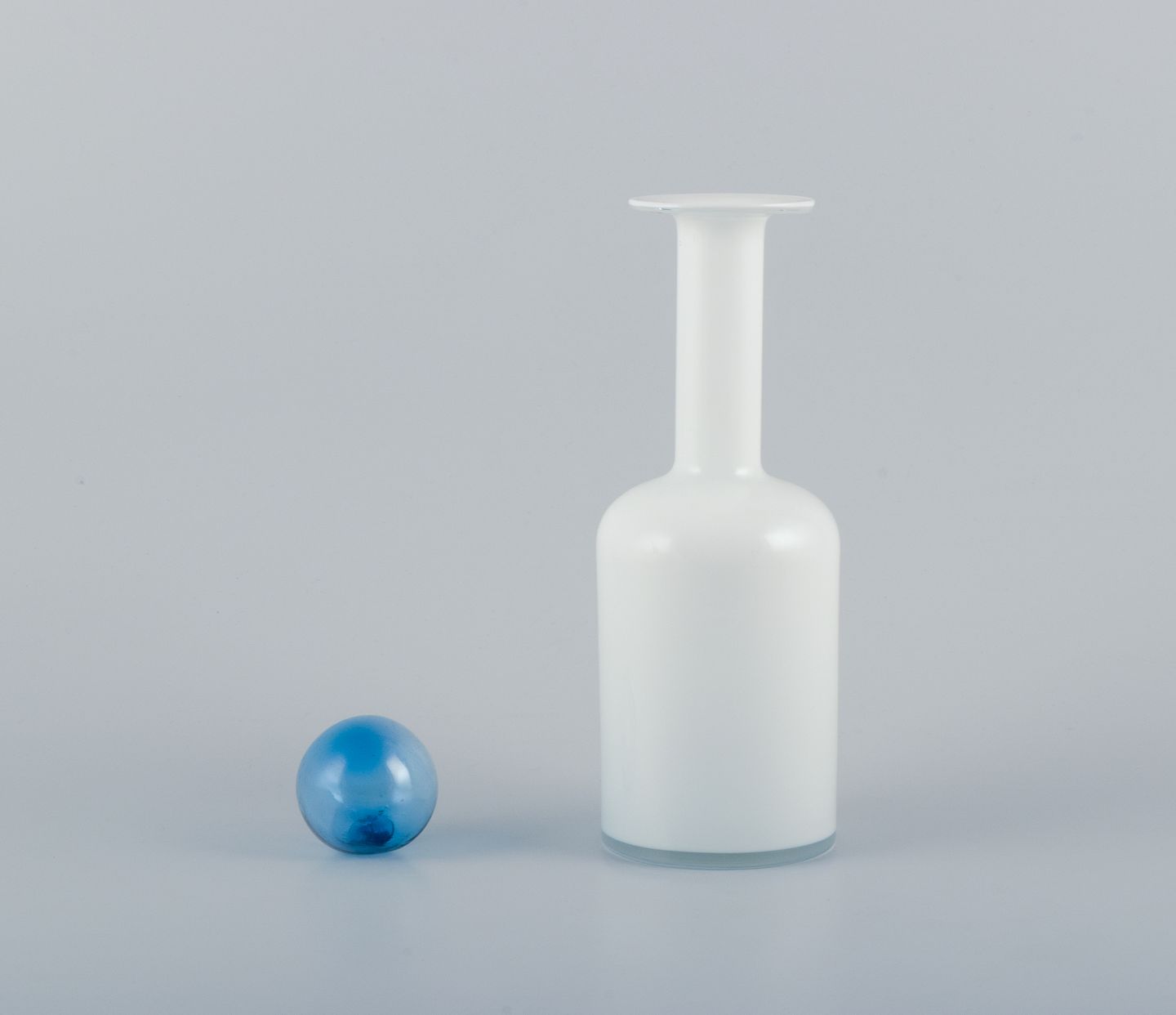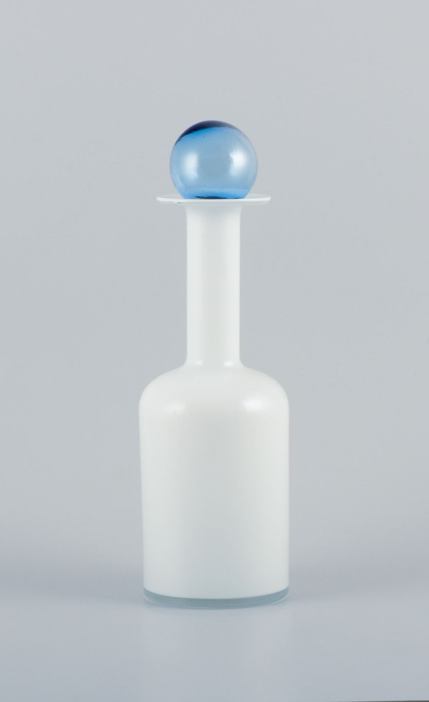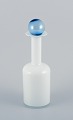 Otto Brauer for Holmegaard. Vase/bottle in white mouth-blown art glass with a light blue sphere. 1960s. Remnants of a label. In perfect condition. Dimensions: Height 30.5 cm (with sphere) x Width 8.5 cm.