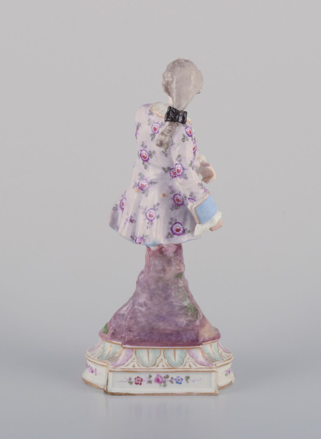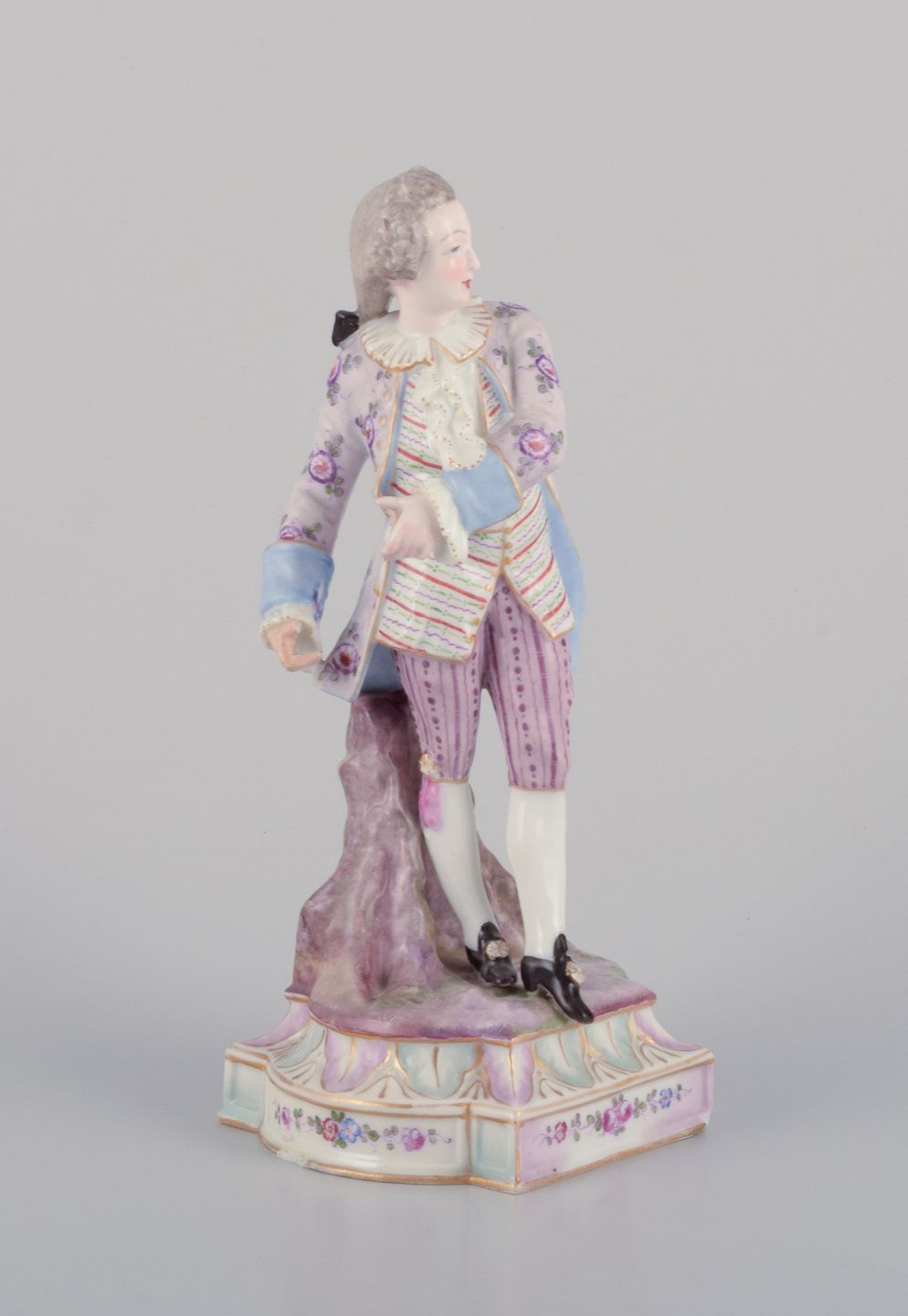 Antik tysk porcelænsfigur. Stor figur af ung mand i fine klæder. Håndmalet i polykrome farver.