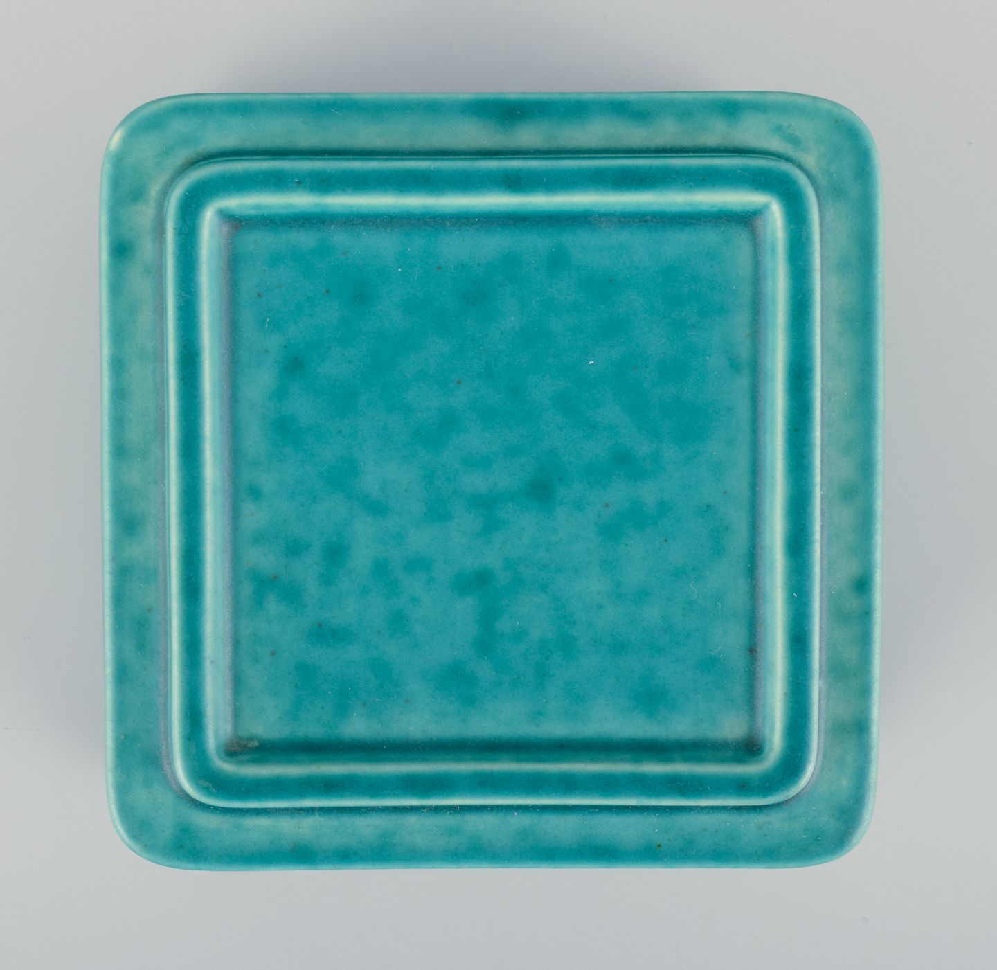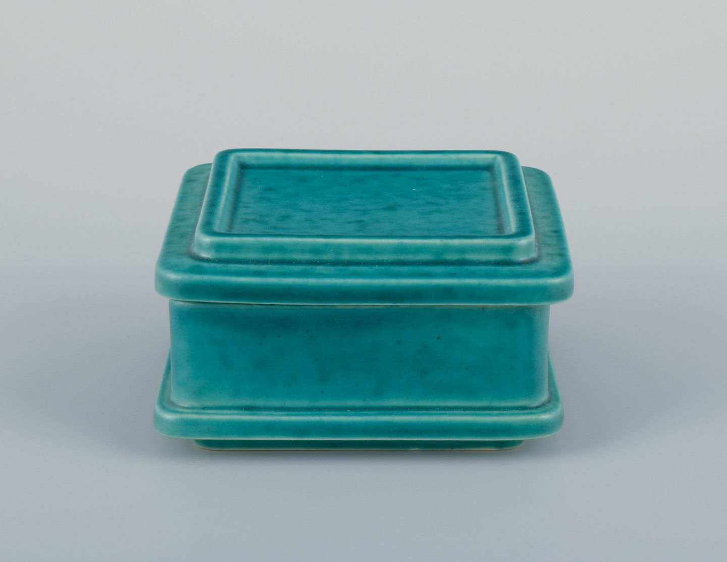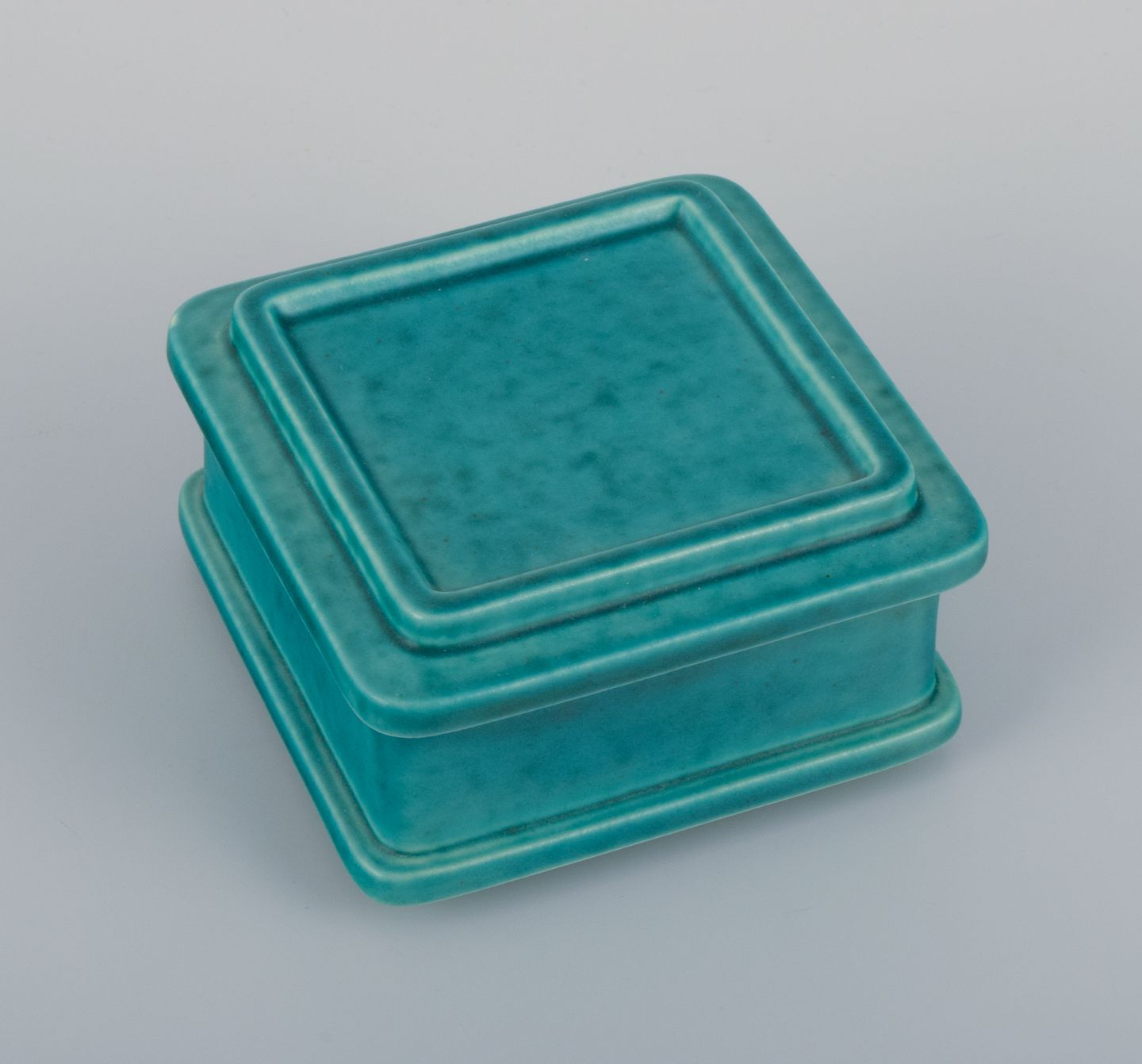 Wilhelm Kåge (1889-1960) for Gustavsberg, Sweden. Square Art Deco lidded box in ceramic with classic green glaze. From the Argenta series.