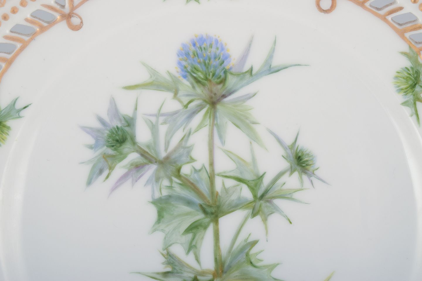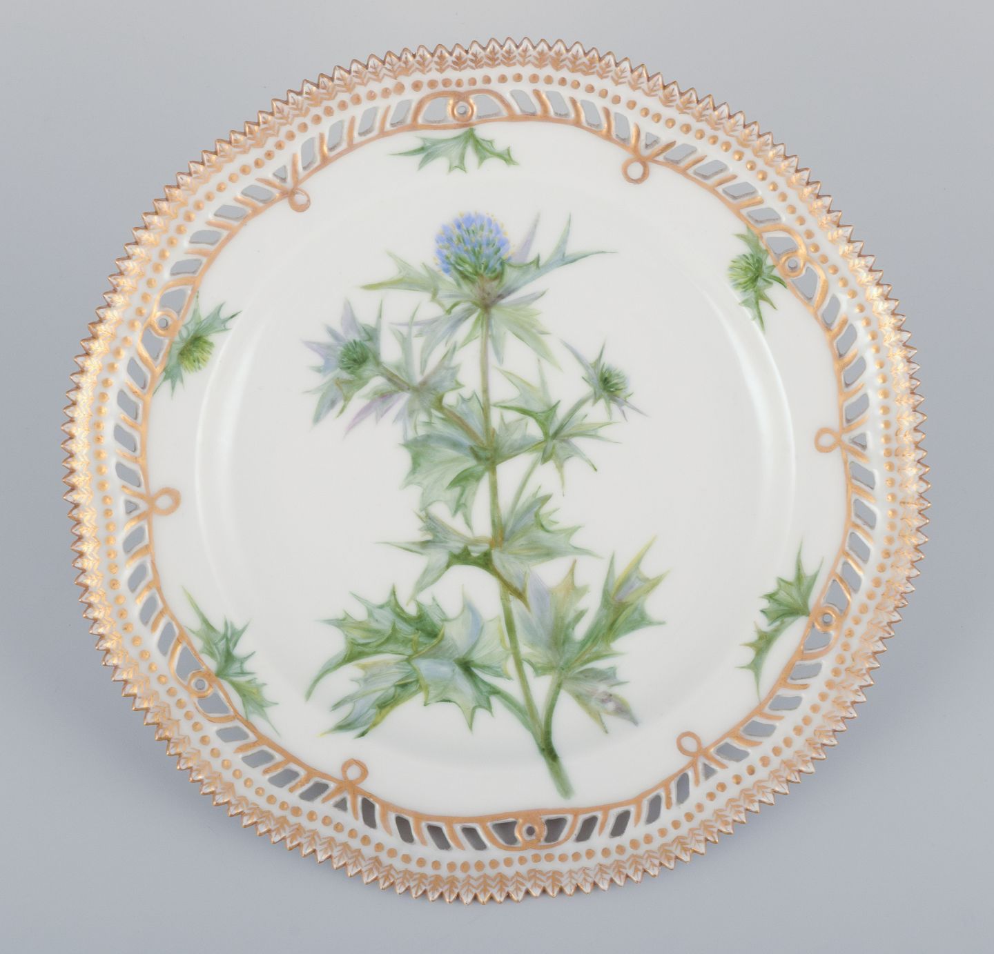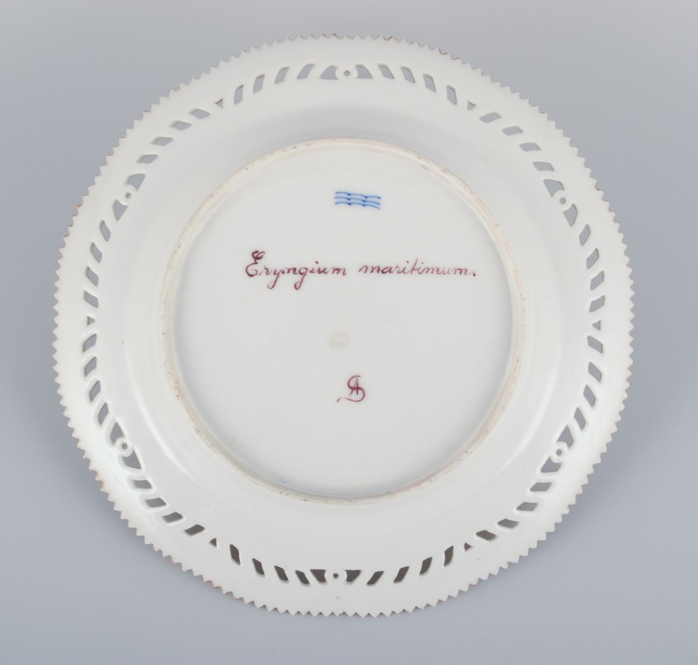Royal Copenhagen Flora Danica, open lace lunch plate. Latin text. Decorated outside the factory. Early 20th c. Marked. Perfect condition. Second factory quality. Diameter 21.8 cm.