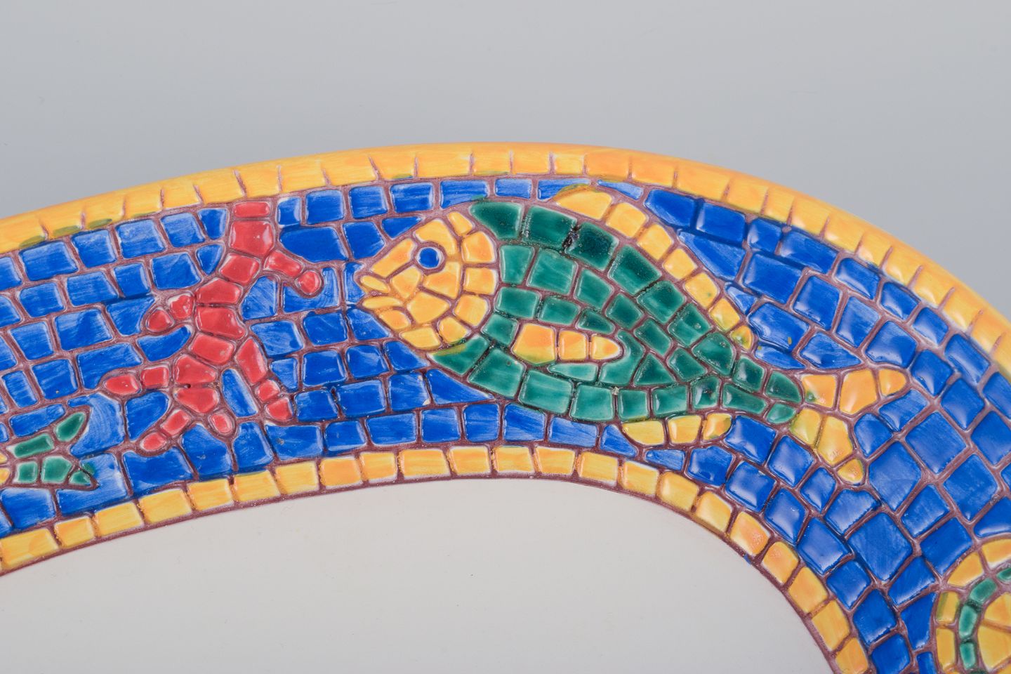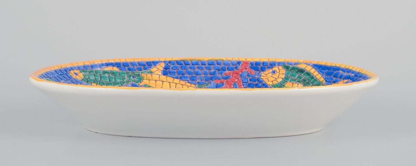 Vietri, Italien, tre store dybe tallerkner og aflangt fad i keramik. Fisk og skaldyrsmotiver.
