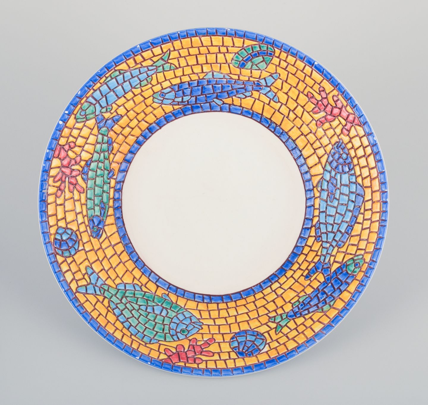 Vietri, Italy. Set of three large deep plates and a rectangular dish in ceramic. Decorated with fish and sea motifs in a mosaic-like pattern.
