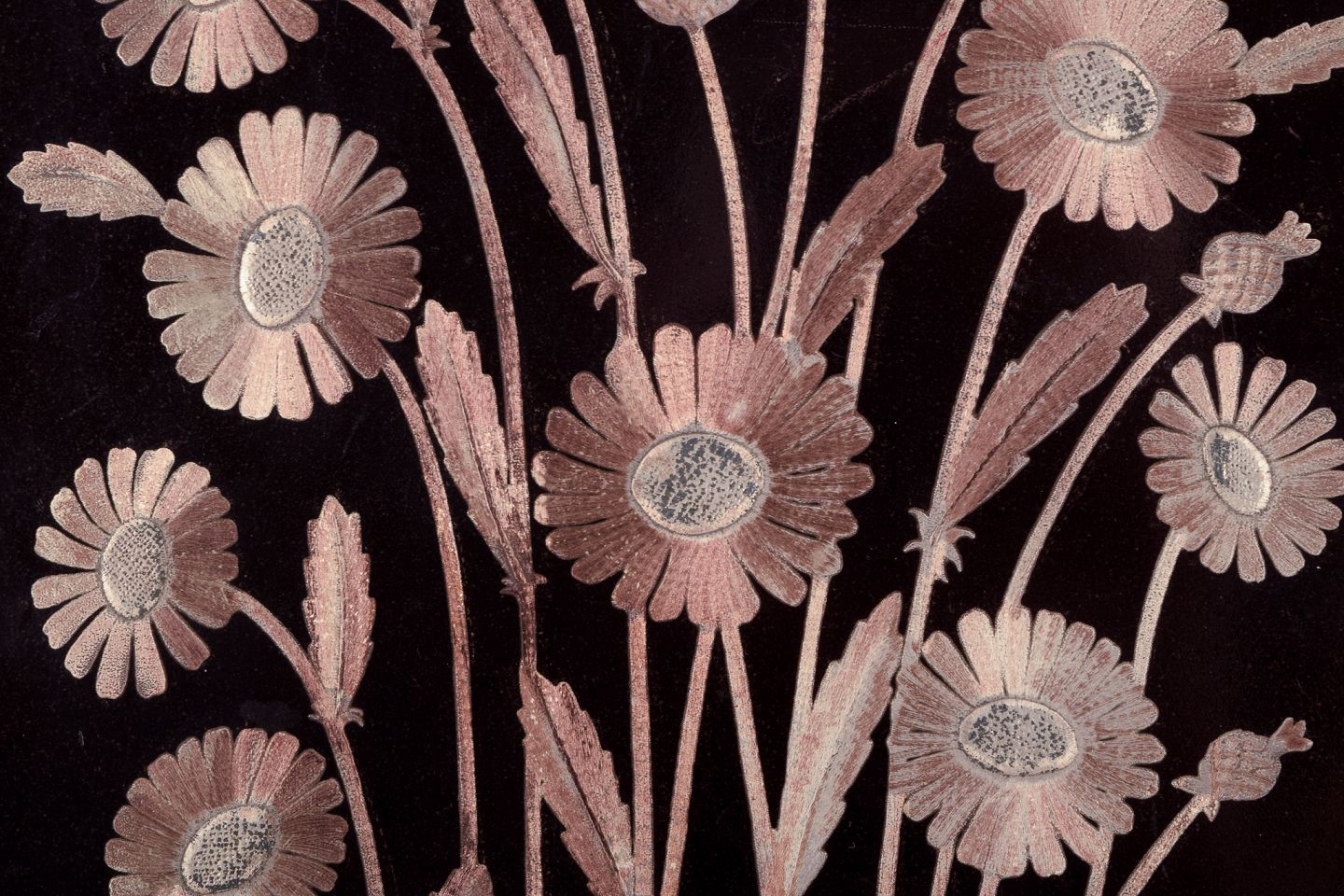 Heinz Erret for Gustavsberg, Sverige. Stort keramikrelief. Blomstermotiv dekoreret i sølv. Blomst ”Prästkrage” (tusindfryd).