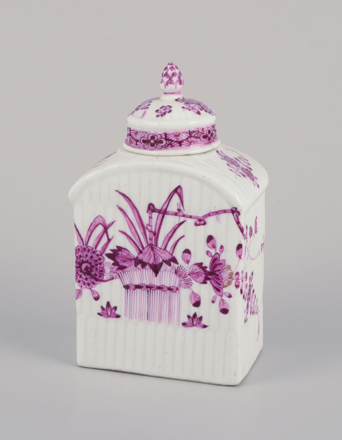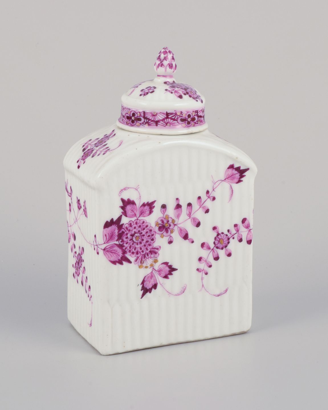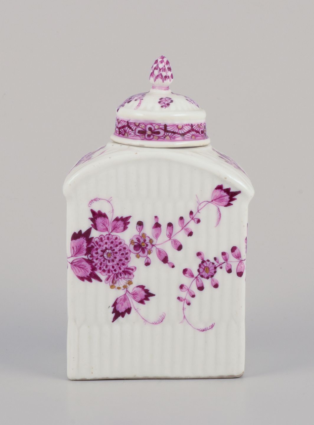 Meissen, Germany. Antique tea caddy hand-painted in purple decoration. Approximately from the 1800s. Marcolini mark. In perfect condition. Dimensions: Width 7.5 cm x Depth 5.0 cm x Height 12.5 cm.