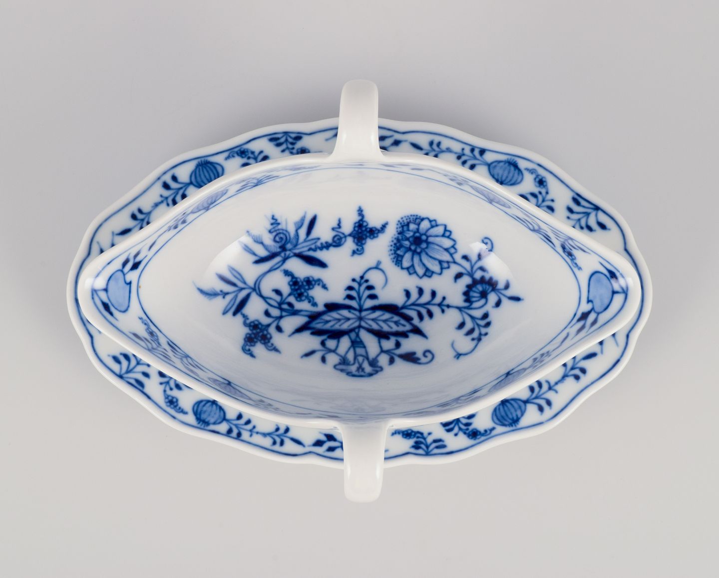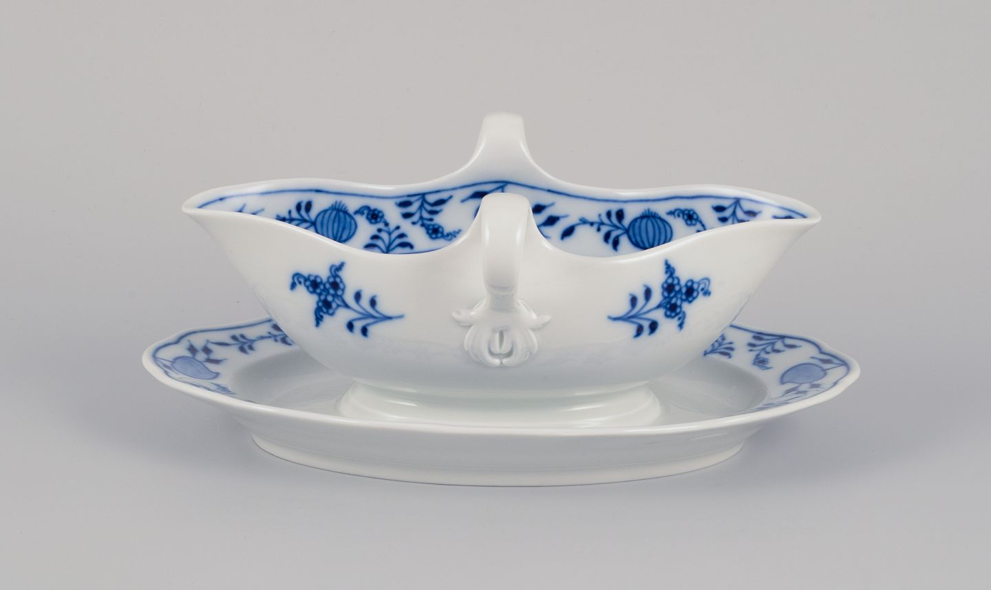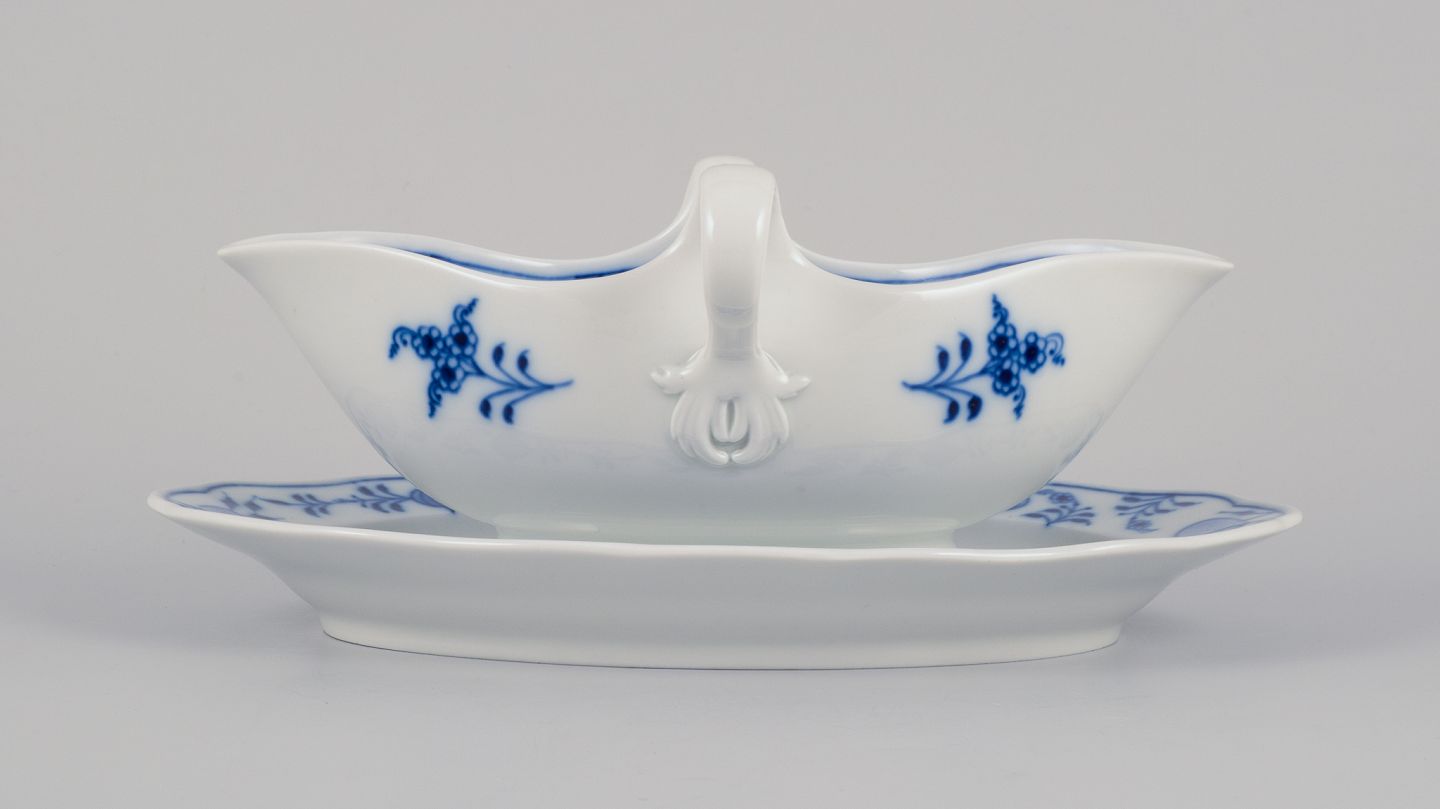 Meissen, Tyskland. Løgmønstret saucekande med to hanke. Håndmalet. Ca. 1930’erne. Stemplet. Første sortering. Perfekt stand. Mål: L 24,0 cm. x B 14,0 cm. x H 9,8 cm.