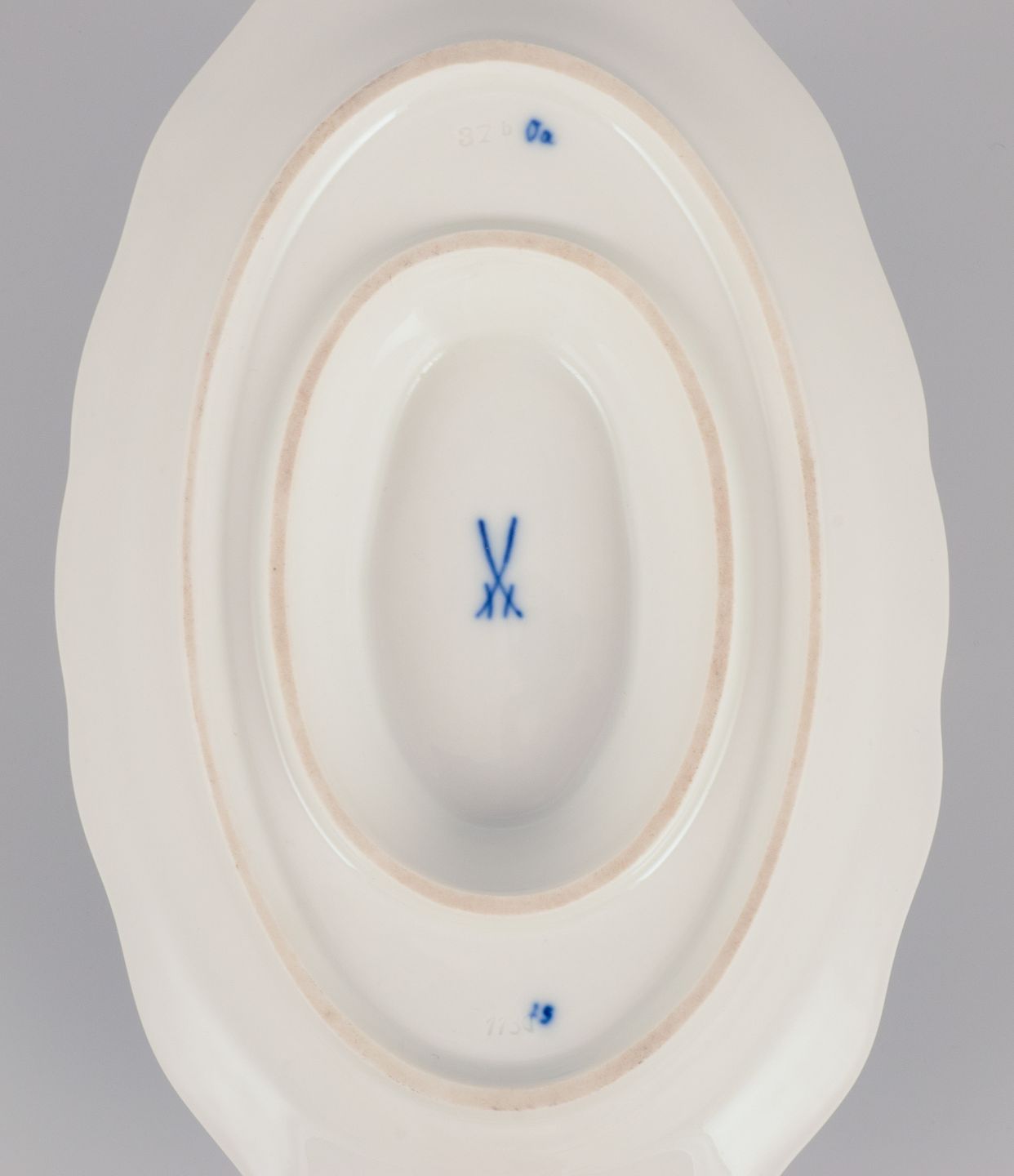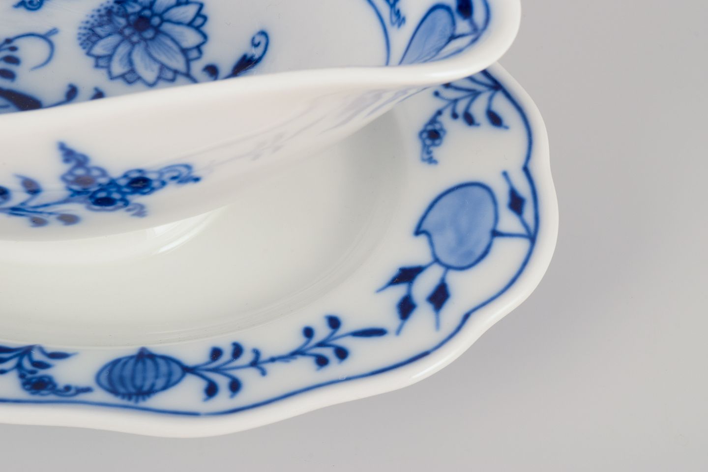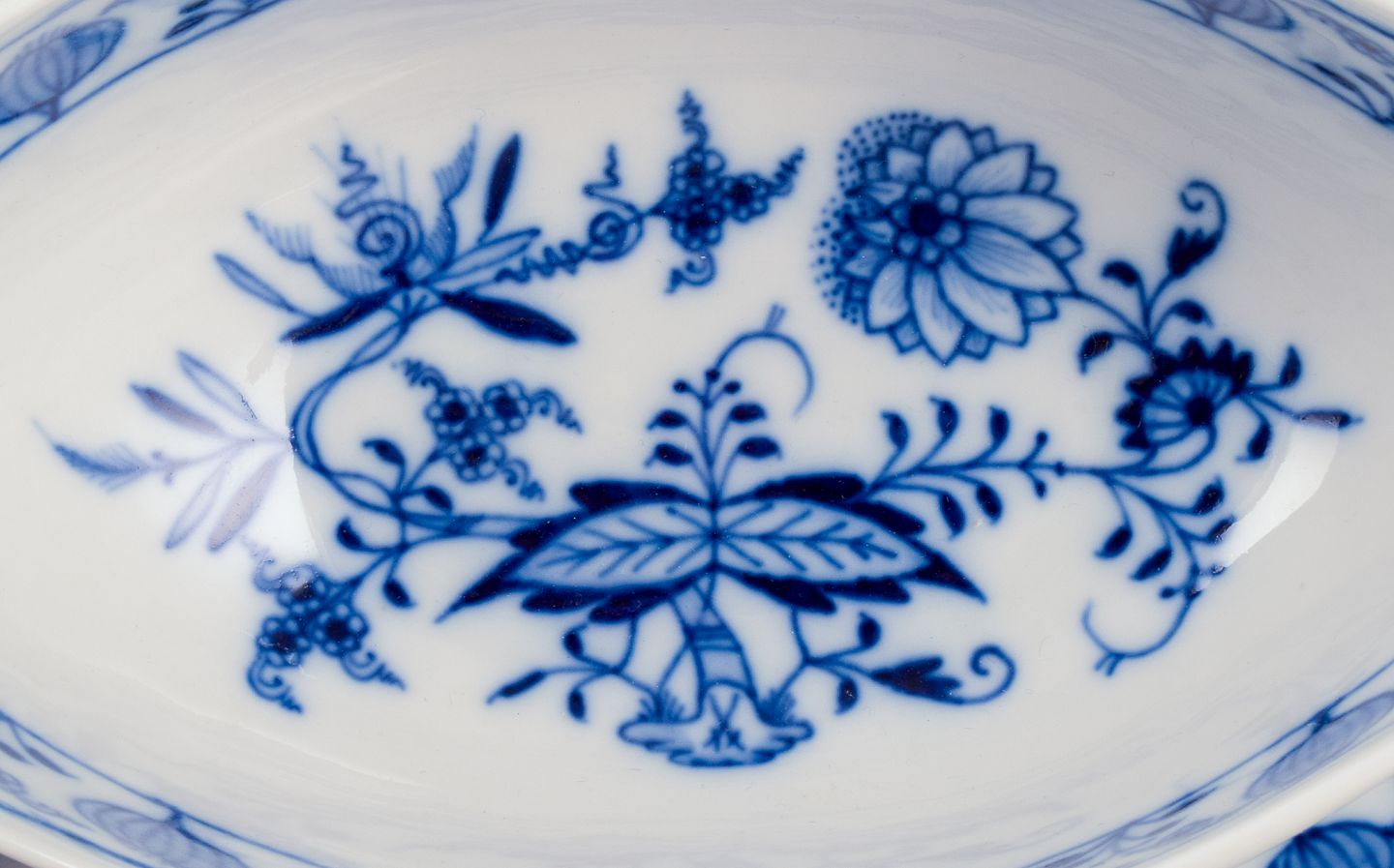 Meissen, Tyskland. Løgmønstret saucekande med to hanke. Håndmalet. Ca. 1930’erne. Stemplet. Første sortering. Perfekt stand. Mål: L 24,0 cm. x B 14,0 cm. x H 9,8 cm.