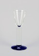 Margareta Hennix for Reijmyre, Sverige. Et sæt på fire snapseglas. Håndlavet og mundblæst kunstglas. Blå, gult og klart glas.
