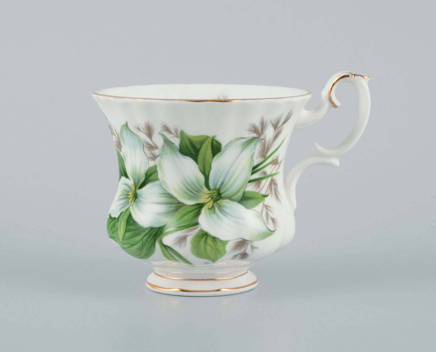 Royal Albert, England. Et sæt på fire ”Trillium” kaffekopper med tilhørende underkopper og kagetallerkner. Dekoreret med blomster og guldkant.