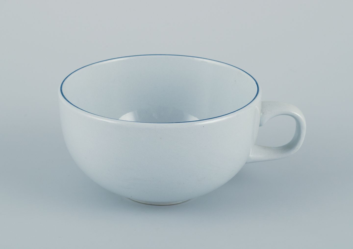 Grethe Meyer for Aluminia. Et sæt på fire Blåkant kaffekopper med tilhørende underkopper i fajance.