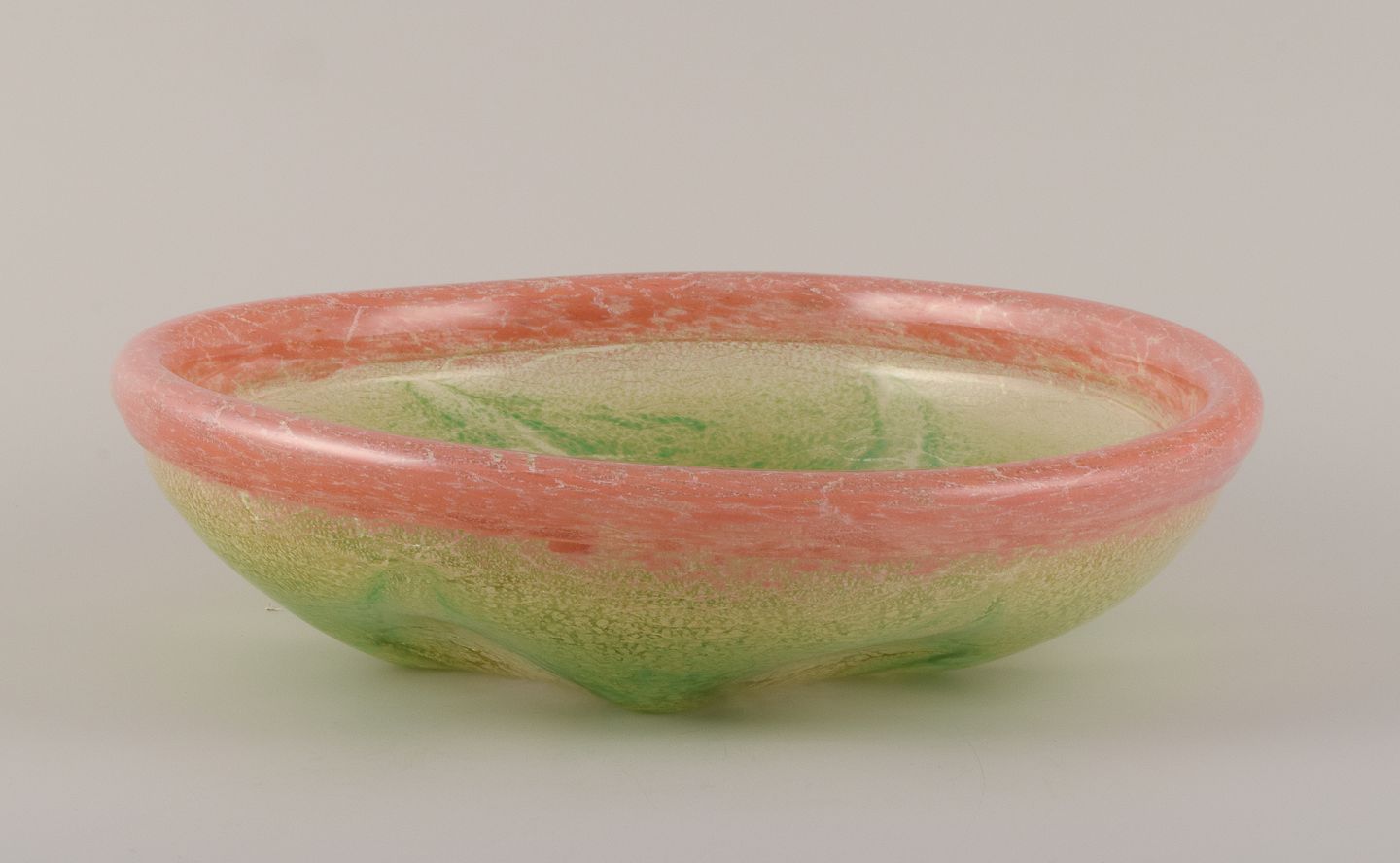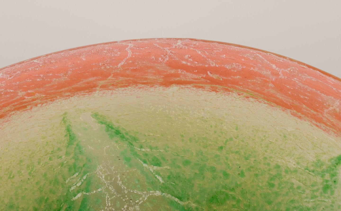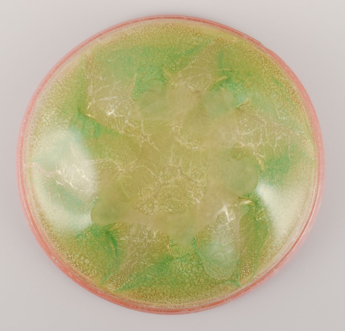 Karl Wiedmann for WMF, Tyskland, stor ”Ikora” kunstglas skål i æblegrønt og laksefarvet glas. Art Deco. Ca. 1920. I perfekt stand. Mål: D 28,5 x H 6,2 cm.