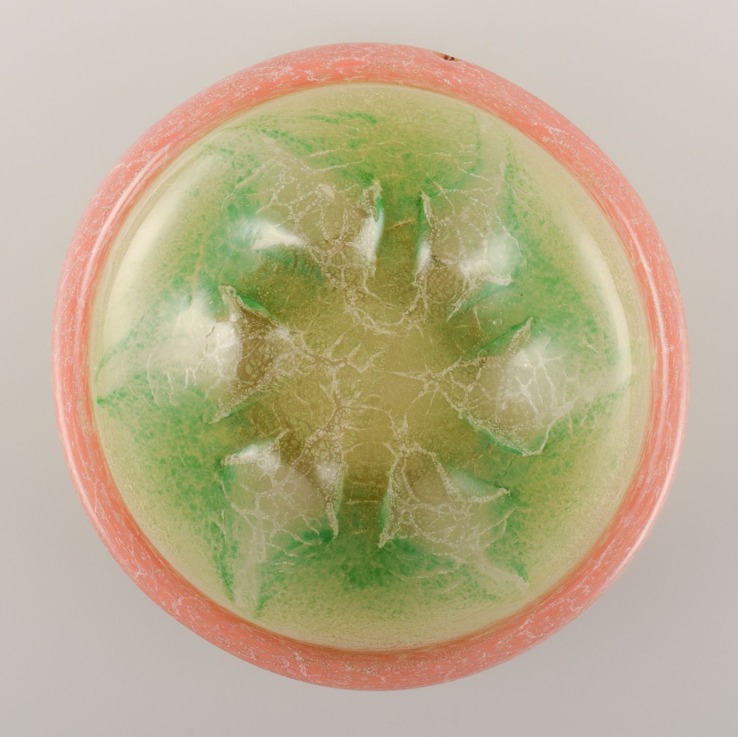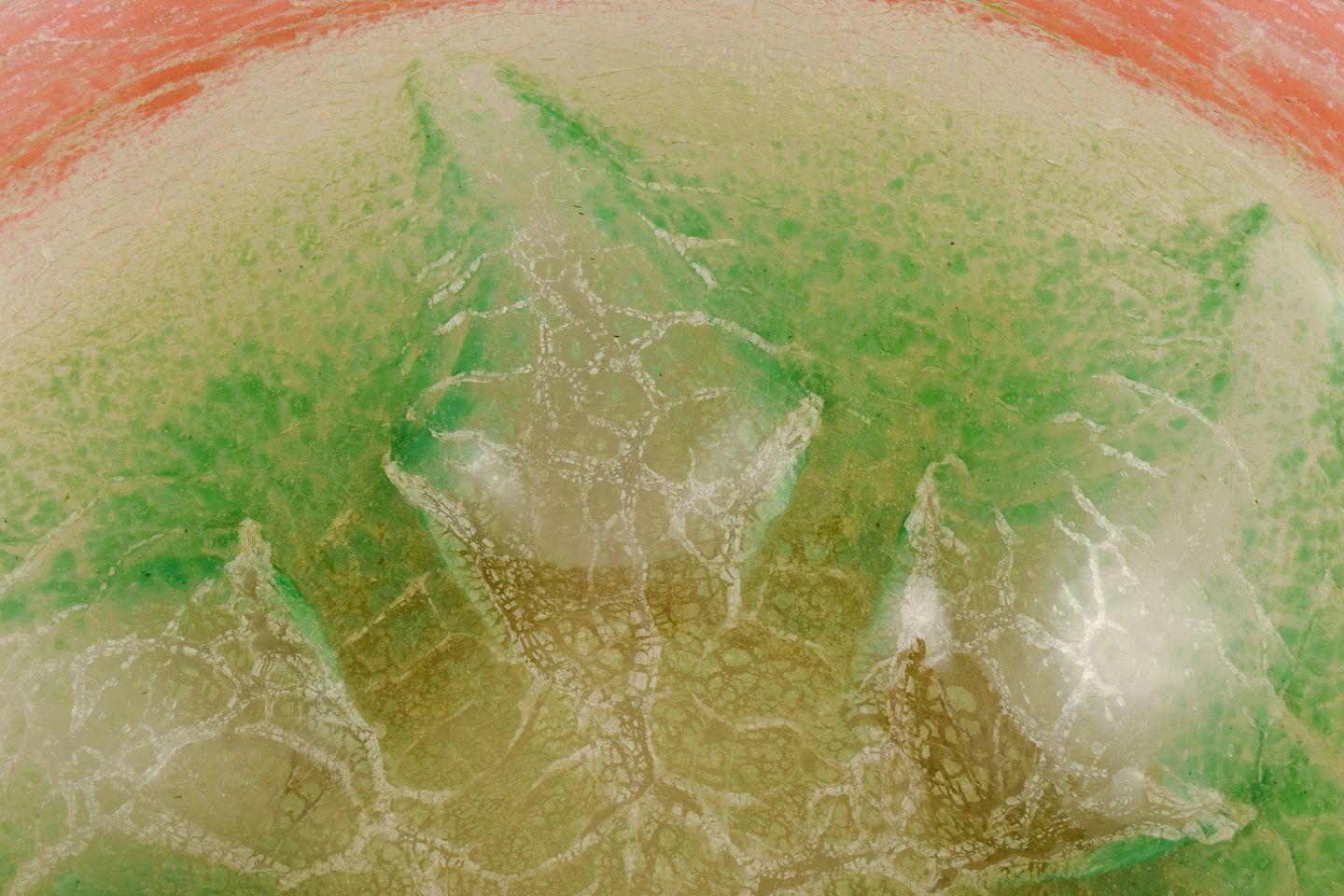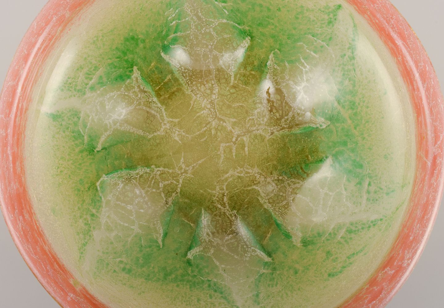 Karl Wiedmann for WMF, Tyskland, stor ”Ikora” kunstglas skål i æblegrønt og laksefarvet glas. Art Deco. Ca. 1920. I perfekt stand. Mål: D 28,5 x H 6,2 cm.