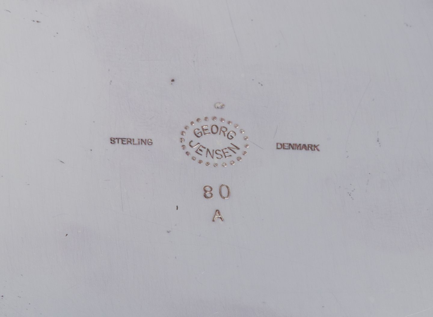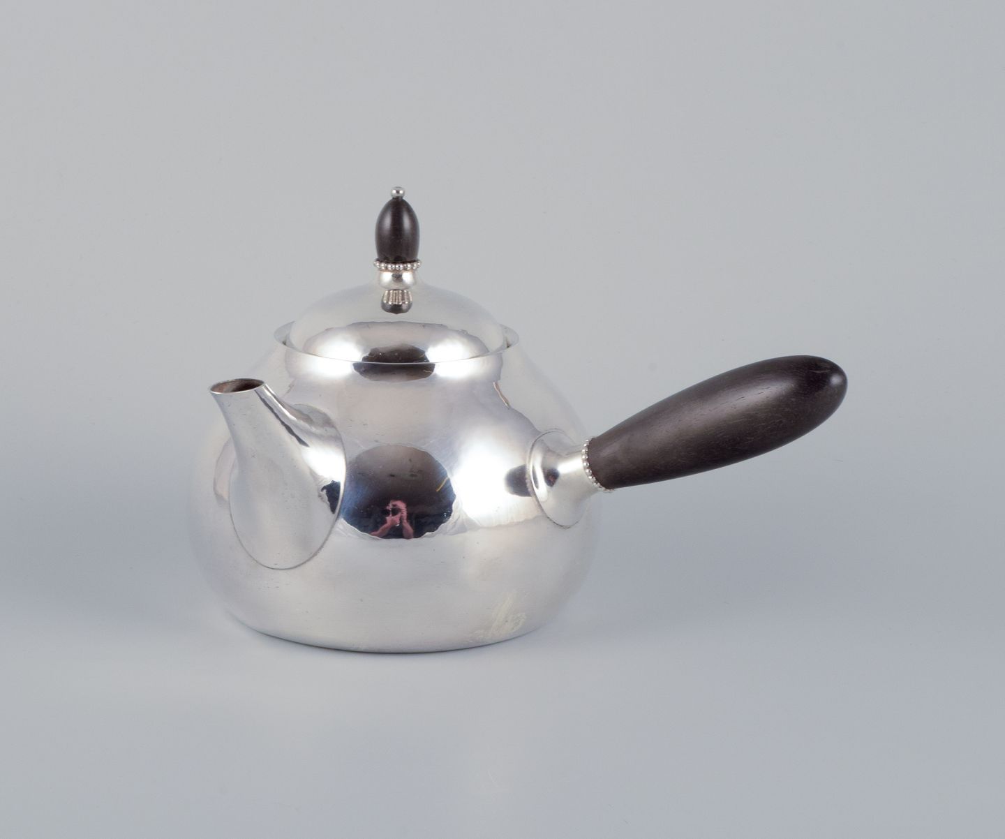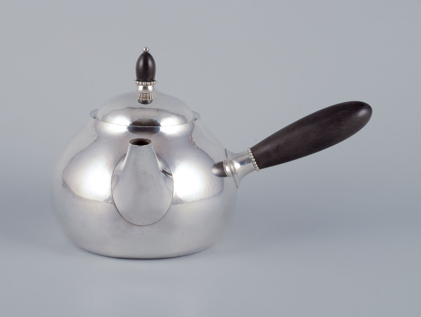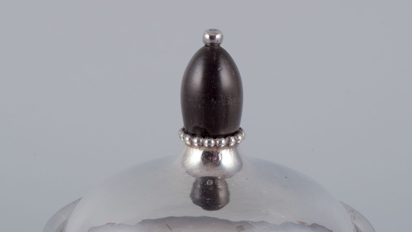 Georg Jensen tekande i sterlingsølv med hank og lågknop i ibenholt. Model 80A. Perfekt stand. Stemplet efter 1944. Mål: L 21,5 cm. inklusive hank x H 13,0 cm. inklusive låg.