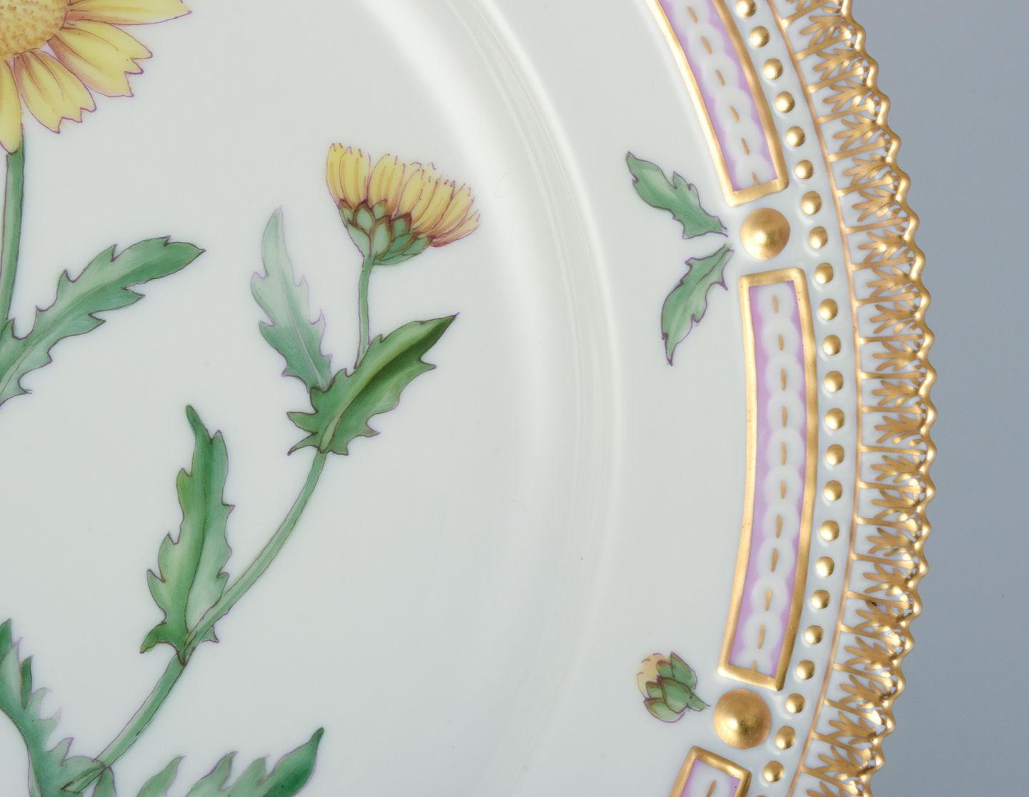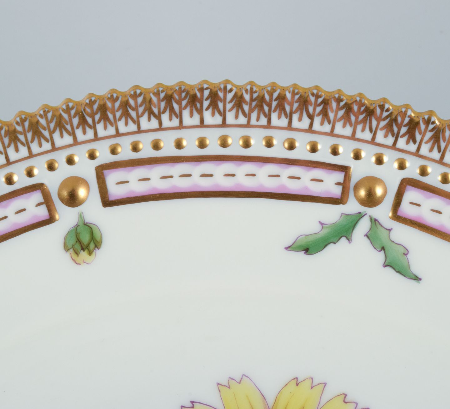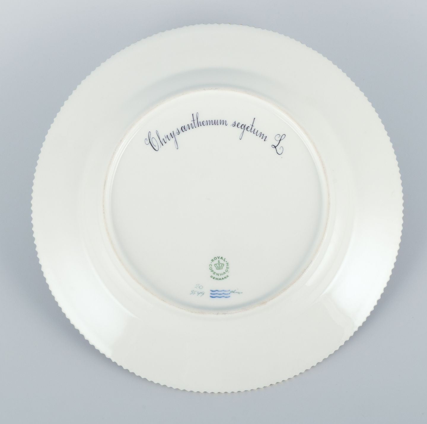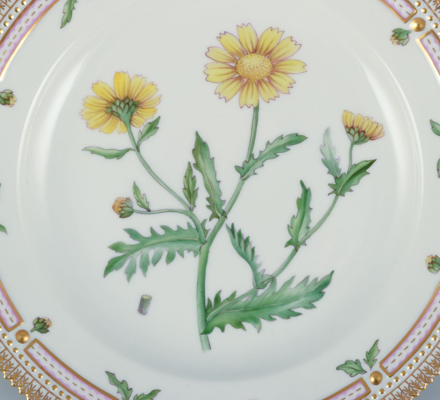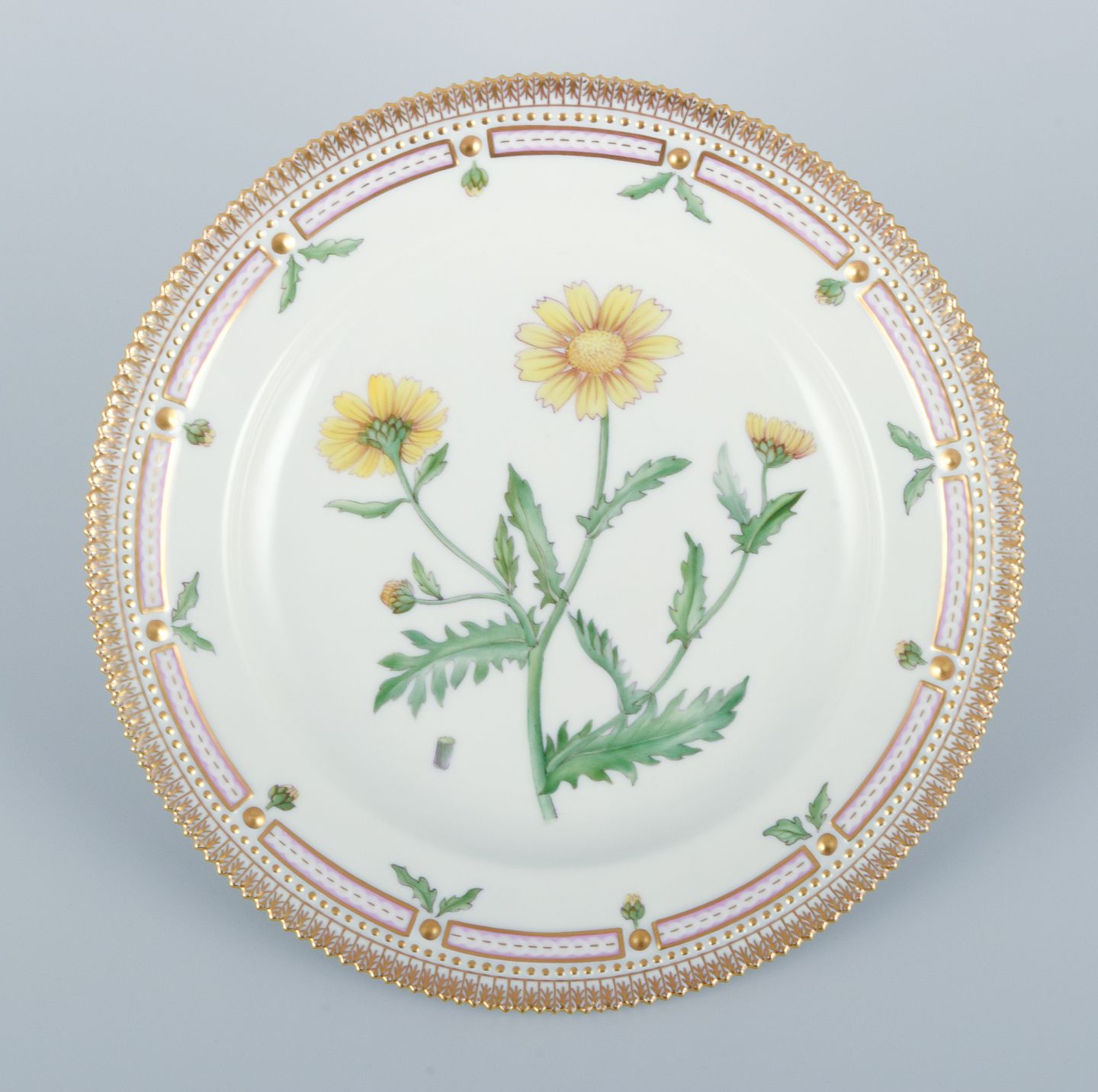Royal Copenhagen Flora Danica middagstallerken. Håndmalet. 24 karat bladguld. Model: 20/3549. Første sortering. Stemplet. I perfekt stand. Fremstår som ny. Mål: D 25,4 cm.