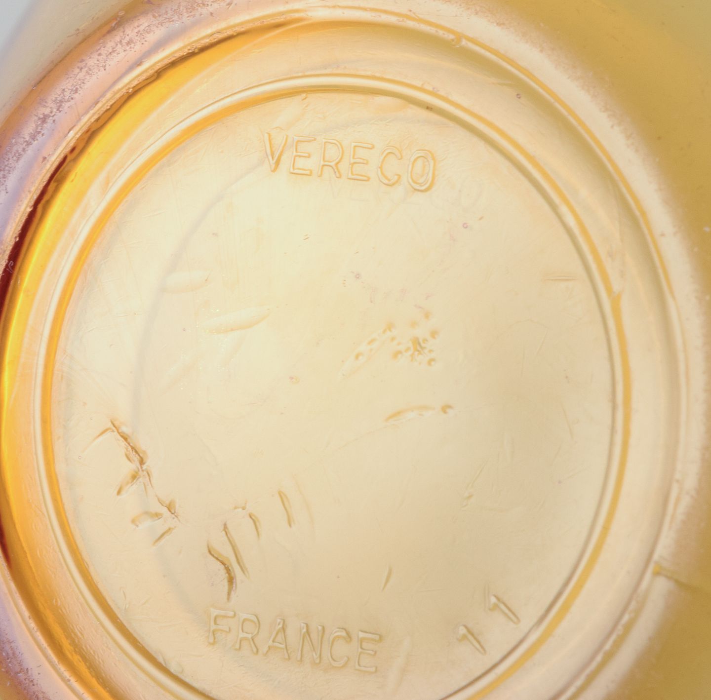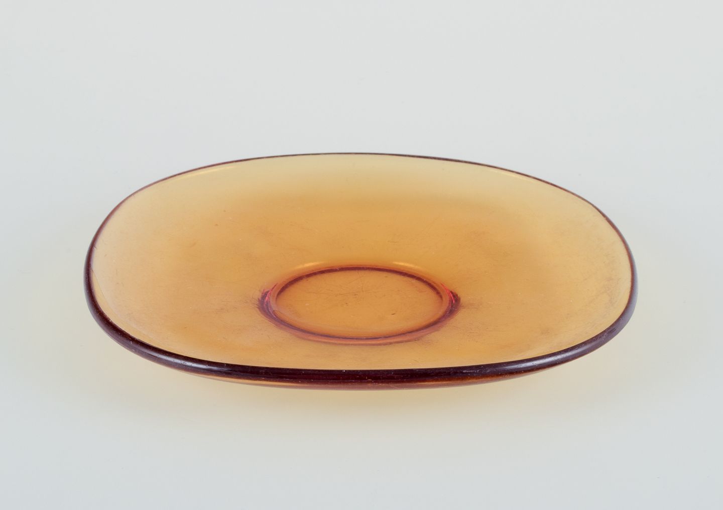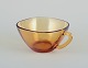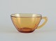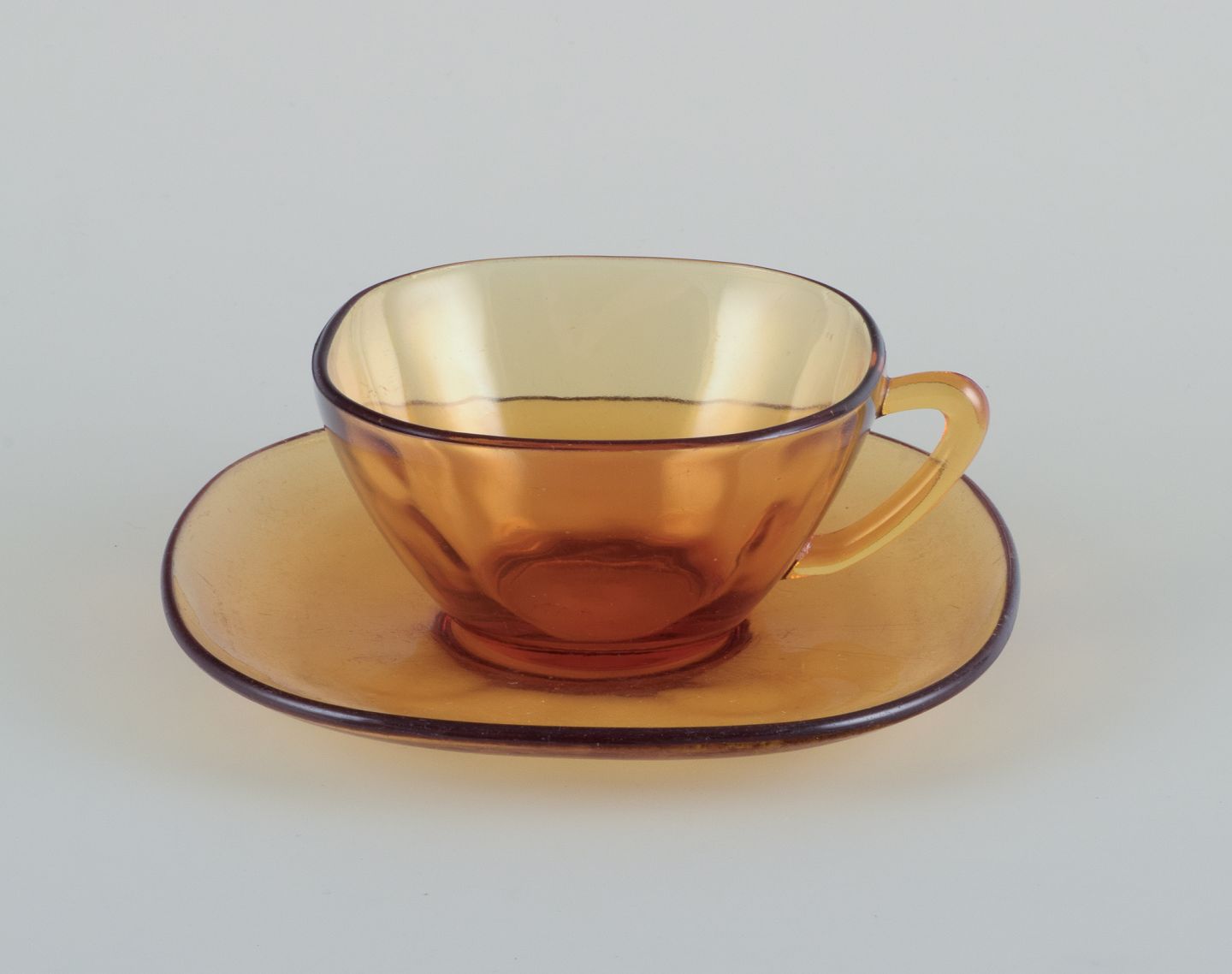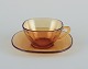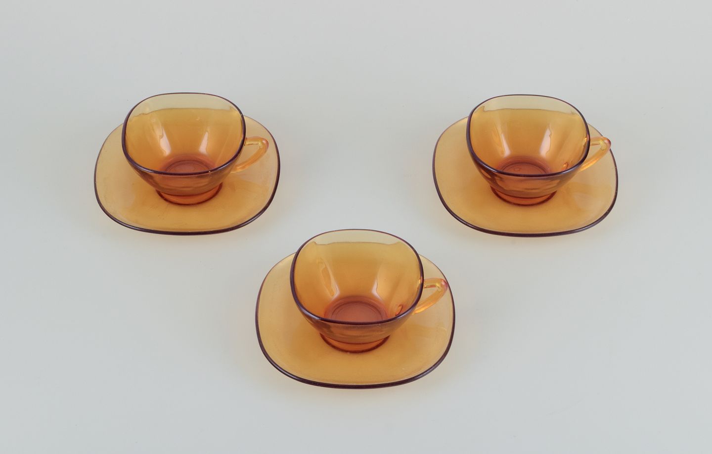 Vereco, Frankrig. Et sæt på tre kaffekopper med tilhørende underkopper i ravfarvet glas. Modernistisk design.