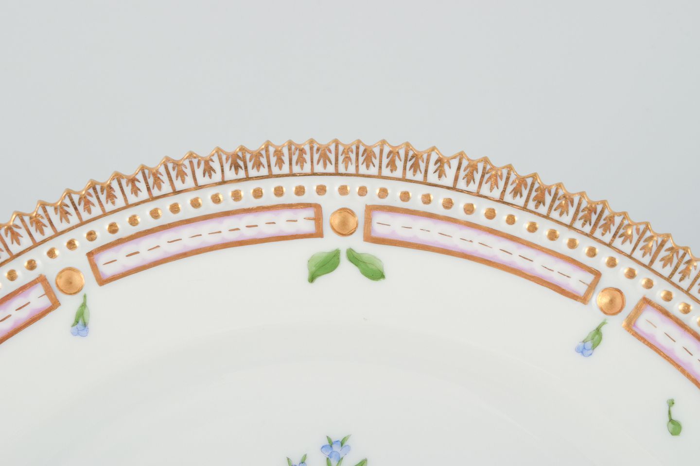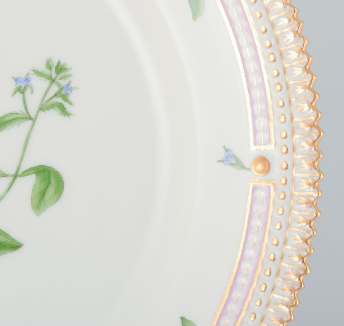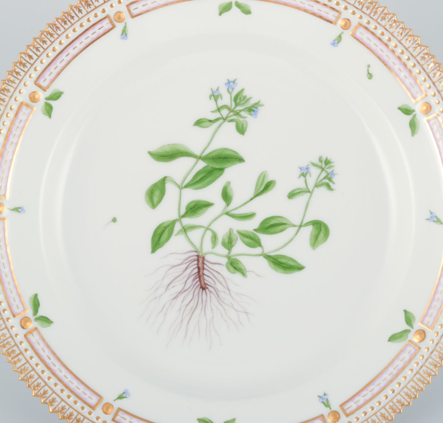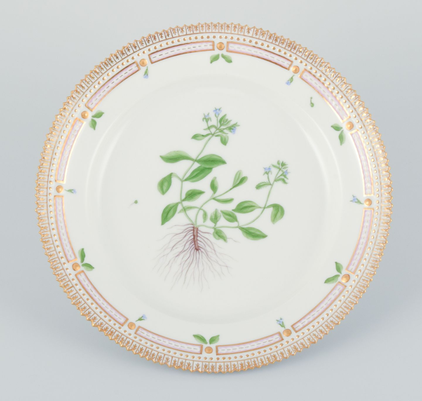 Royal Copenhagen Flora Danica tallerken. Håndmalet. 24 karat bladguld. Model 20/3550 Datering: 1964 Stemplet. Perfekt stand. Første sortering. Mål: D 22,0 cm. x H 3,2 cm.
