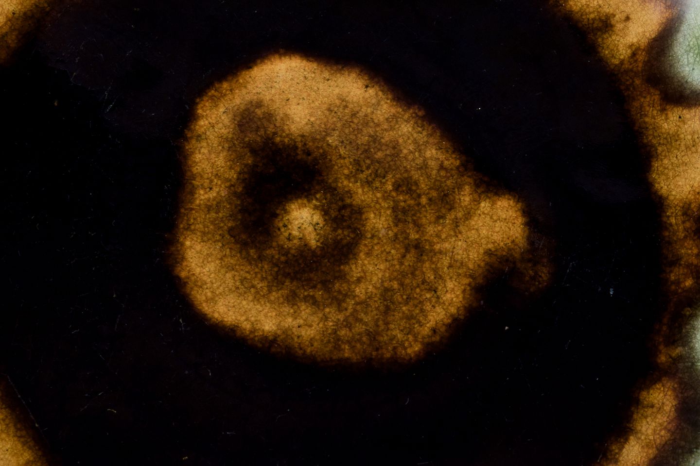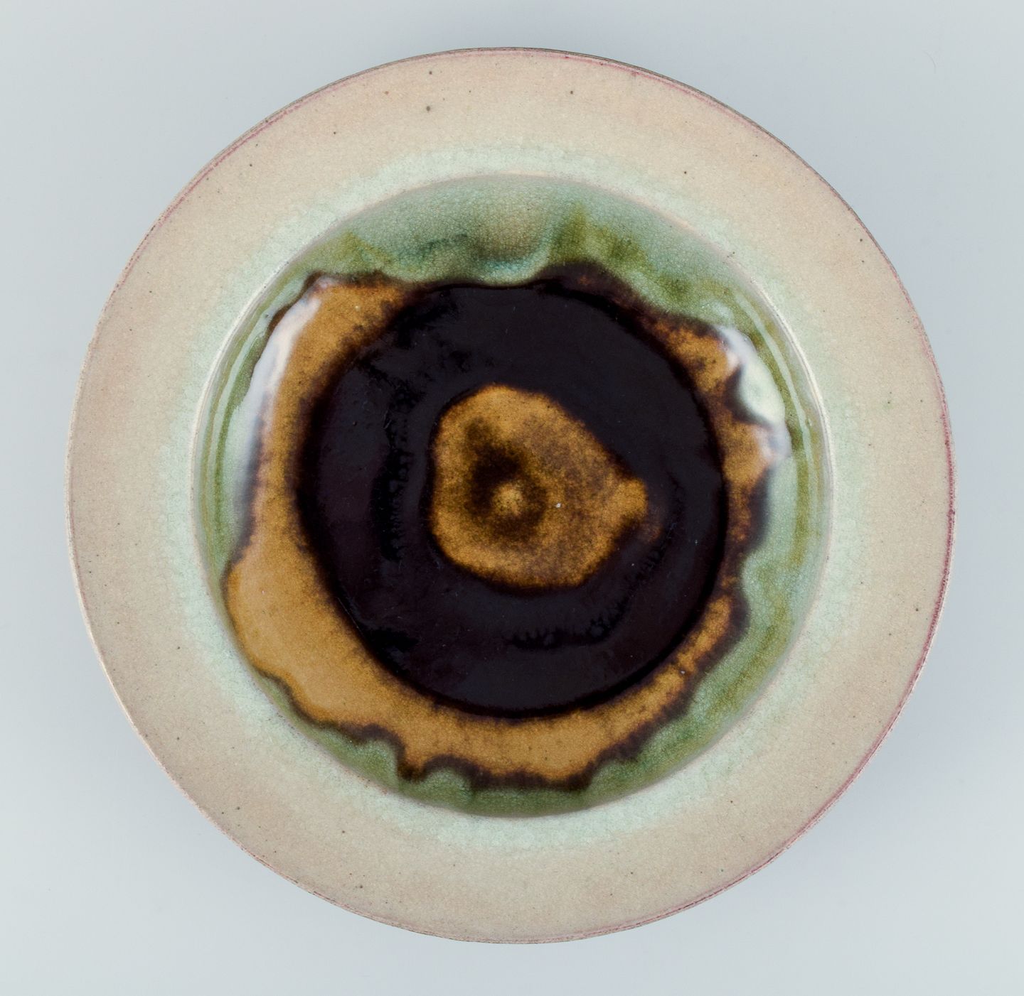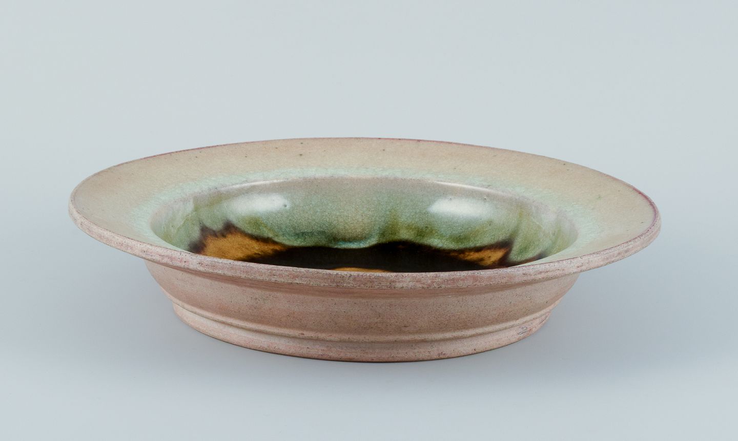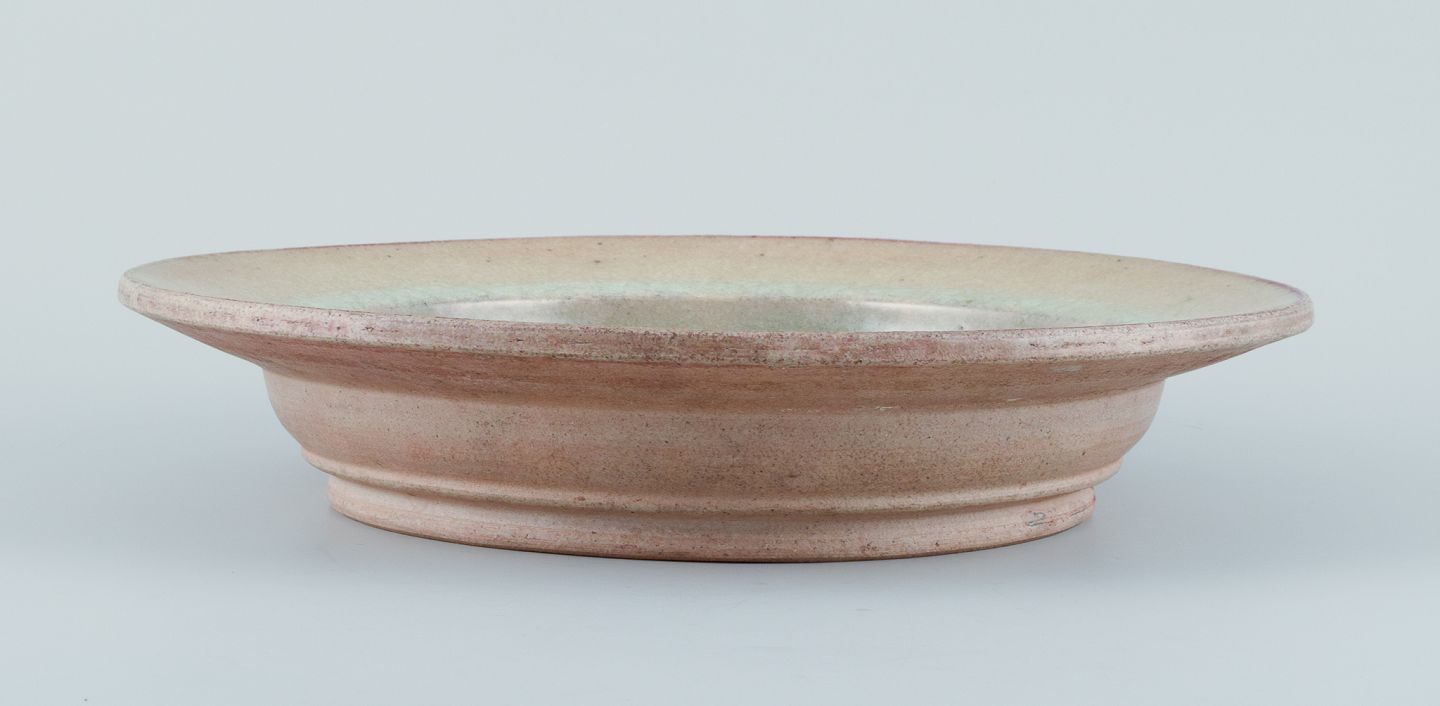 Nils Kähler for Kähler. Stor keramikskål i modernistisk design. Urangul glasur med blå og grønne nuancer. Ca. 1970. I perfekt stand med naturlige krakeleringer. Stemplet. Mål: D 34,3 cm. x H 6,0 cm.