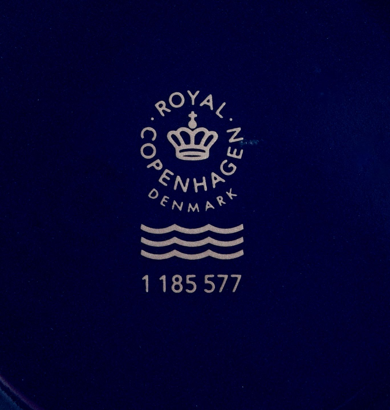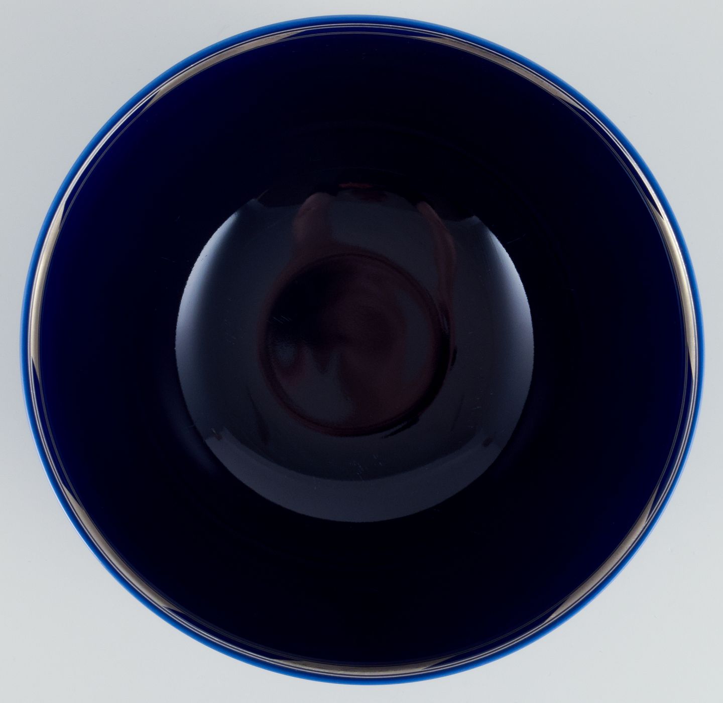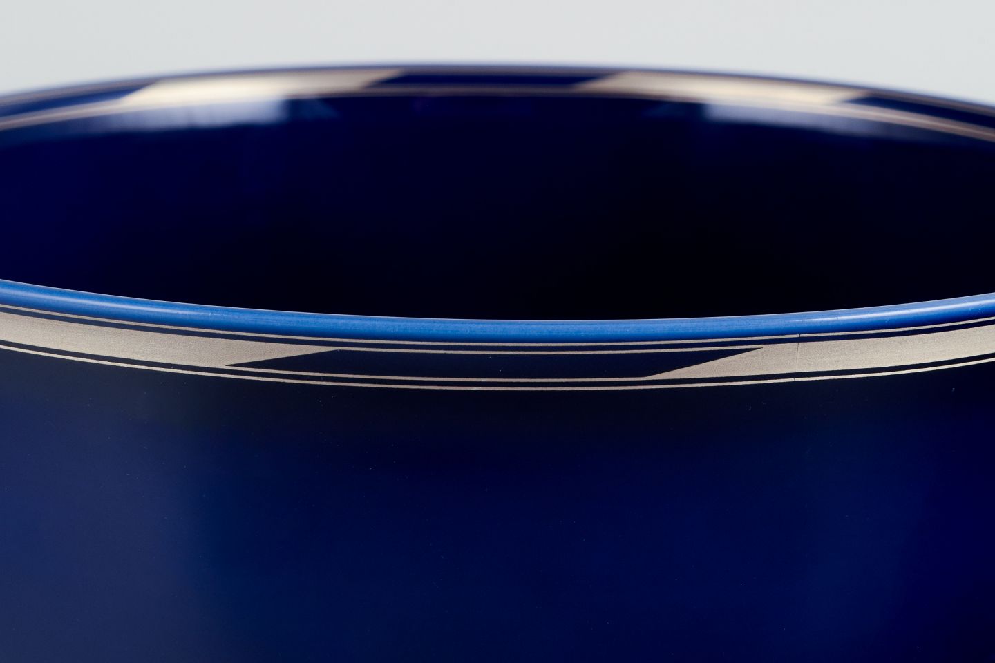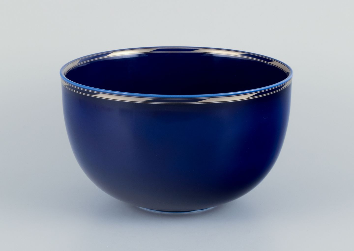 Alev Siesbye for Royal Copenhagen. Large porcelain bowl decorated with blue glaze and rim embellished with silver.