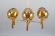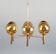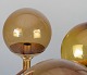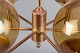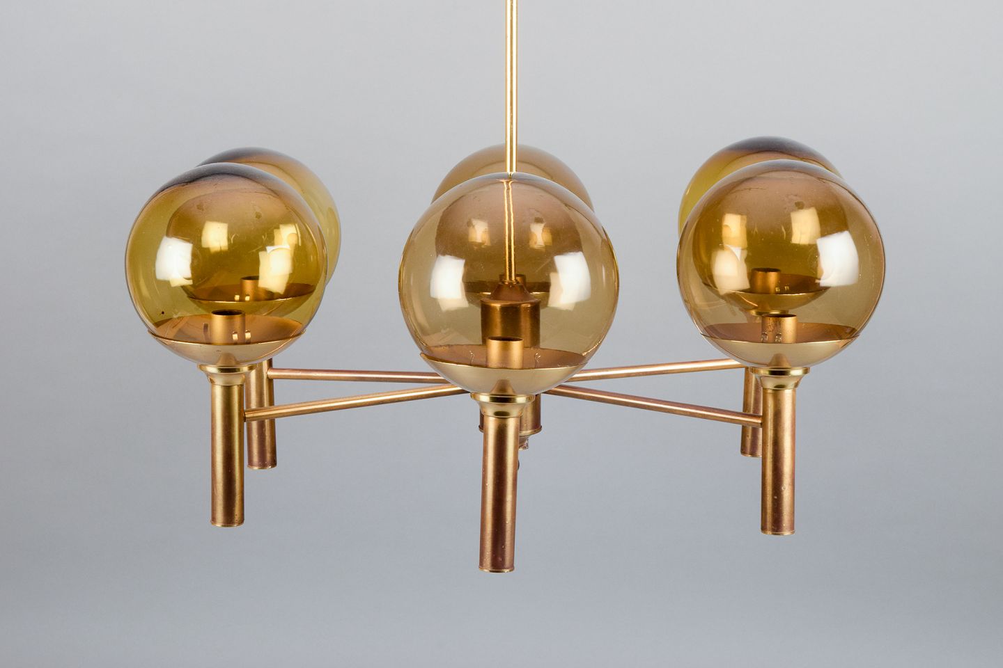 Sv. Mejlstrøm, dansk designer. Lysekrone af messing, seks arme med kuppelformede skærme af ravfarvet glas.
