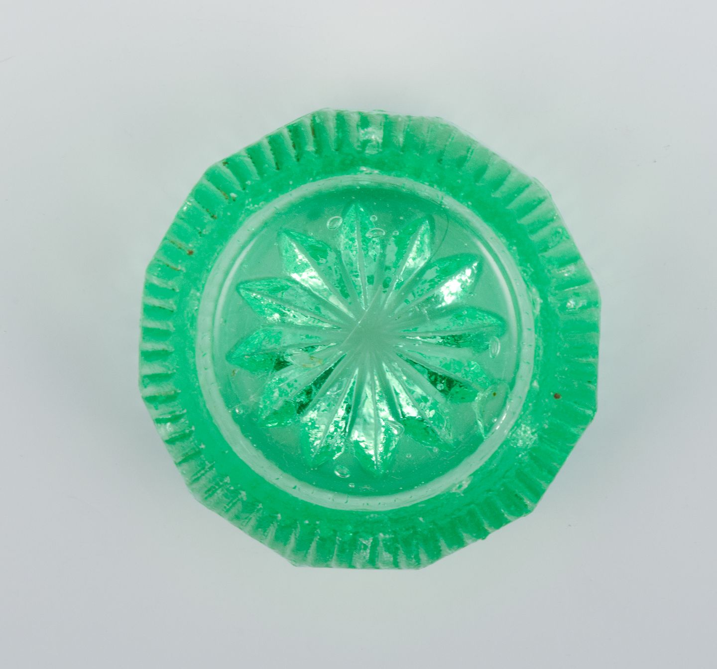Fåglavik Glasbruk (1874-1980), Sverige. Seks saltkar i farvet glas. Grønt håndlavet glas. Privat svensk samling. Midt 1900-tallet. I perfekt stand. Største: D 5,5 cm. x H 2,5 cm.