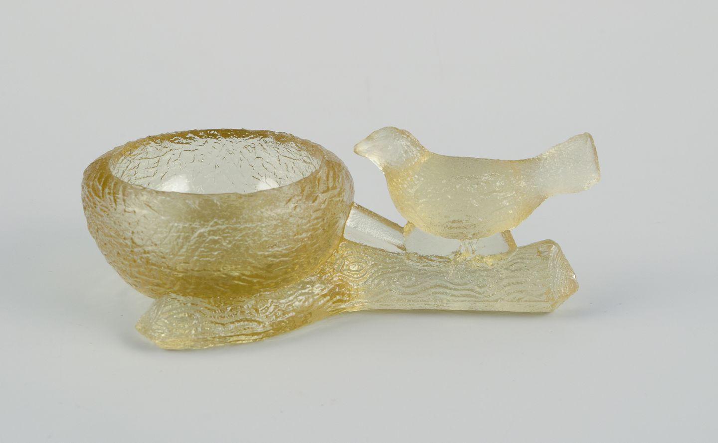 To saltkar med fugle i farvet glas. Gulbrunt håndlavet glas.