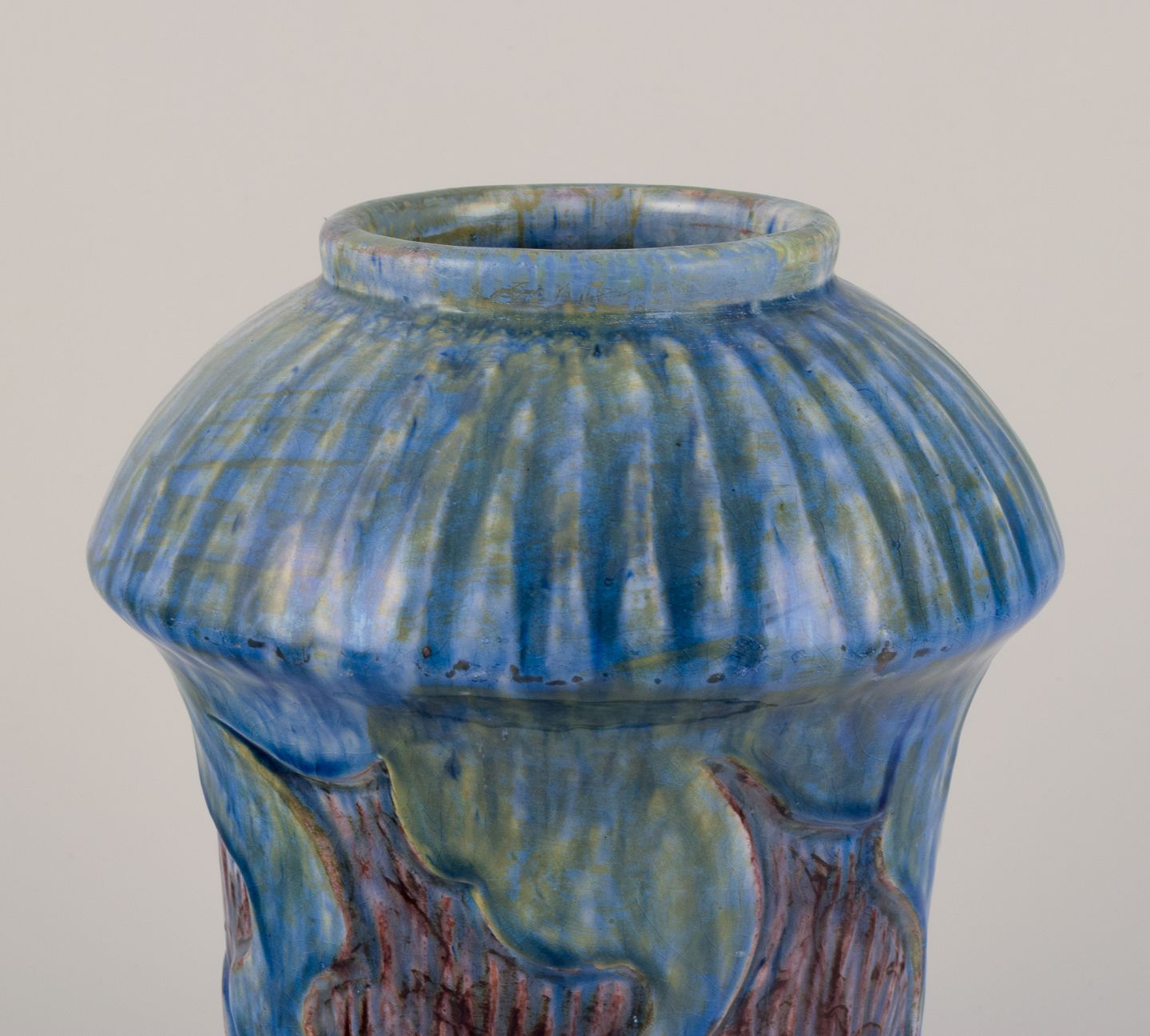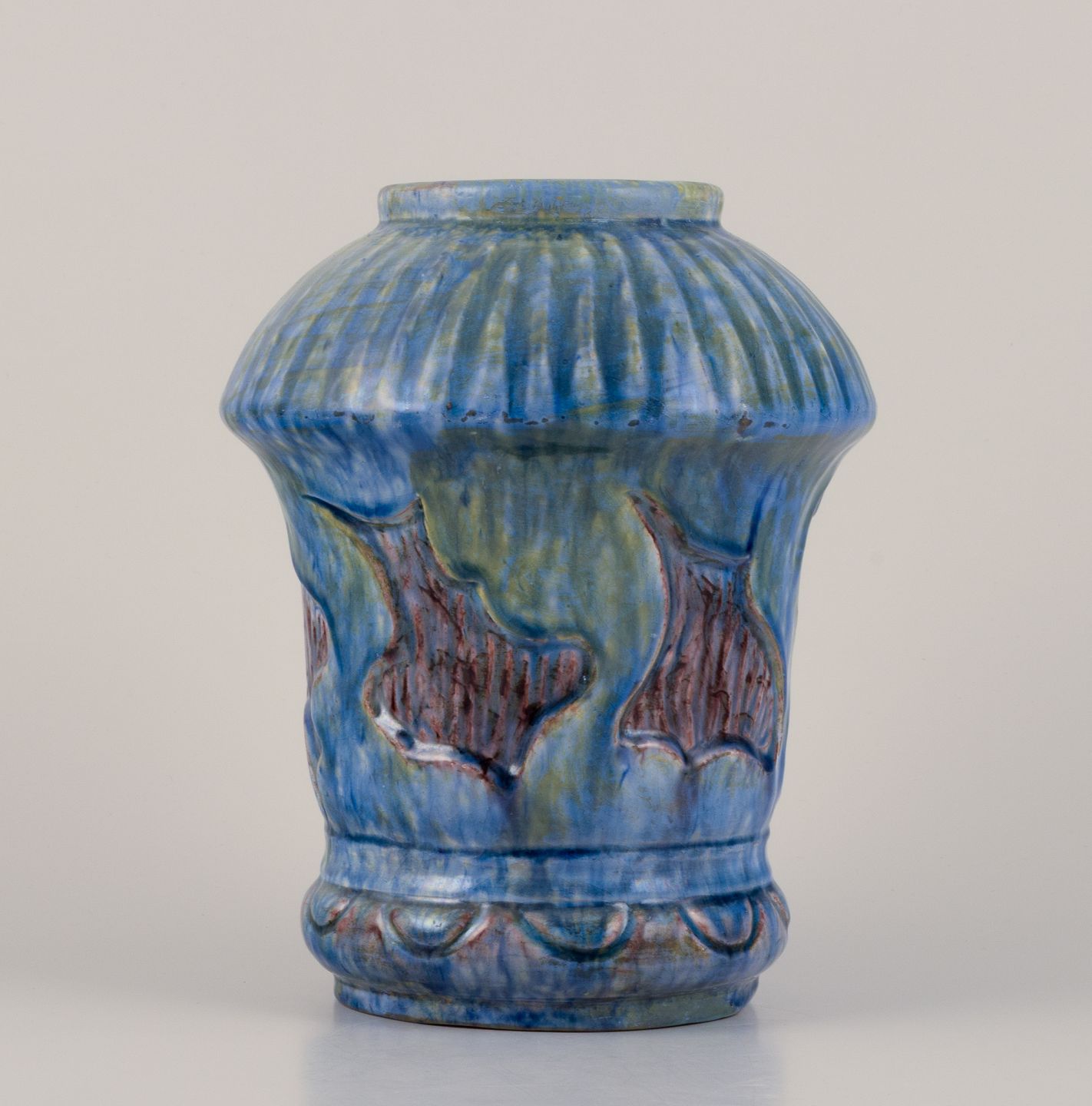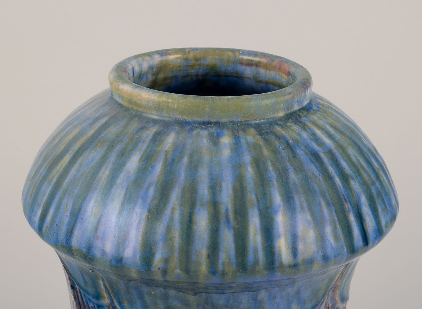 Møller & Bøgely, Denmark. Danish Art Nouveau ceramic vase in the style of Bindesbøll. Glaze in blue and green tones. Approximately 1918. Marked. Perfect condition. Dimensions: Height 21.5 cm x Diameter 16.0 cm.