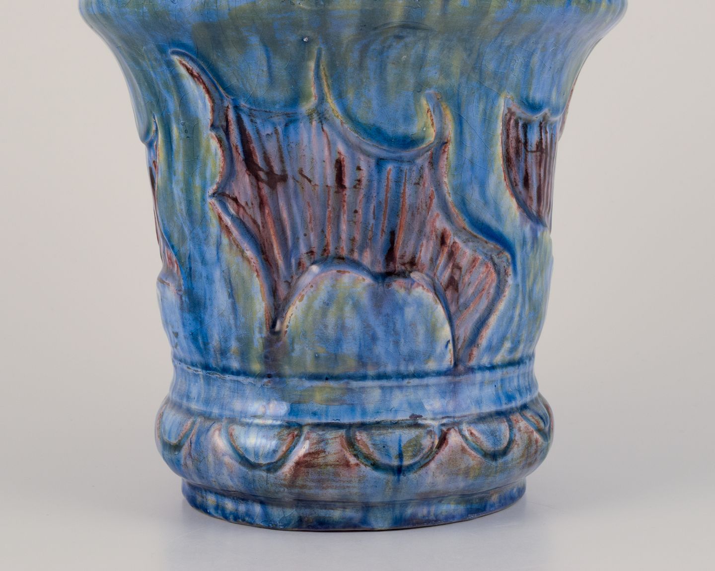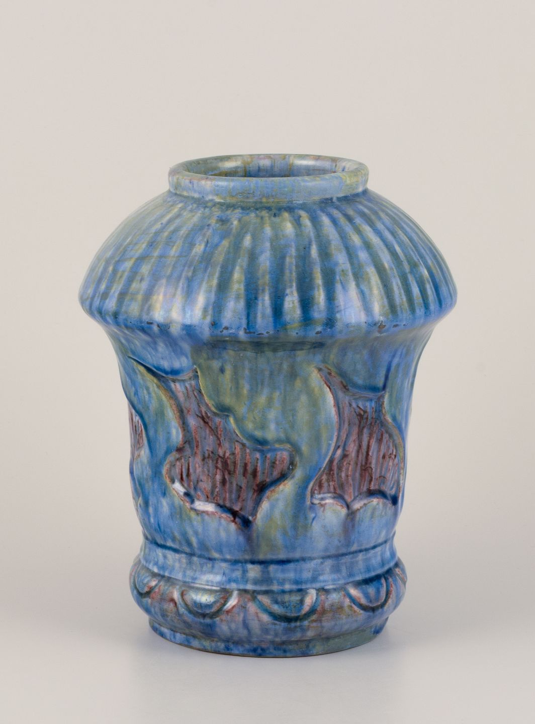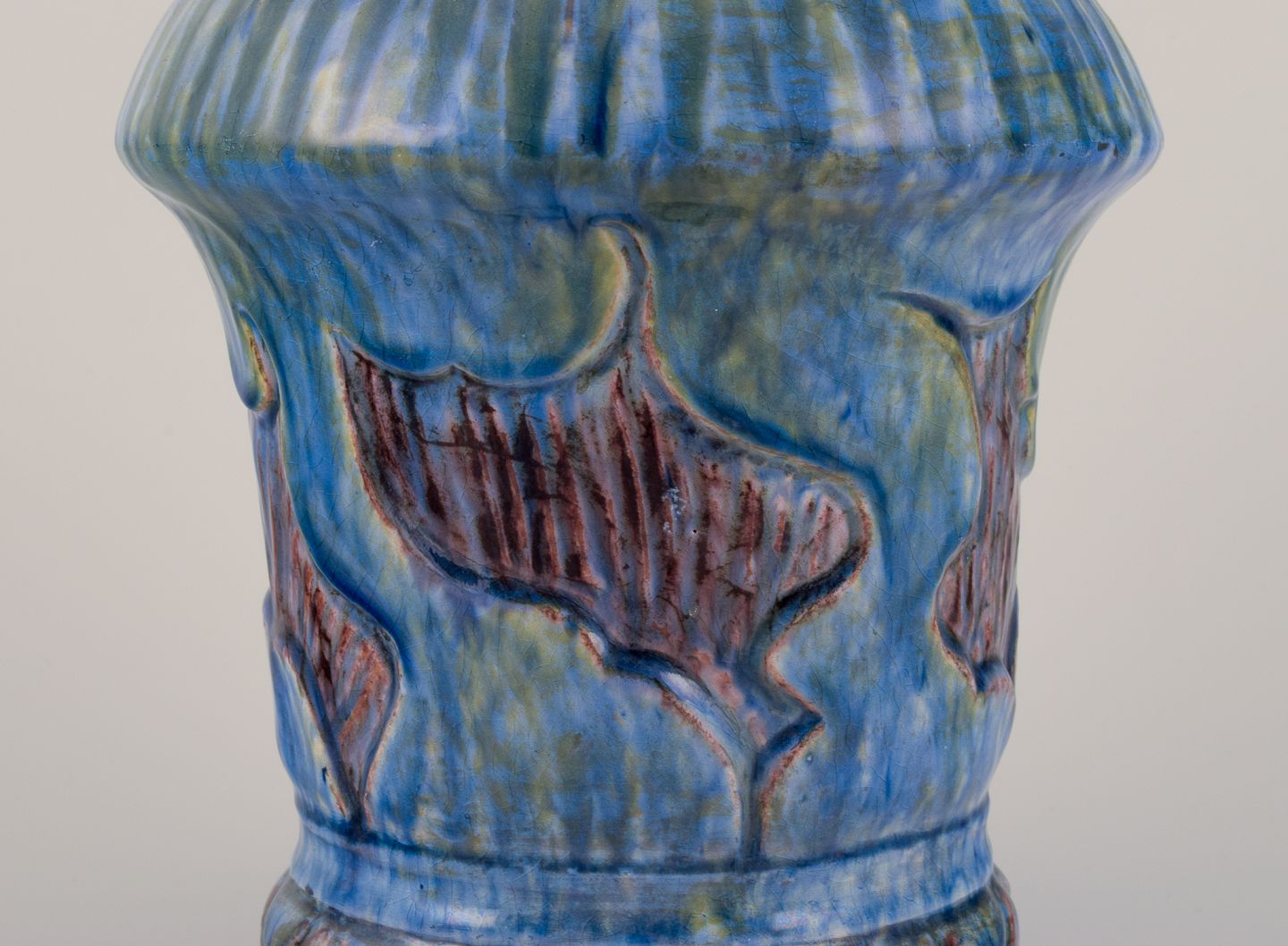 Møller & Bøgely, Denmark. Danish Art Nouveau ceramic vase in the style of Bindesbøll. Glaze in blue and green tones. Approximately 1918. Marked. Perfect condition. Dimensions: Height 21.5 cm x Diameter 16.0 cm.