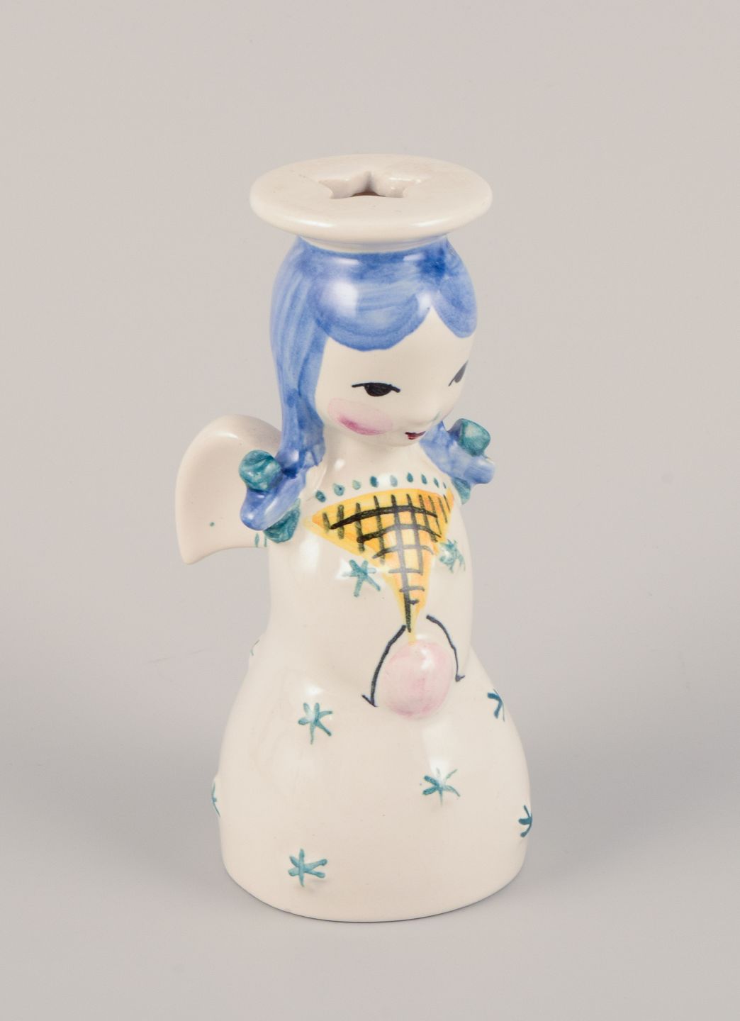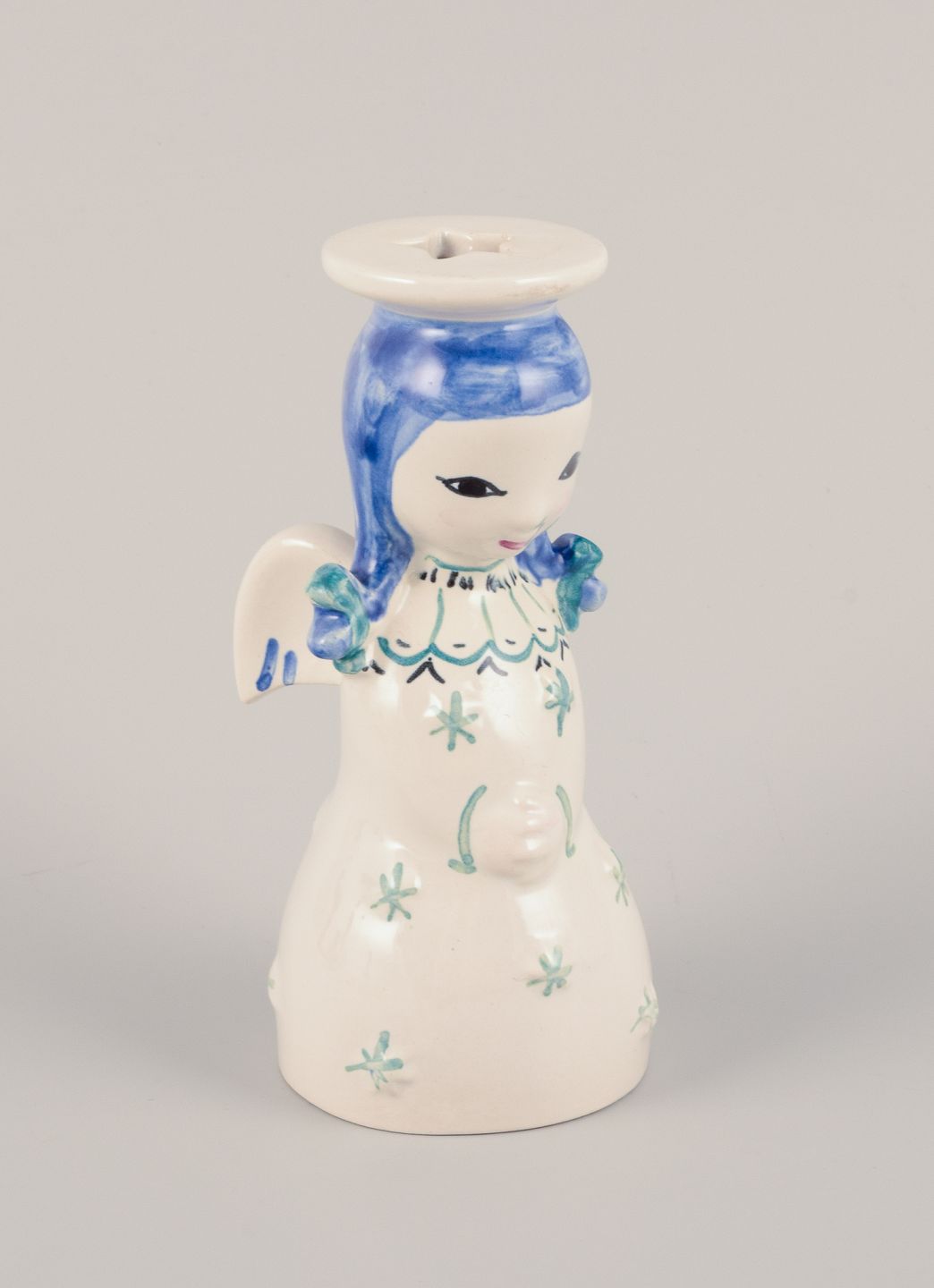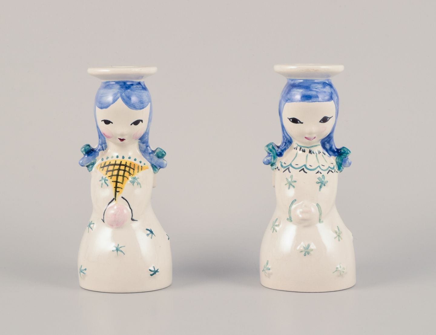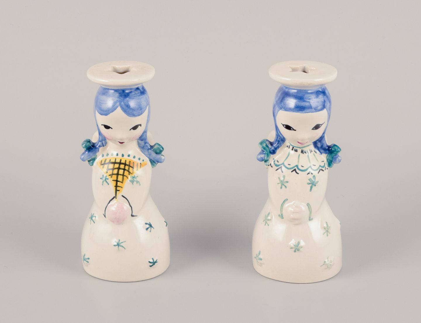Nymølle, Danmark. Et par lysestager af engle i fajance. Hånddekoreret. Ca. 1960. Stemplet. Perfekt stand. Mål: D 5,0 cm. x H 12,0 cm.