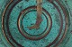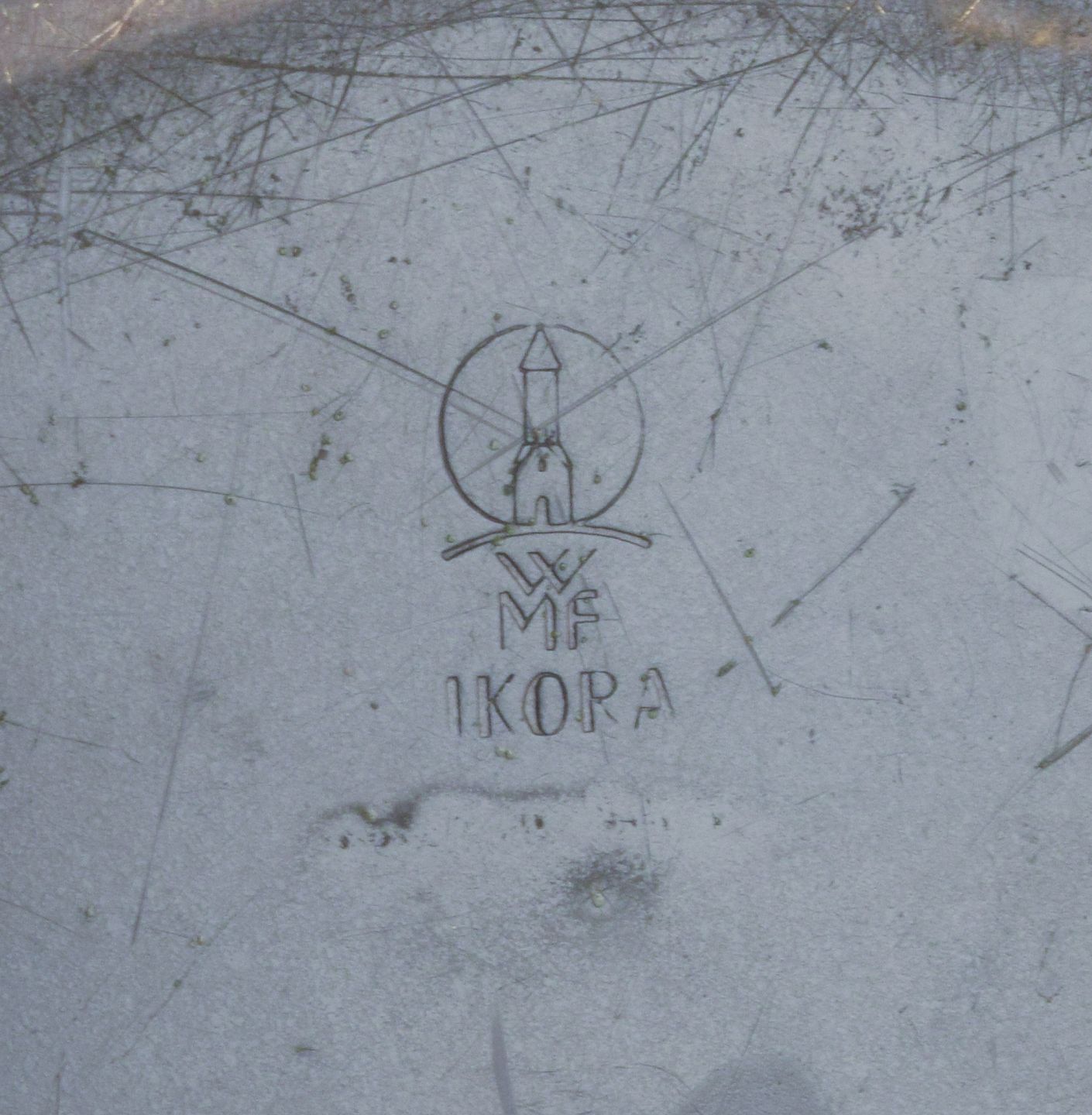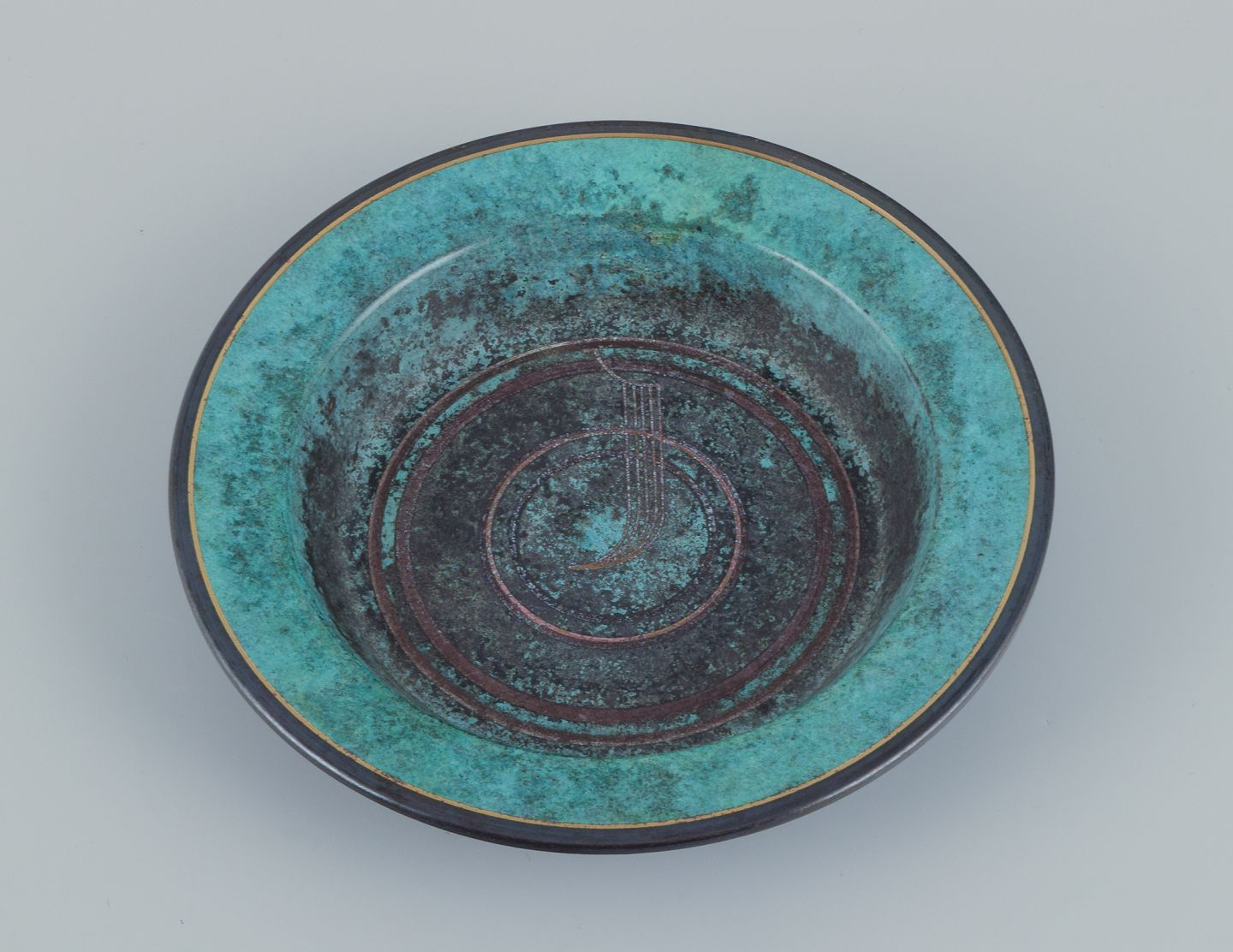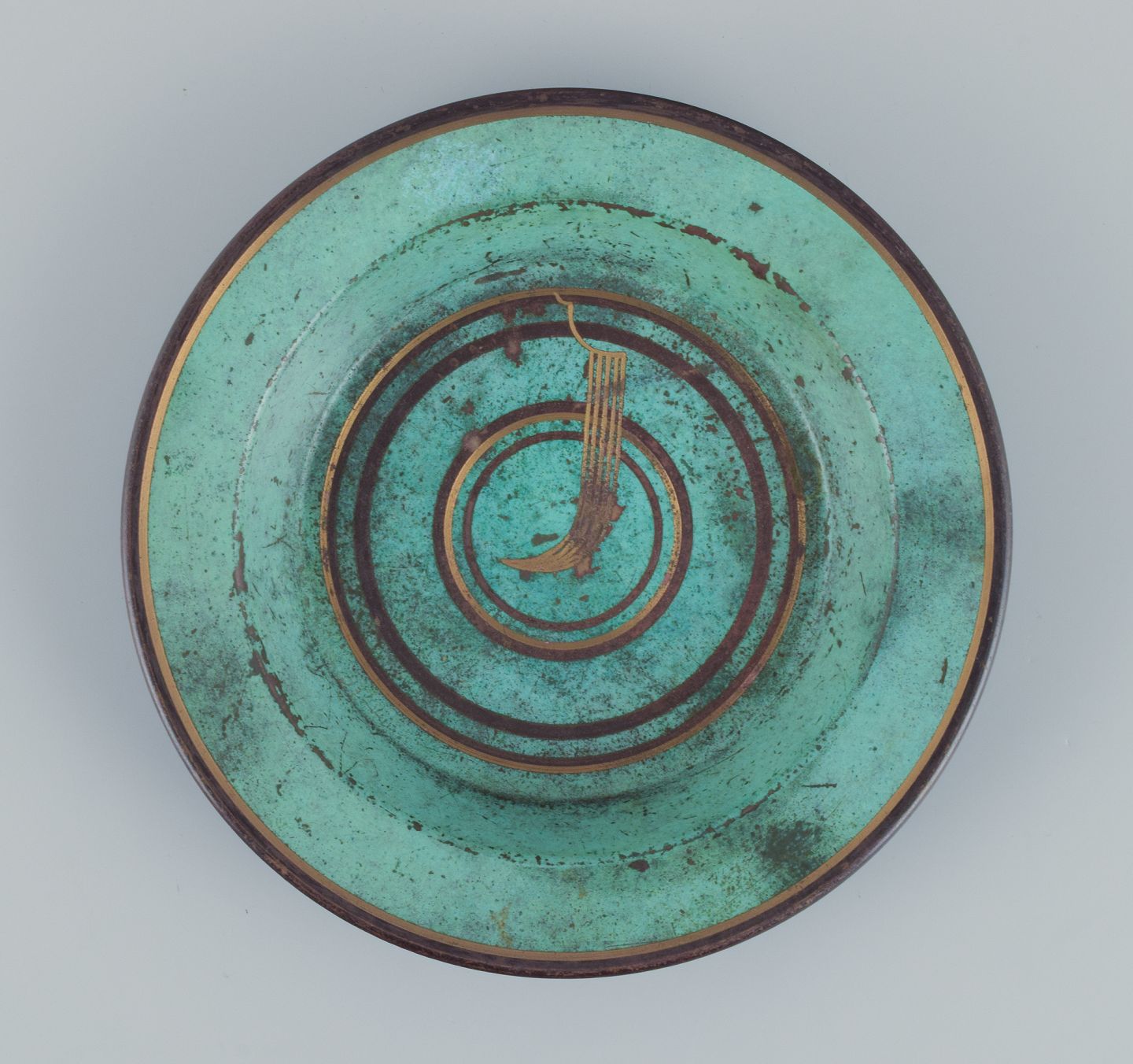 WMF (Württembergische Metallwarenfabrik), Tyskland. To Art Deco ”Ikora” skåle. Smuk grøn patina. Abstrakt motiv. 1940’erne. Stemplet. I flot stand. Mål: D 17,5 cm. x H 3,0 cm.