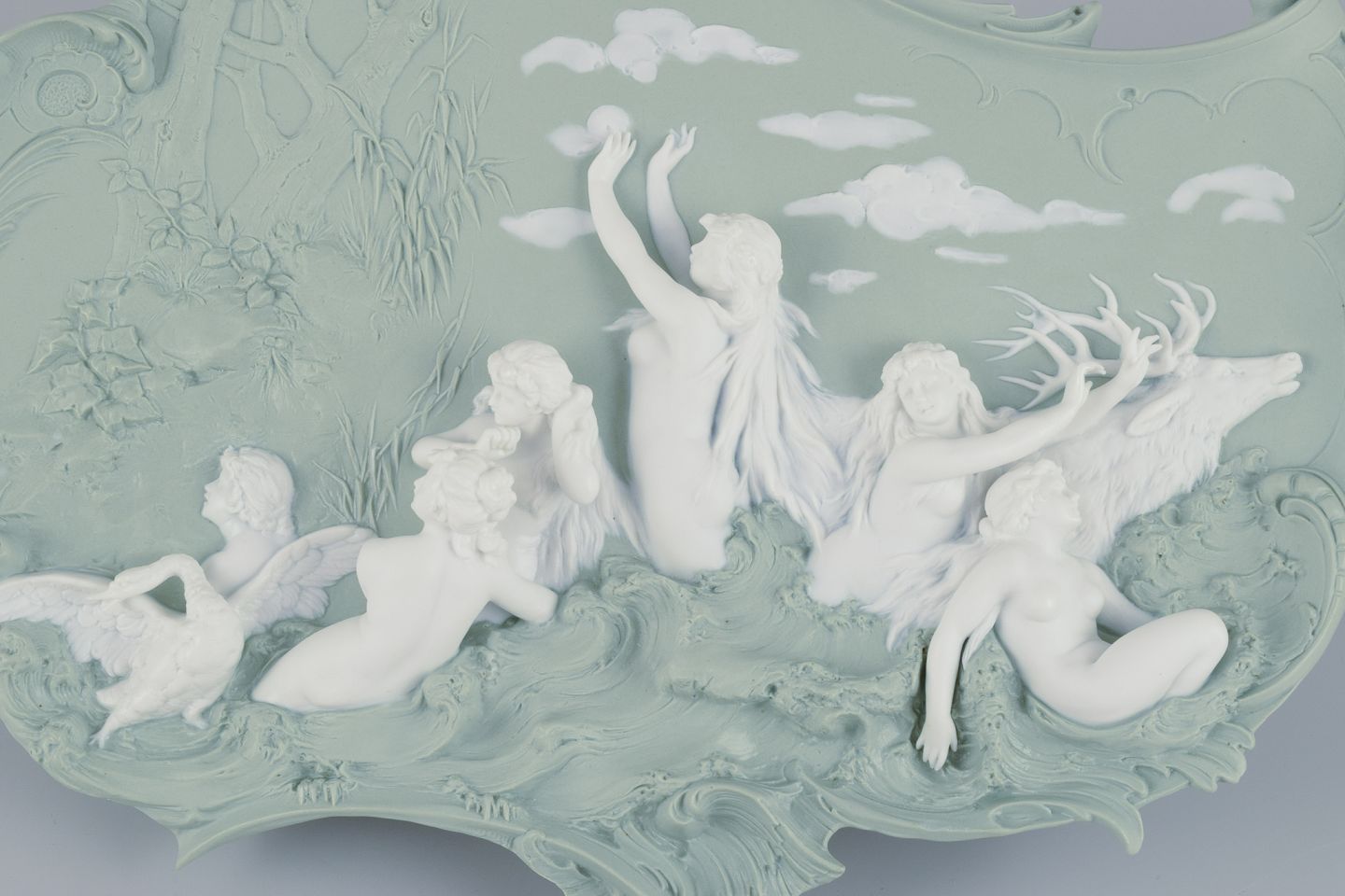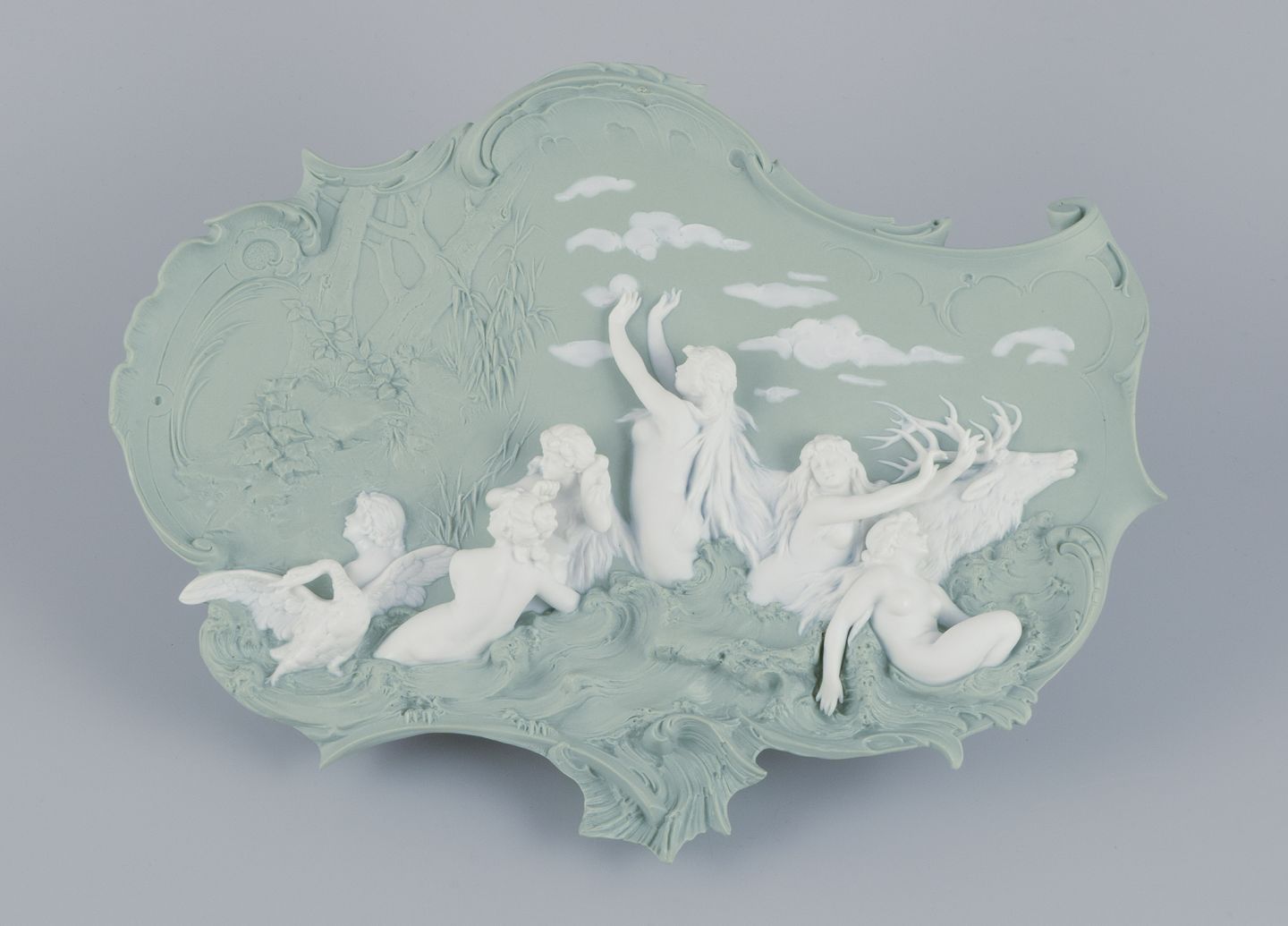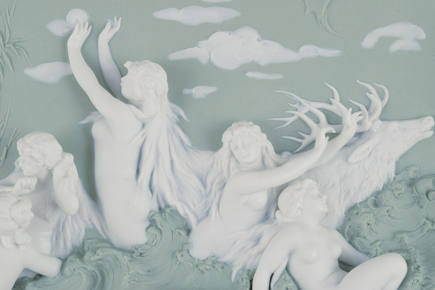 Volkstedt, Tyskland. Stort Art Nouveau vægrelief i biscuit. Motiv af nøgne kvinder i landskab. Ca. 1900. Stemplet. Med ophæng. Perfekt stand. Mål: B 32,0 cm. x H 25,0 cm. x D 3,5 cm.