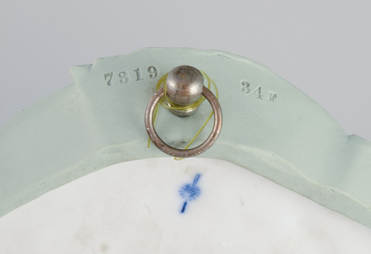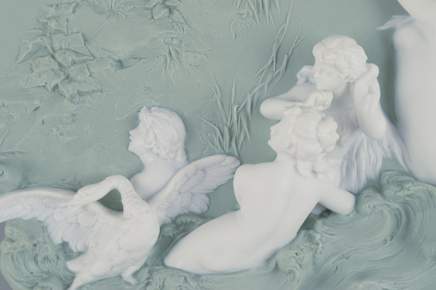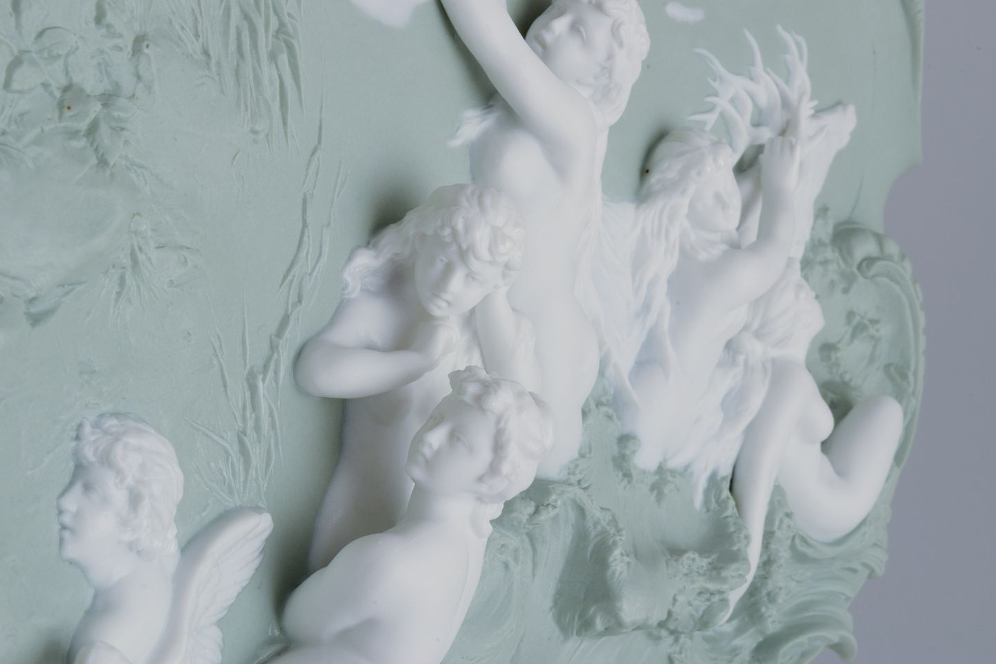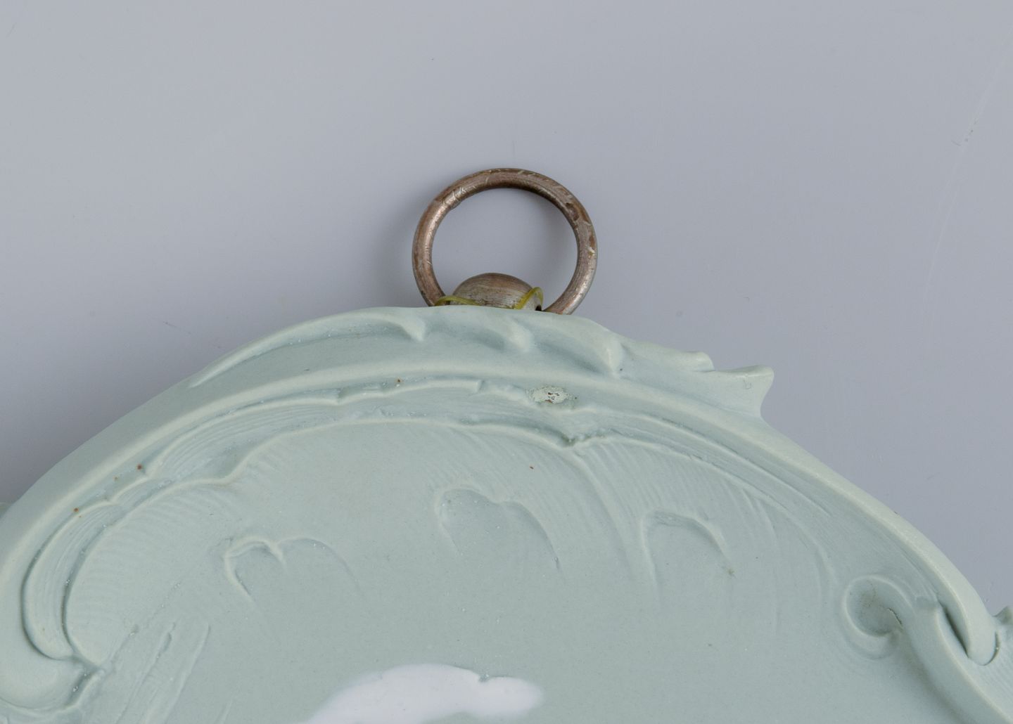Volkstedt, Tyskland. Stort Art Nouveau vægrelief i biscuit. Motiv af nøgne kvinder i landskab. Ca. 1900. Stemplet. Med ophæng. Perfekt stand. Mål: B 32,0 cm. x H 25,0 cm. x D 3,5 cm.