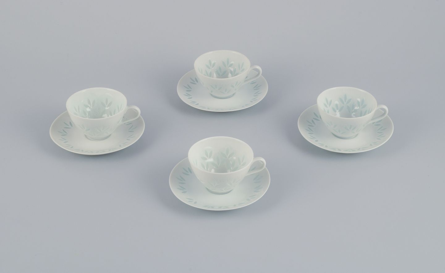 Friedl Kjellberg for Arabia, Finland. Et sæt på fire kaffekopper med tilhørende underkopper i ris-porcelæn. Ca. 1960. Stemplet. I perfekt stand. Kop: D 7,0 cm. x 4,5 cm. Underkop: D 11,2 cm.