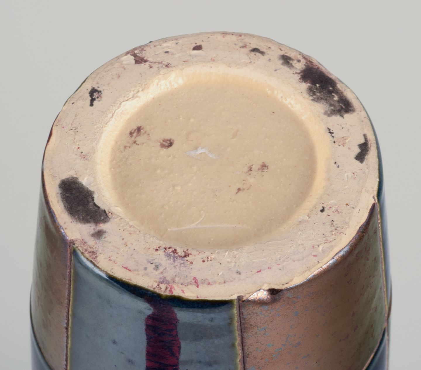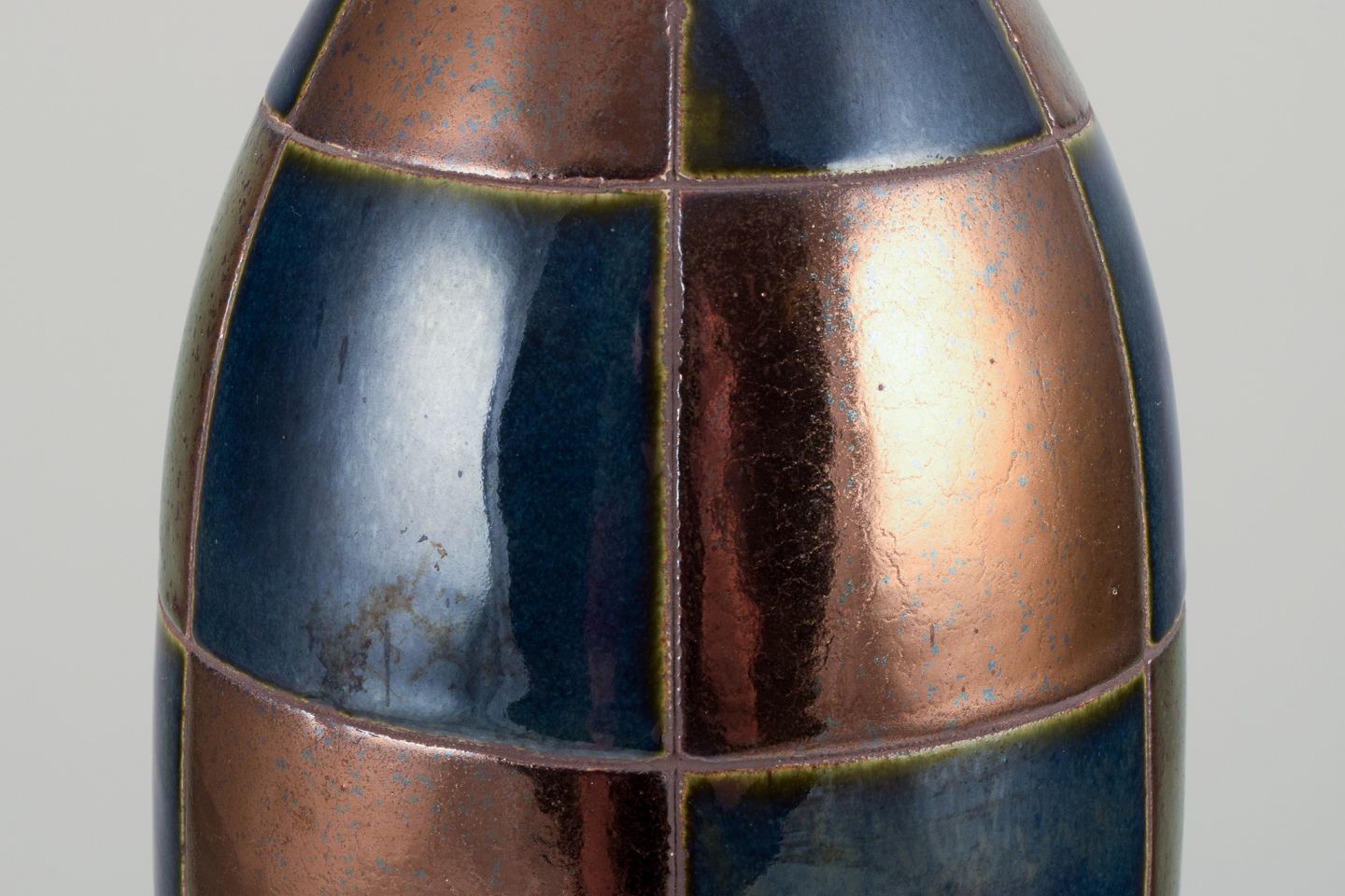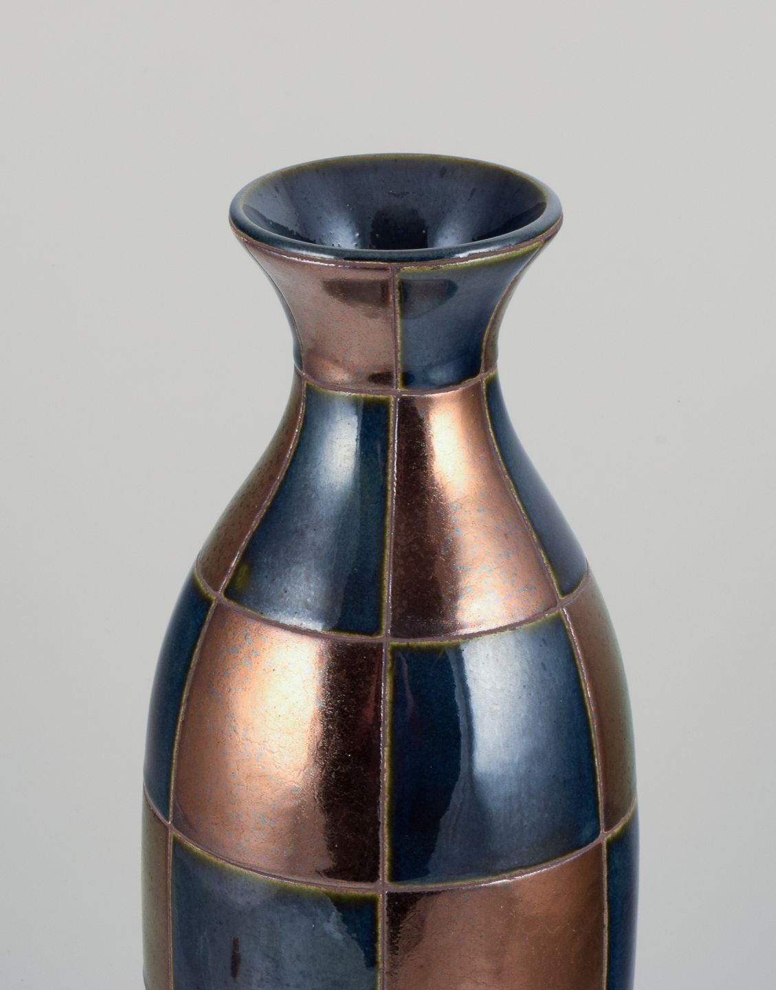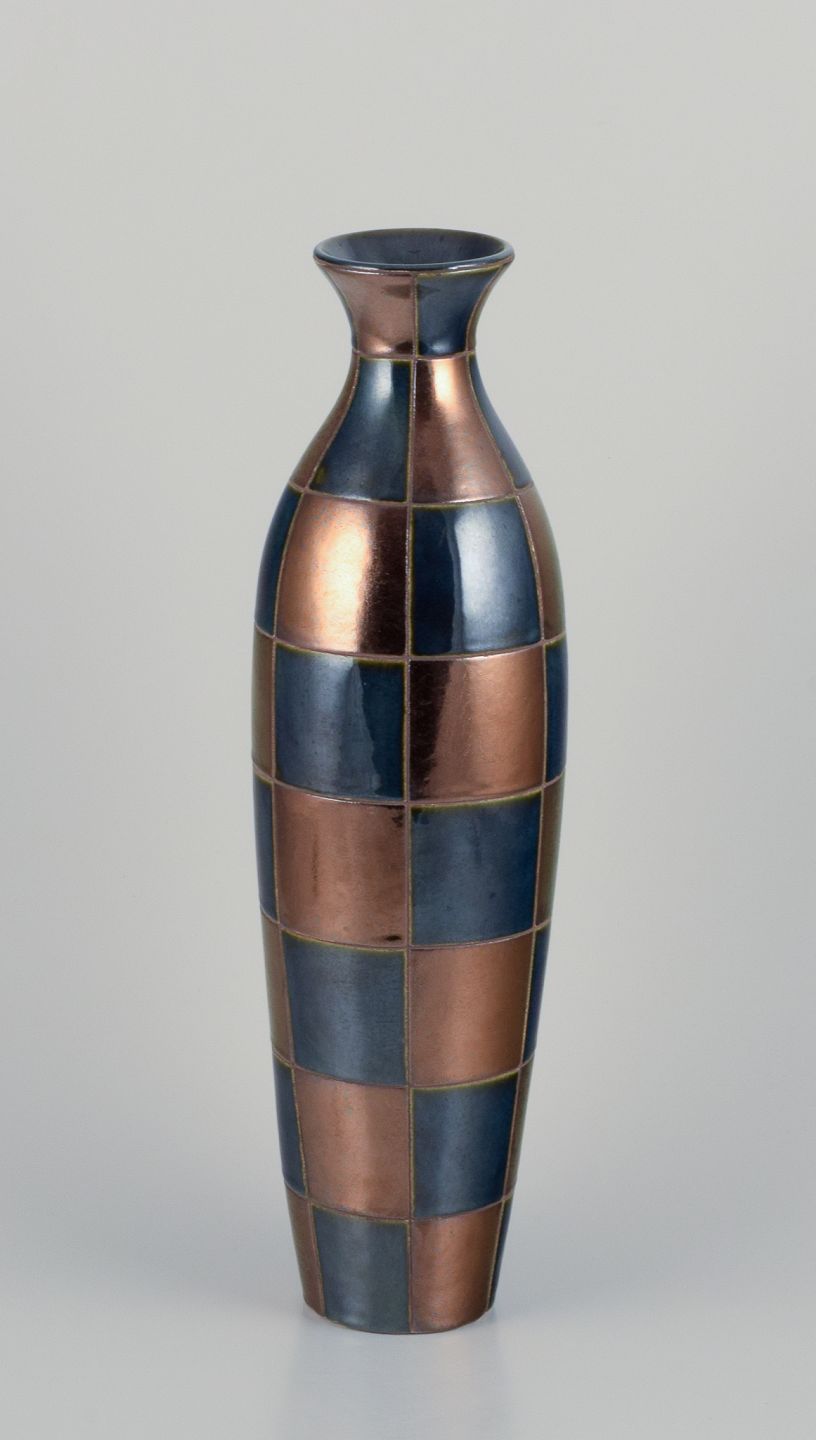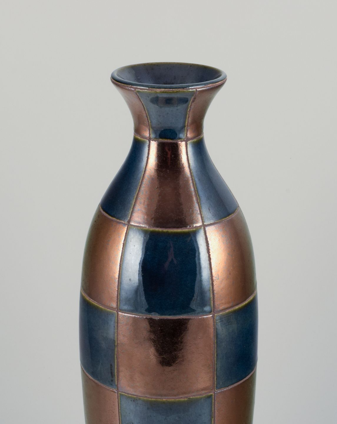 Fransk keramiker. Stor unika keramikcase i modernistisk design. Firkantede felter i blå og guldtonet blank glasur. Midt 1900-tallet. Perfekt stand. Mål: H 47,5 cm. x D 13,0 cm.