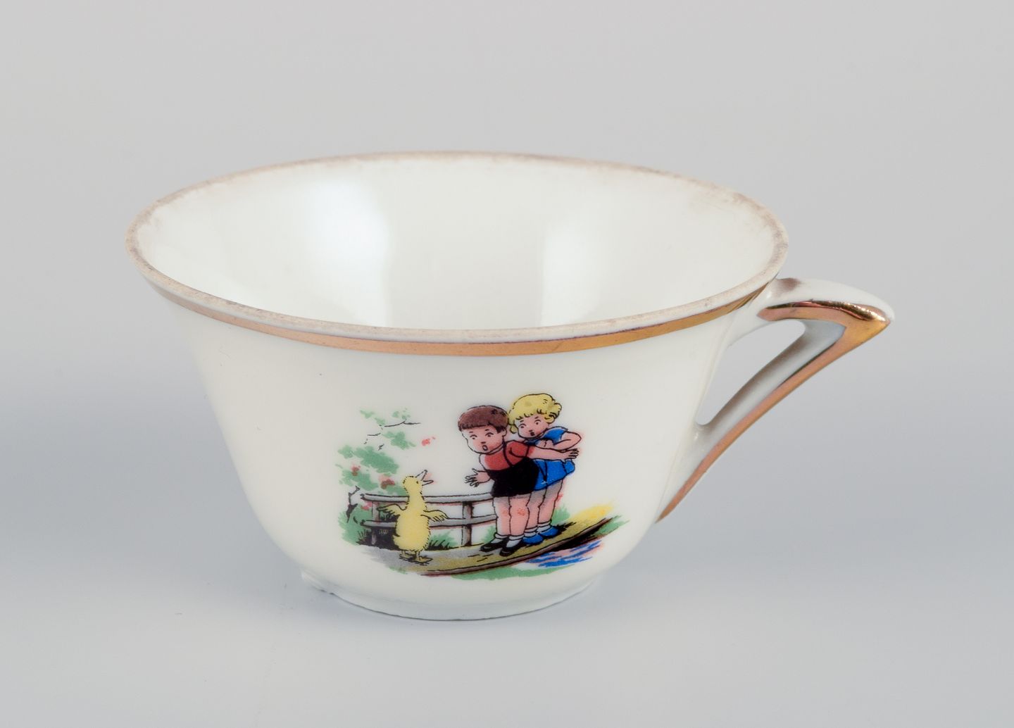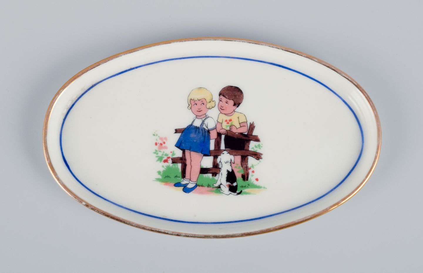 Limoges, Digoin & Sarreguemines, France. Childrens porcelain dinnerware consisting of a plate, two small dishes, and a cup.