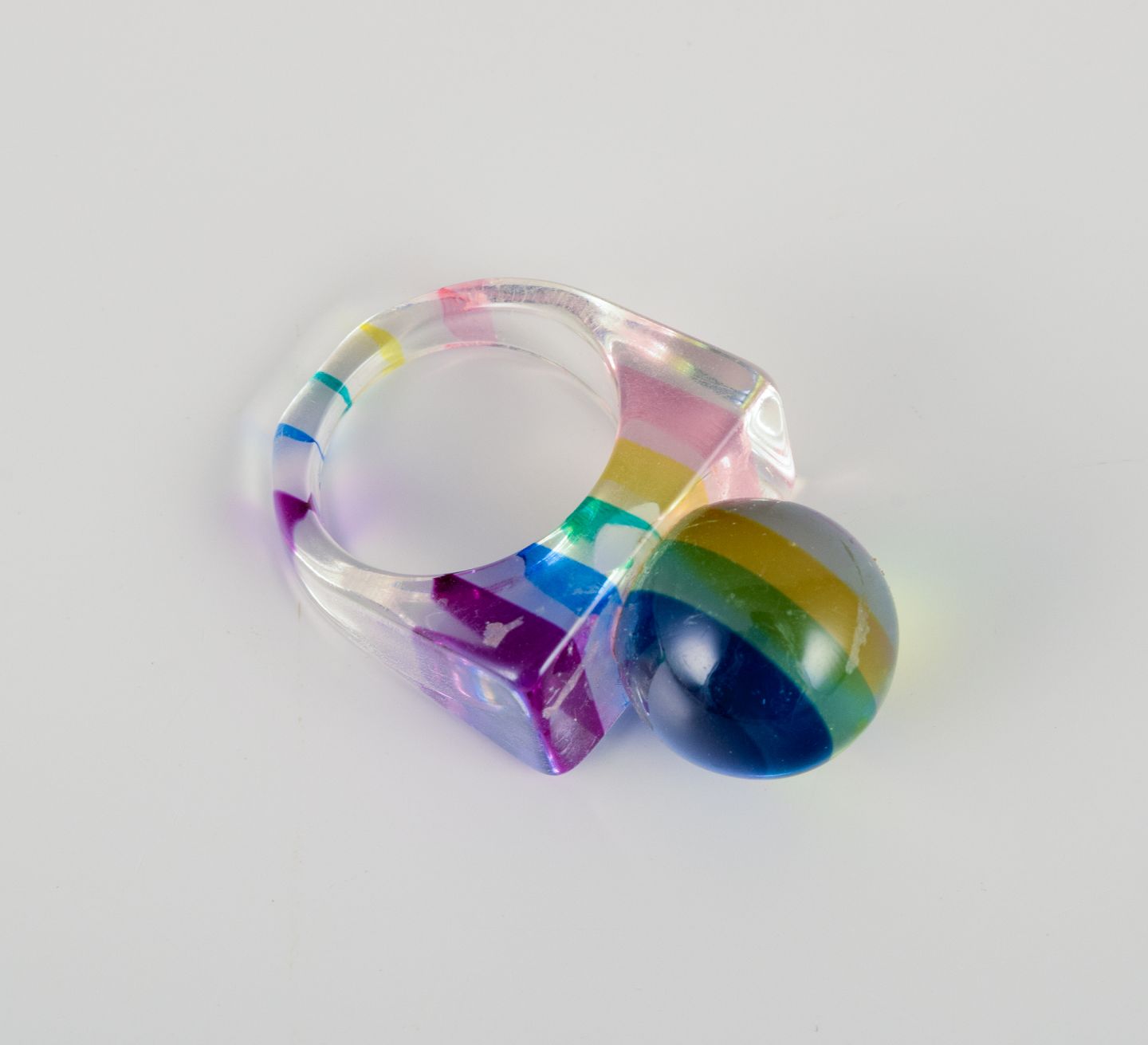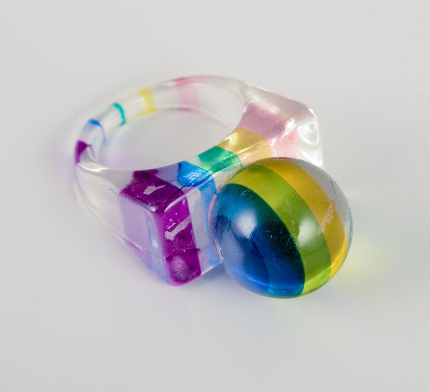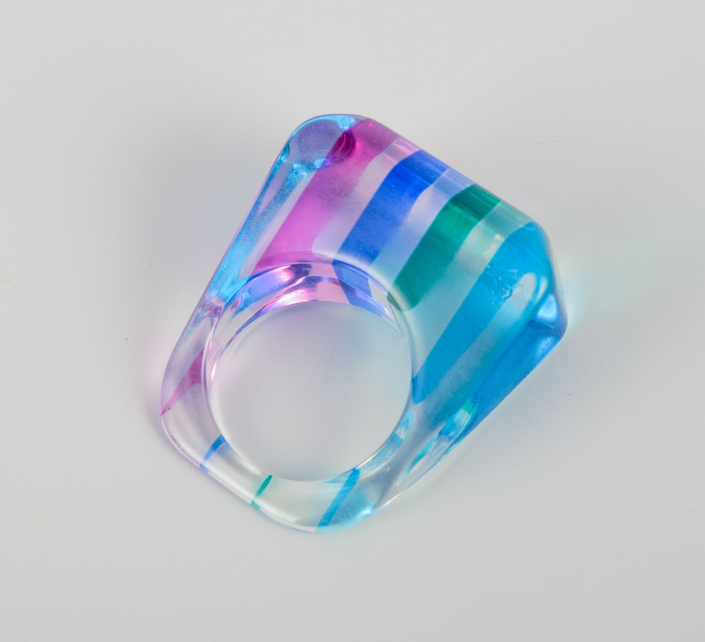 Fransk smykkekunstner. Fem designerringe i plast. Stribet design med forskellige farver. 1960/70’erne. I flot stand. Mål: 16 mm. – 18 mm.