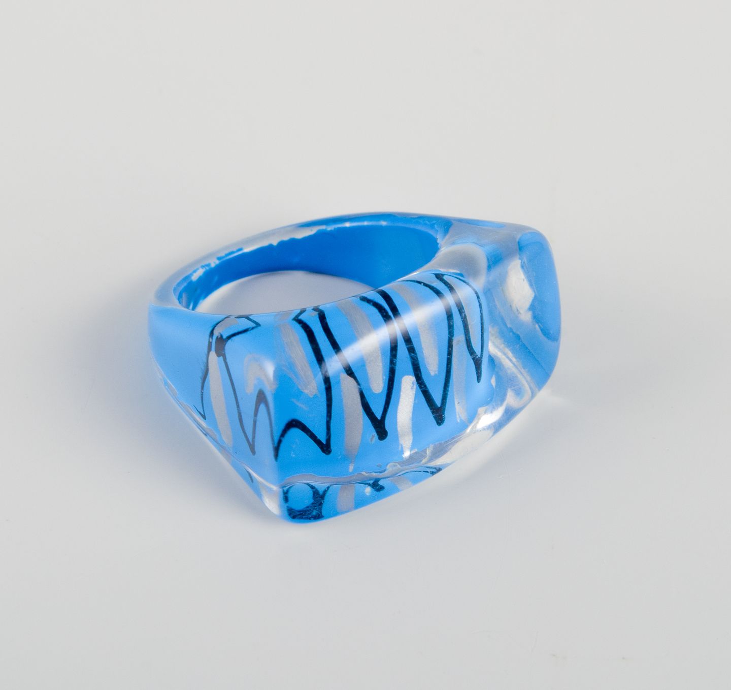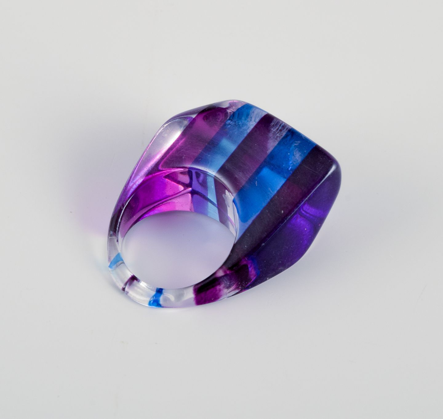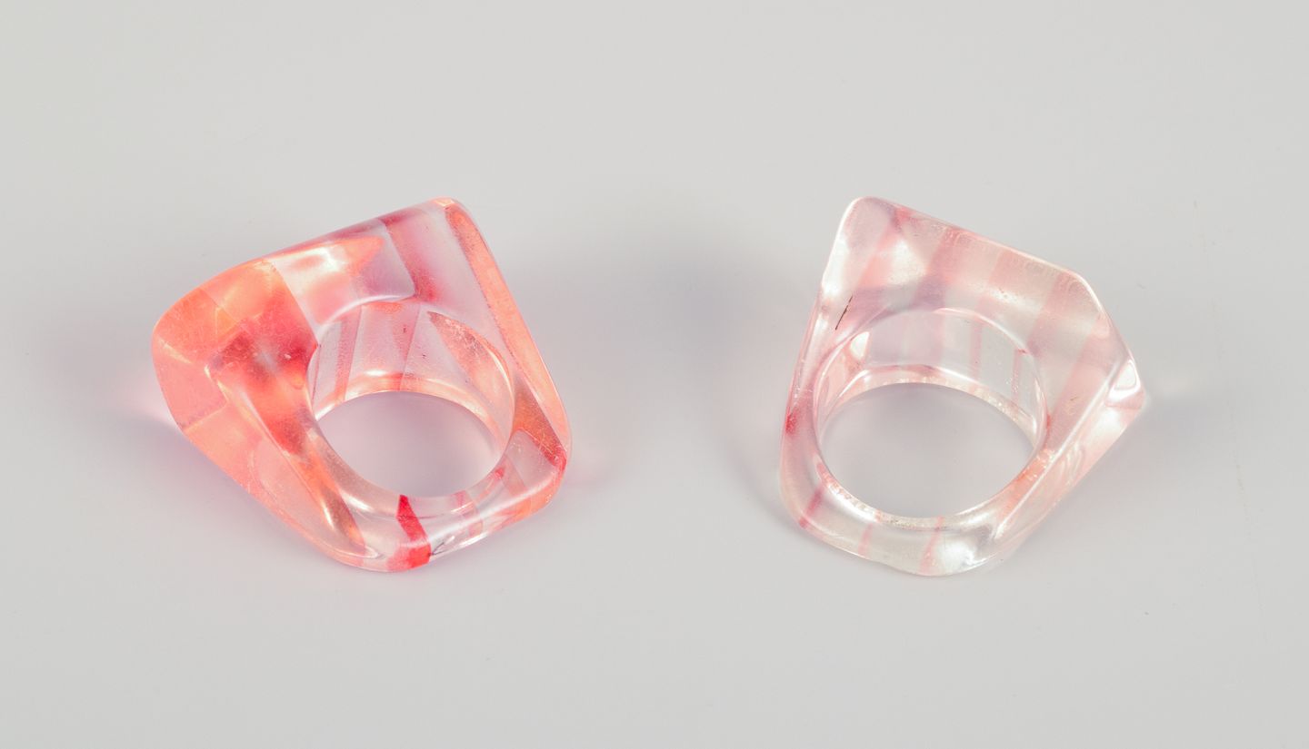 Fransk smykkekunstner. Fem designerringe i plast. Stribet design med forskellige farver. 1960/70’erne. I flot stand. Mål: D 15,5 mm. – 18,0 mm.