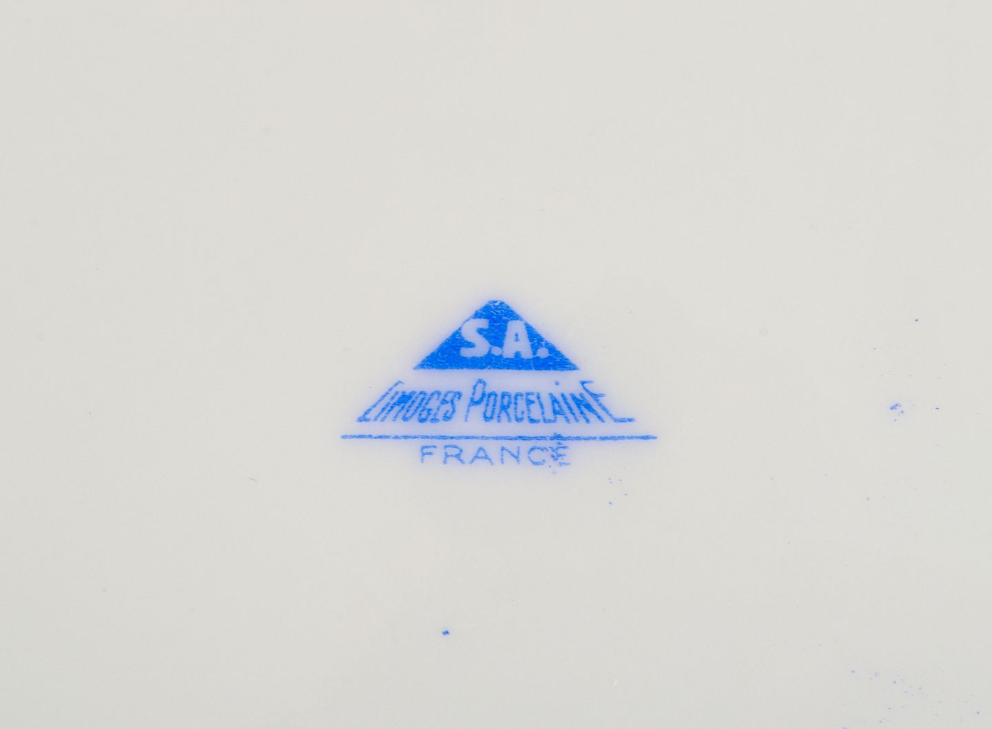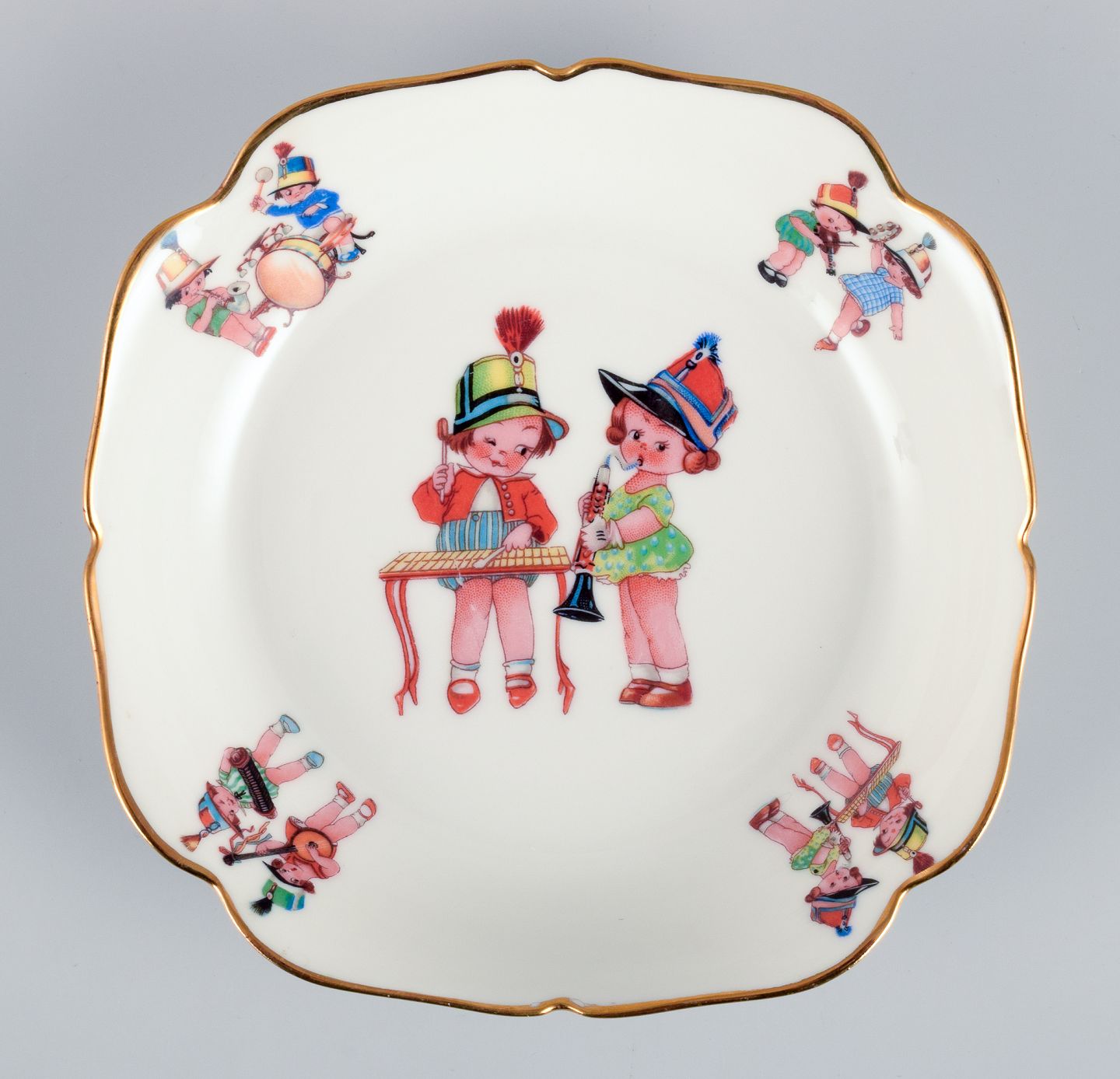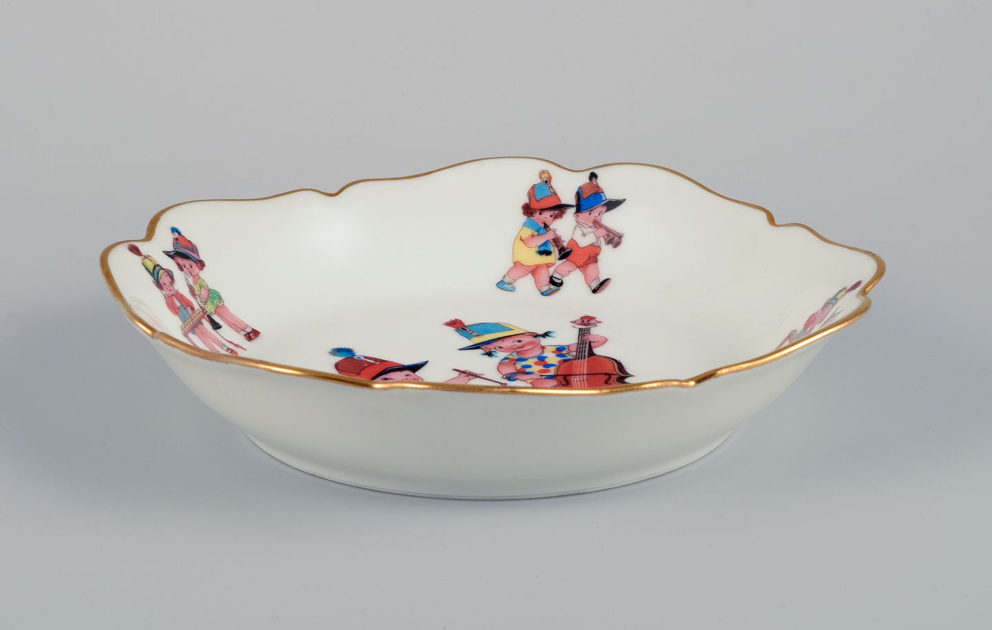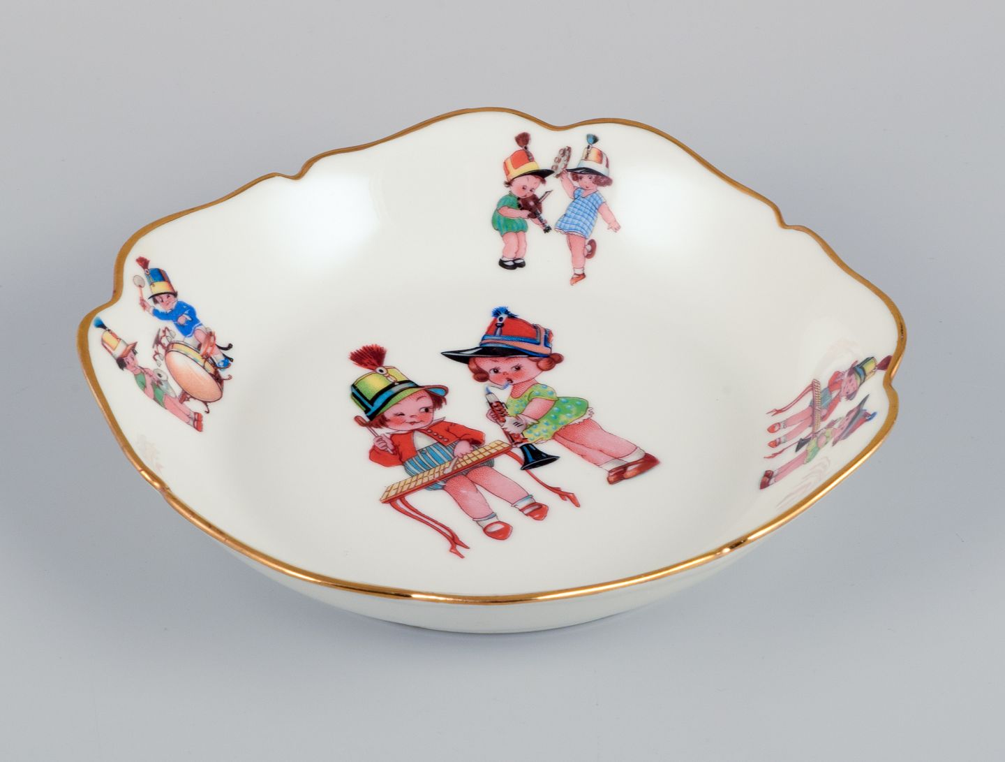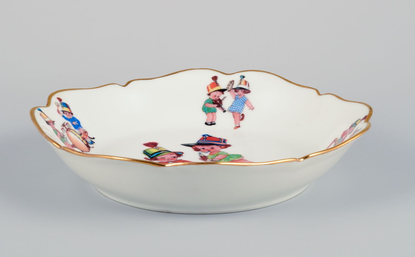 Limoges, France. Two deep childrens plates in porcelain. Gold rim. Motifs of child musicians. 1930s/40s. Marked. Perfect condition. Dimensions: D 18.0 cm x H 3.5 cm.