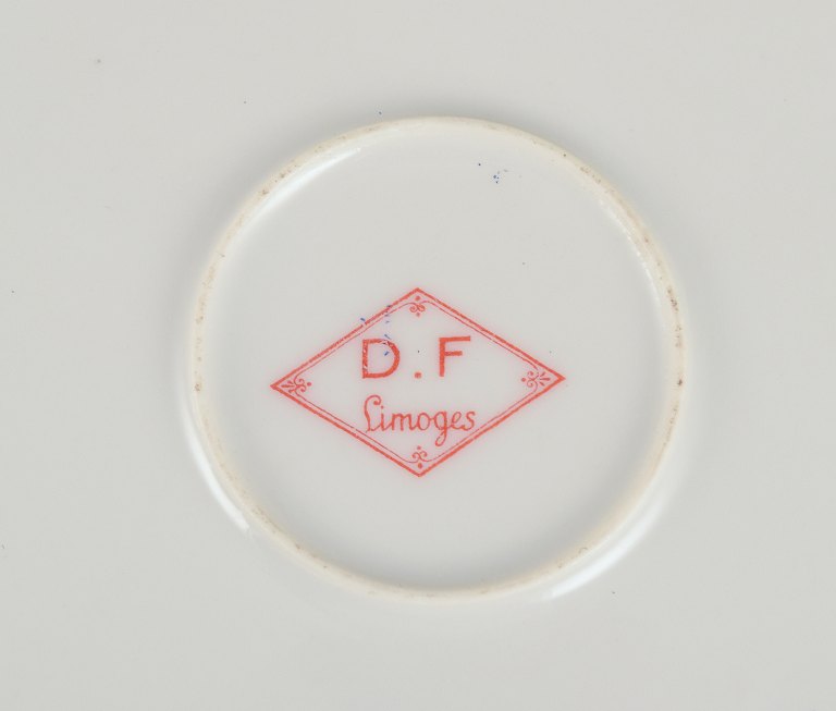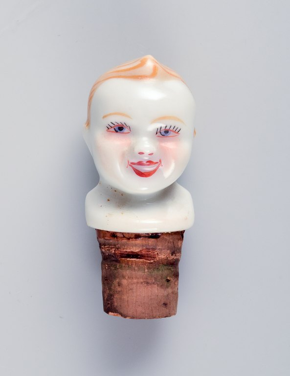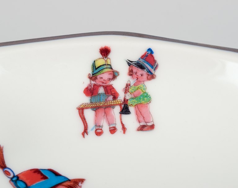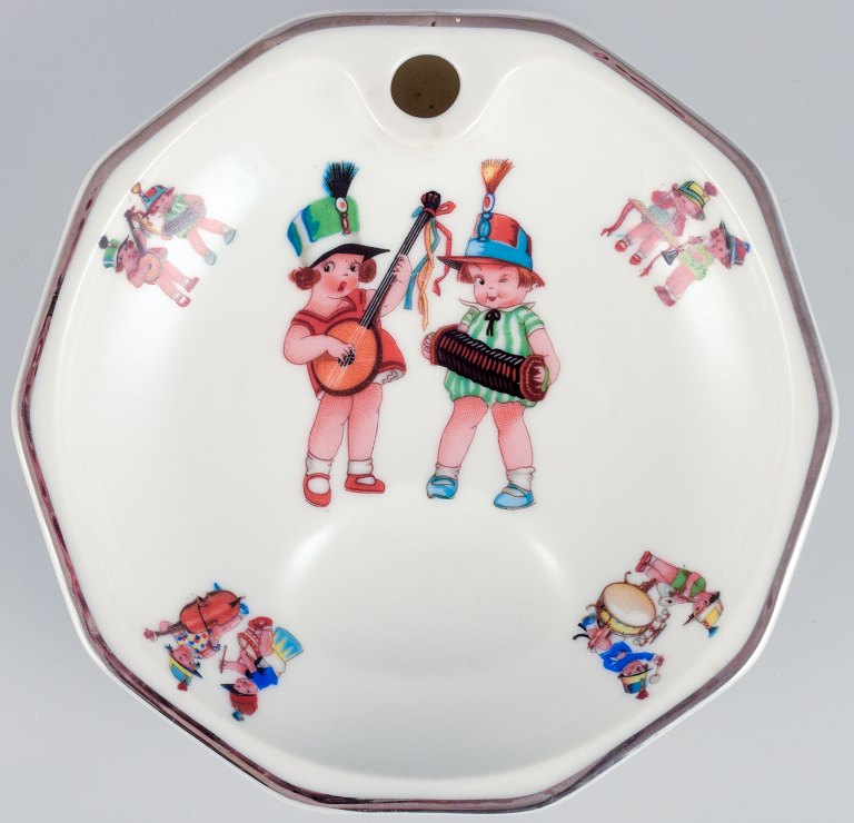 D.F. Limoges, France. Porcelain baby warming bowl. Stopper with a childs face. Silver rim. Motifs of child musicians.