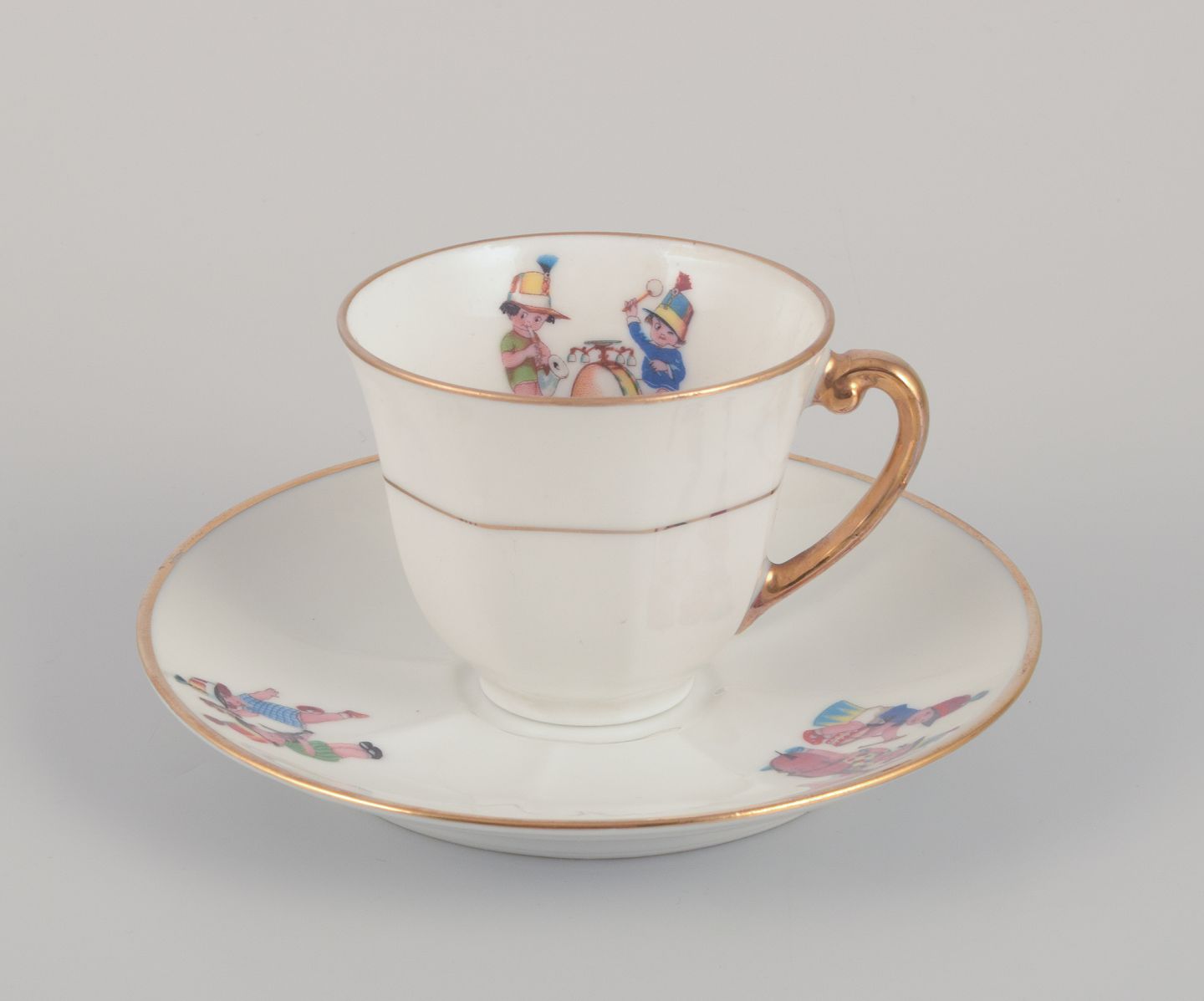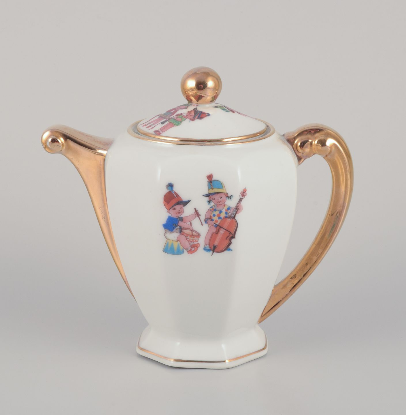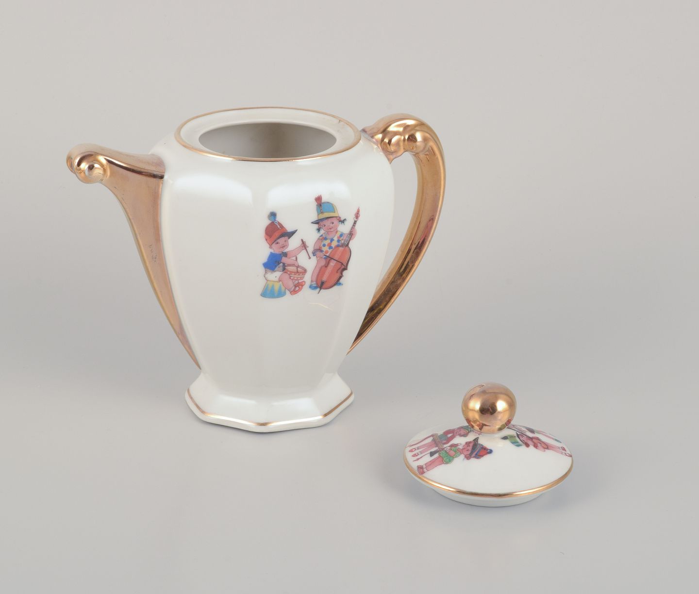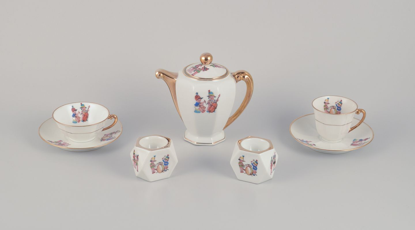 Coffee pot, teacup, and a coffee cup with saucers, as well as two egg cups in porcelain. Motifs of child musicians.