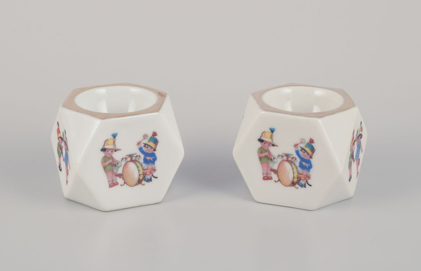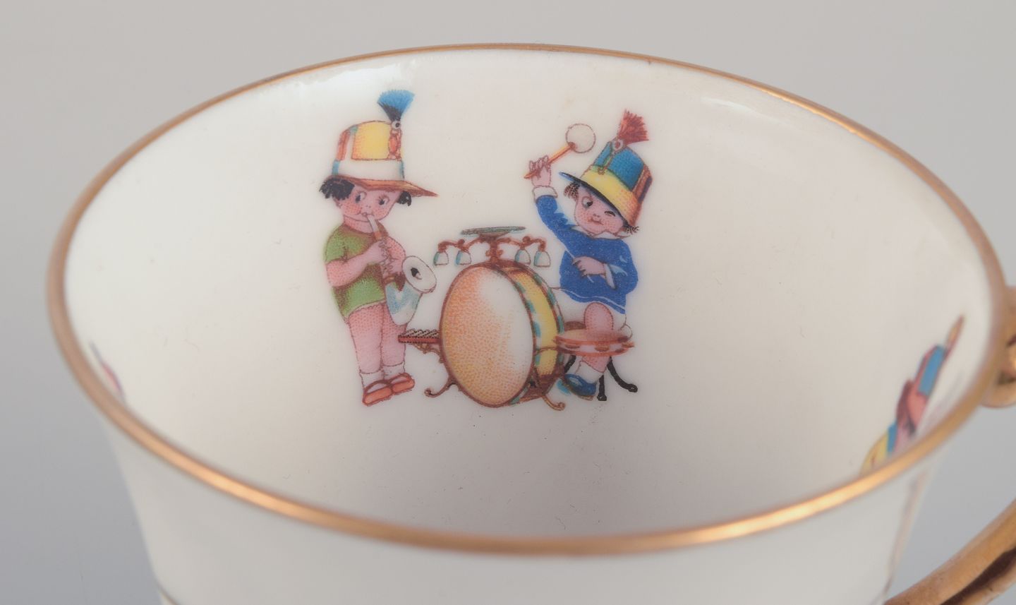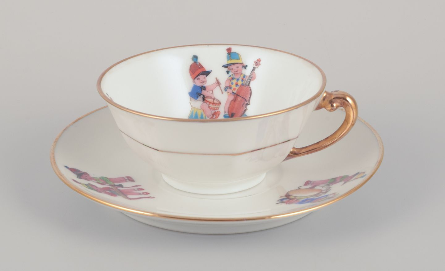 Coffee pot, teacup, and a coffee cup with saucers, as well as two egg cups in porcelain. Motifs of child musicians.