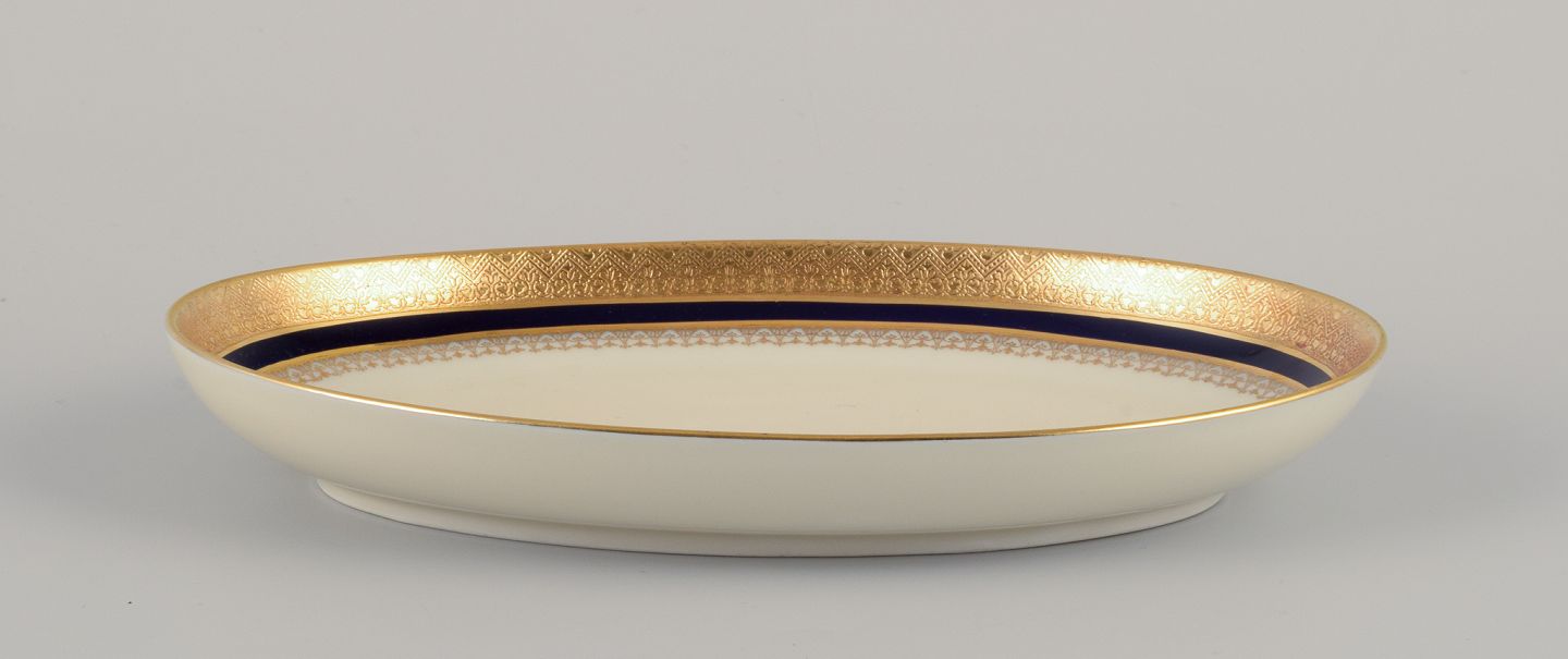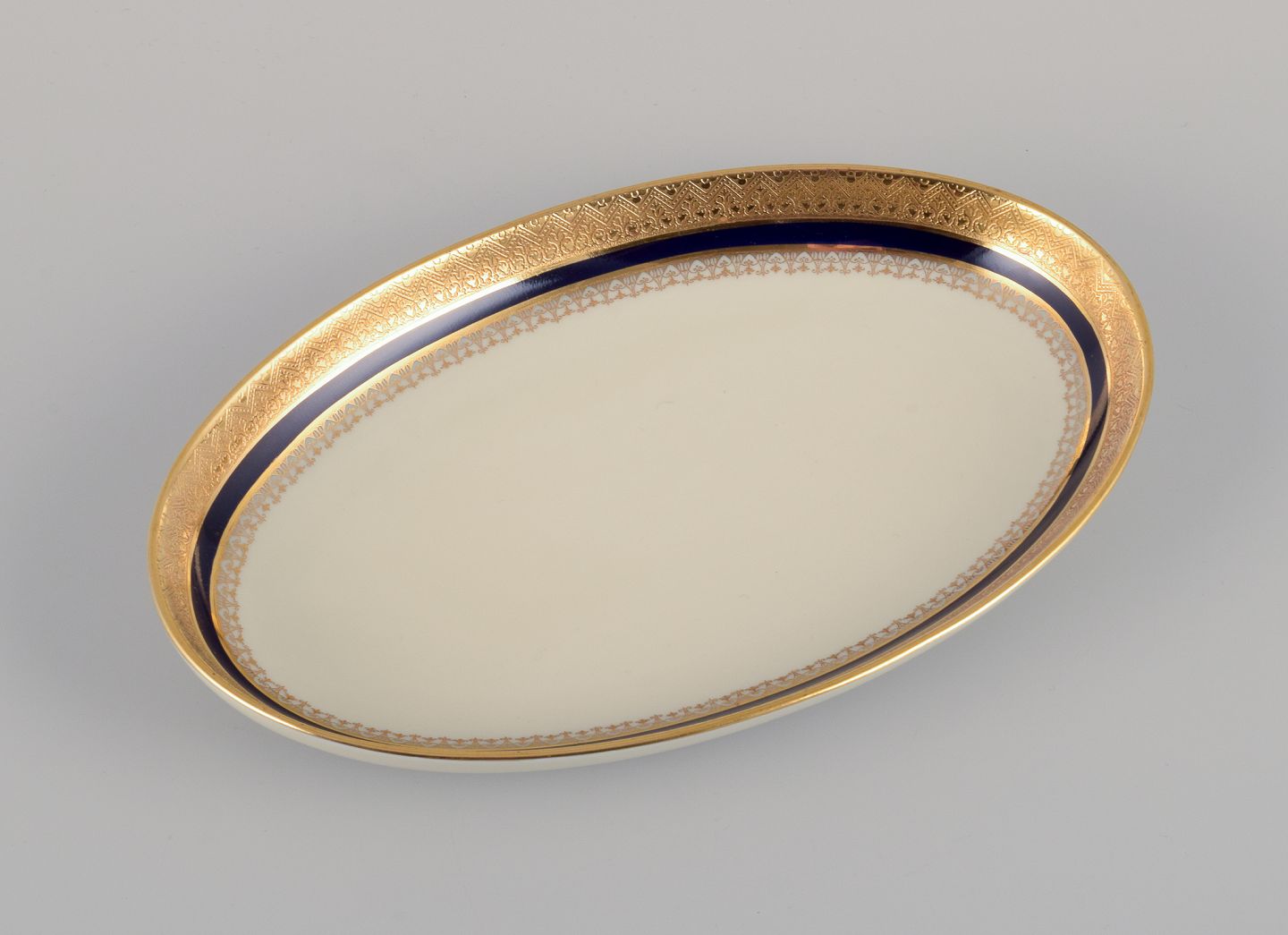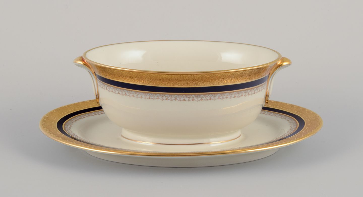 Hutschenreuther, Tyskland. To fade samt saucekande fra serien ”Margarete”. Hånddekoreret med guld og kongeblå.