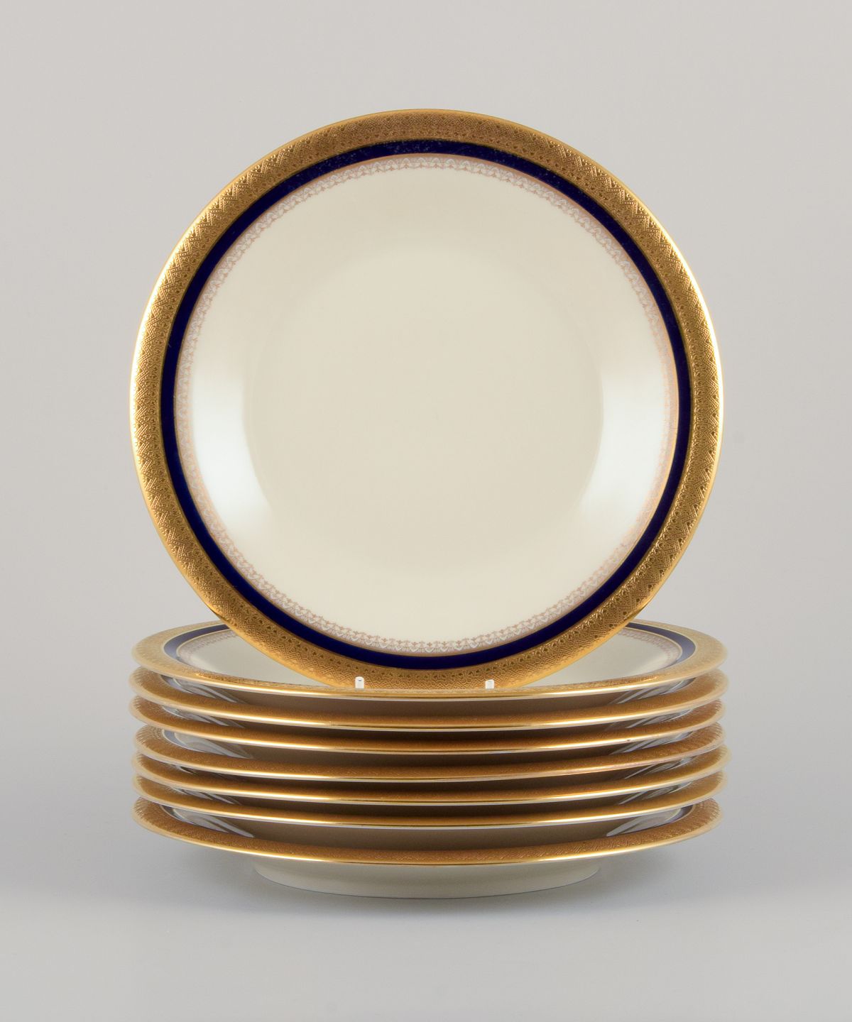 Hutschenreuther, Tyskland. Otte middagstallerkner fra serien ”Margarete”. Hånddekoreret med guld og kongeblå.