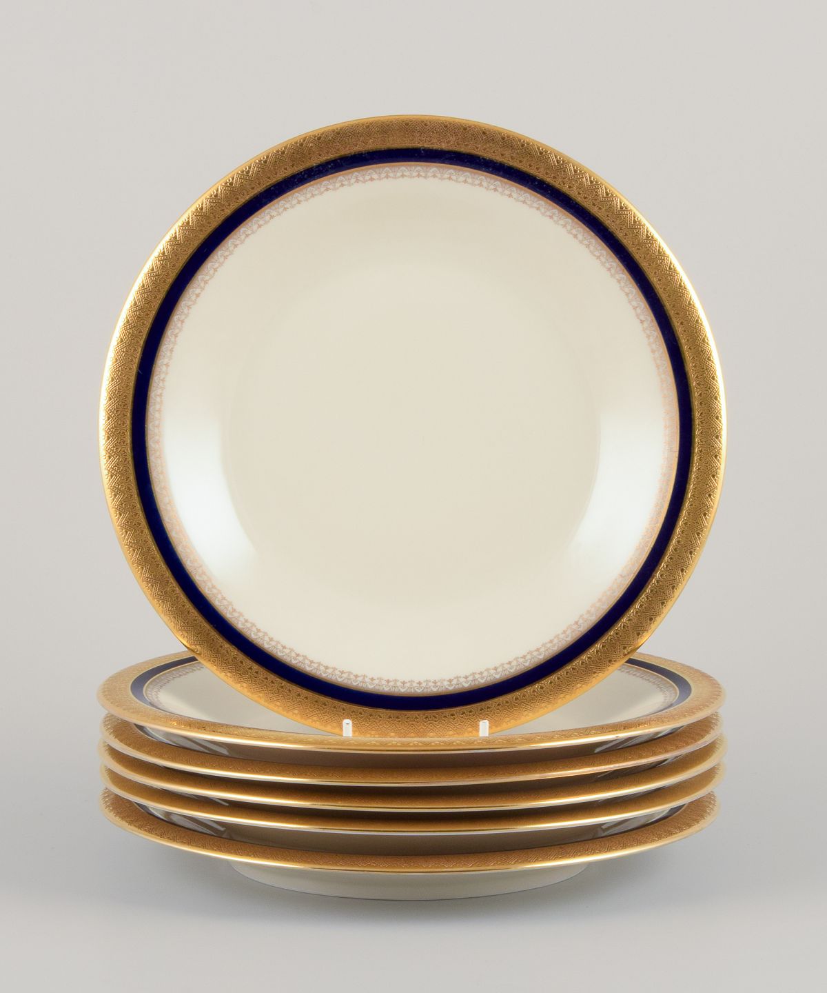 Hutschenreuther, Tyskland. Seks middagstallerkner fra serien ”Margarete”. Hånddekoreret med guld og kongeblå.