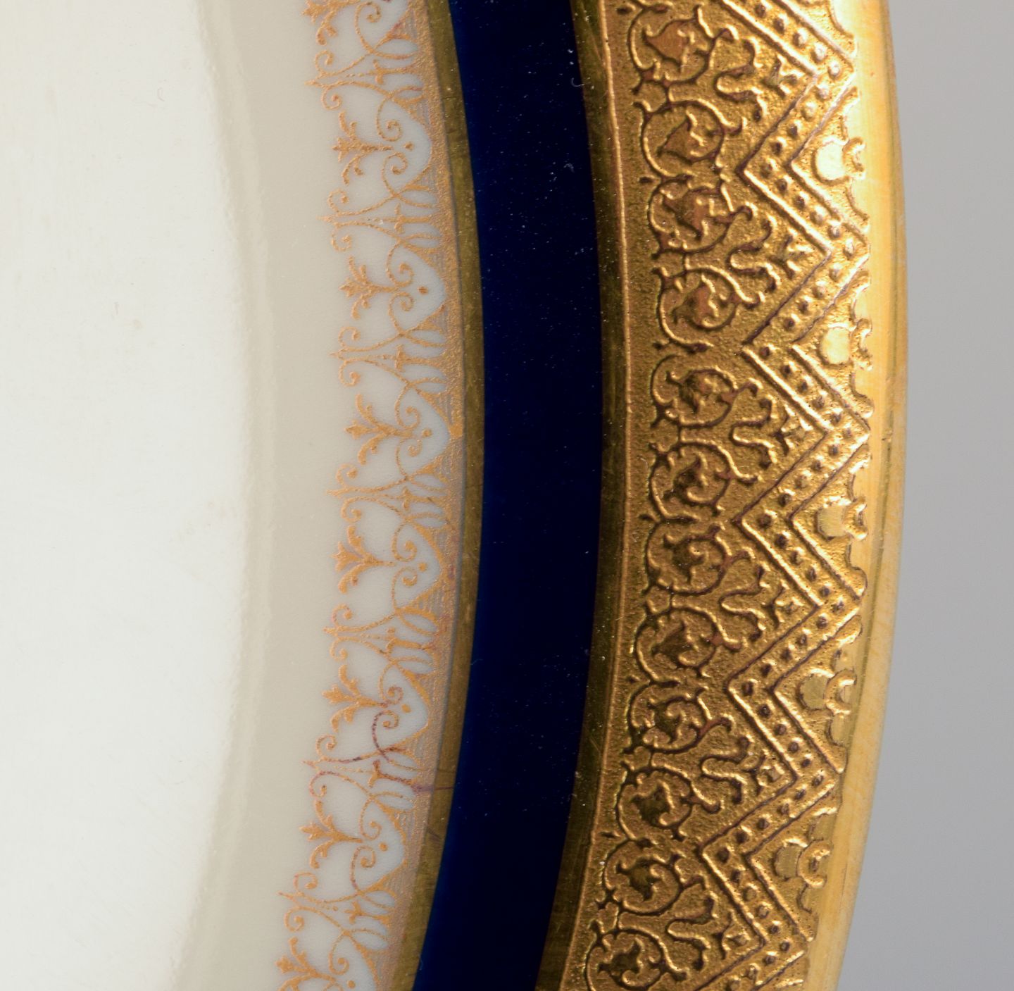 Hutschenreuther, Germany. Six dinner plates from the "Margarete" series. Hand-decorated with gold and royal blue.