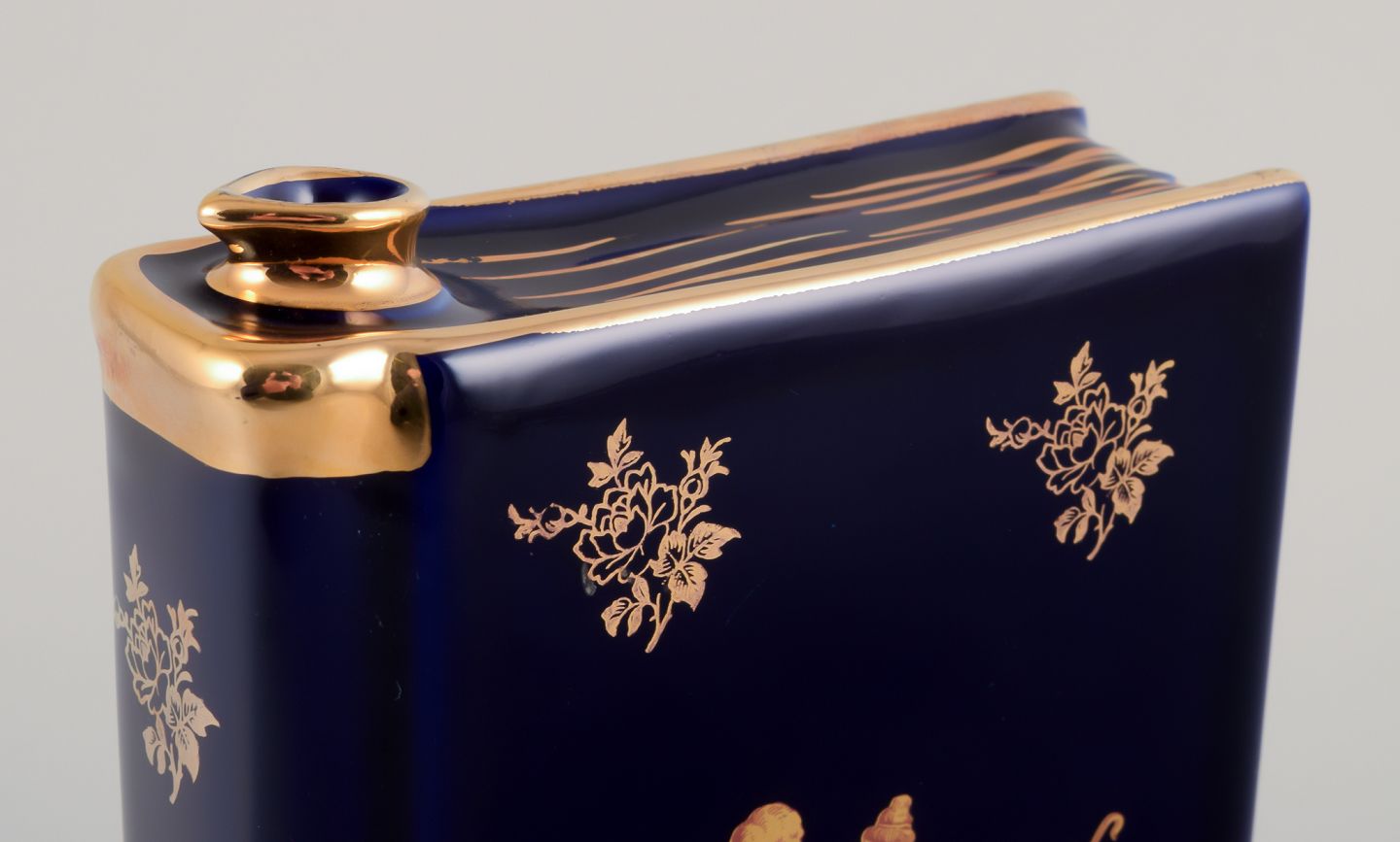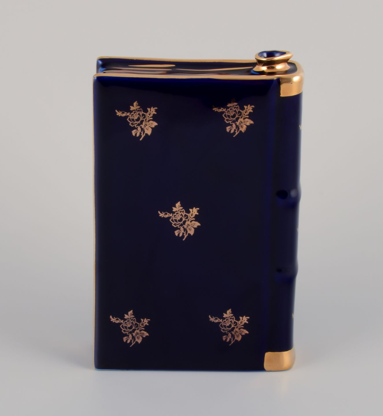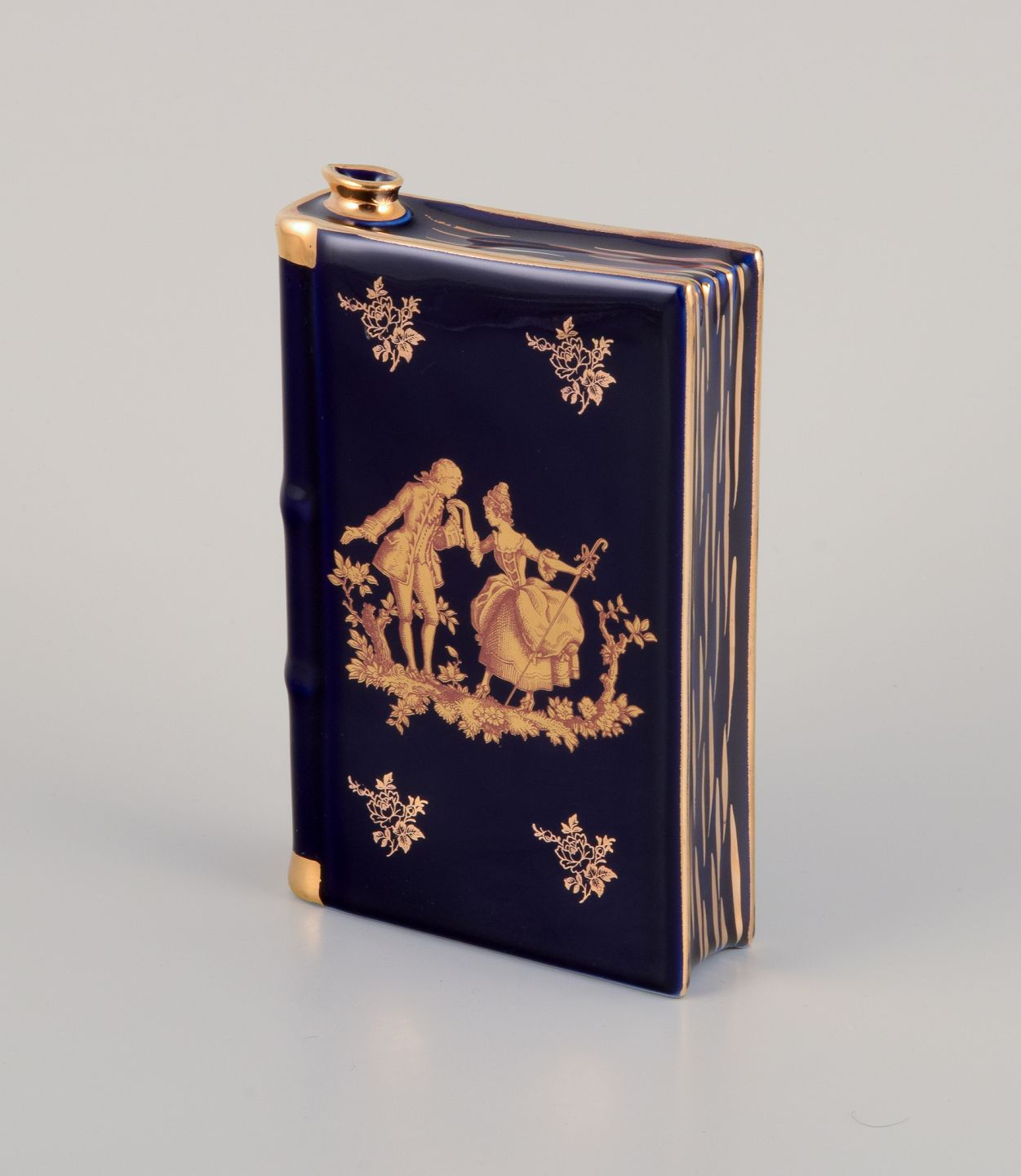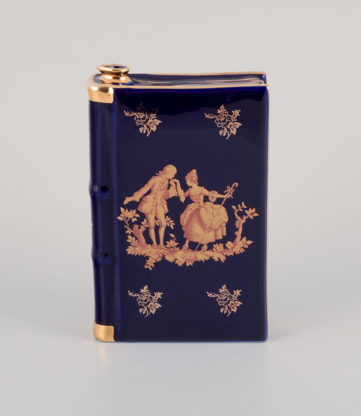 Limoges, Frankrig. ”Lommelærke” i porcelæn udformet som bog dekoreret i 22-karat bladguld og smuk kongeblå glasur. Scène galante.
